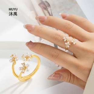 高级感春日珍珠花朵开口戒可调节小众时尚食指戒真金电镀精致戒圈
