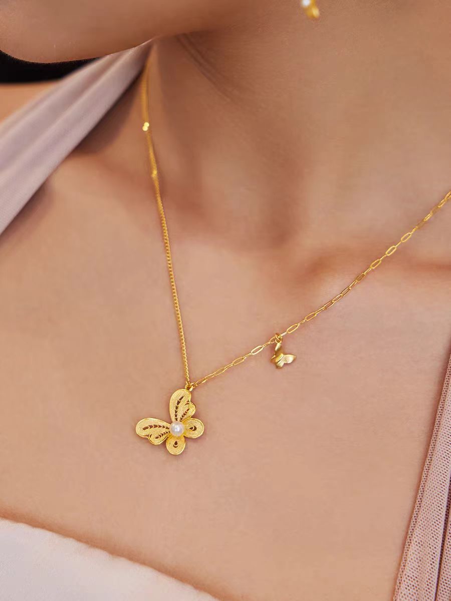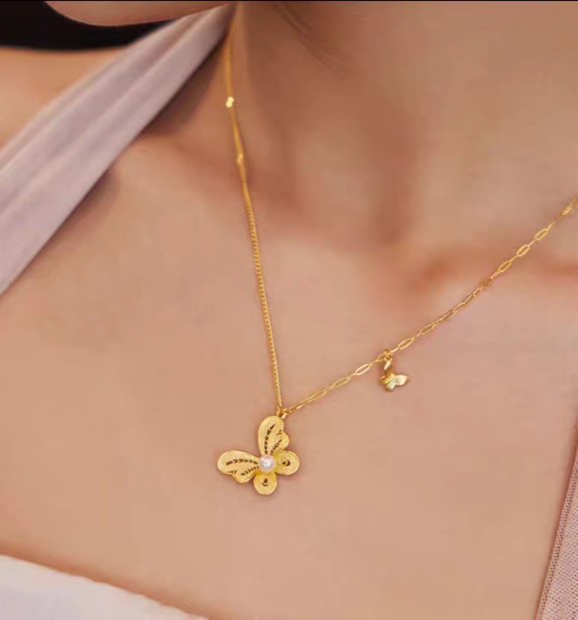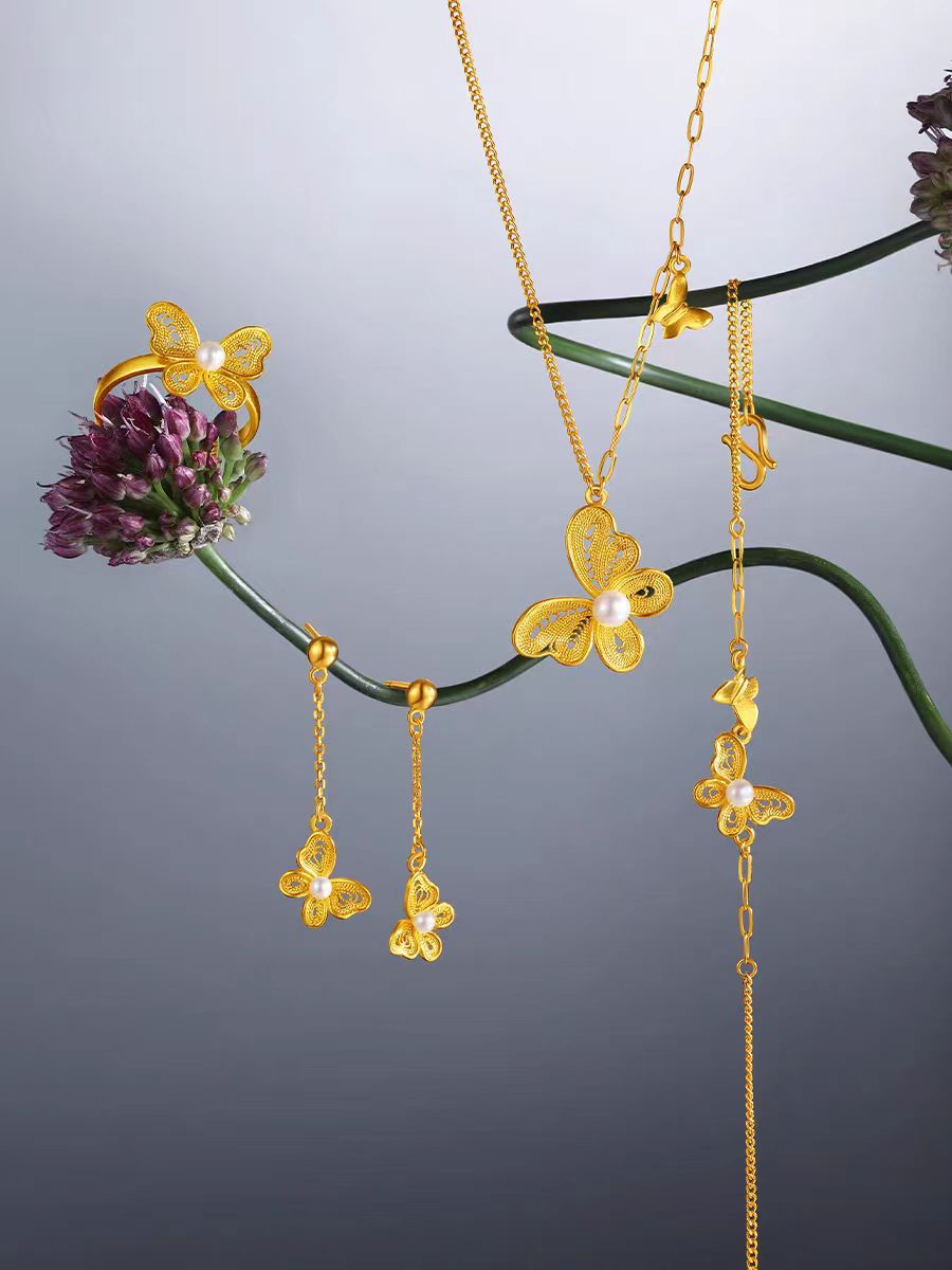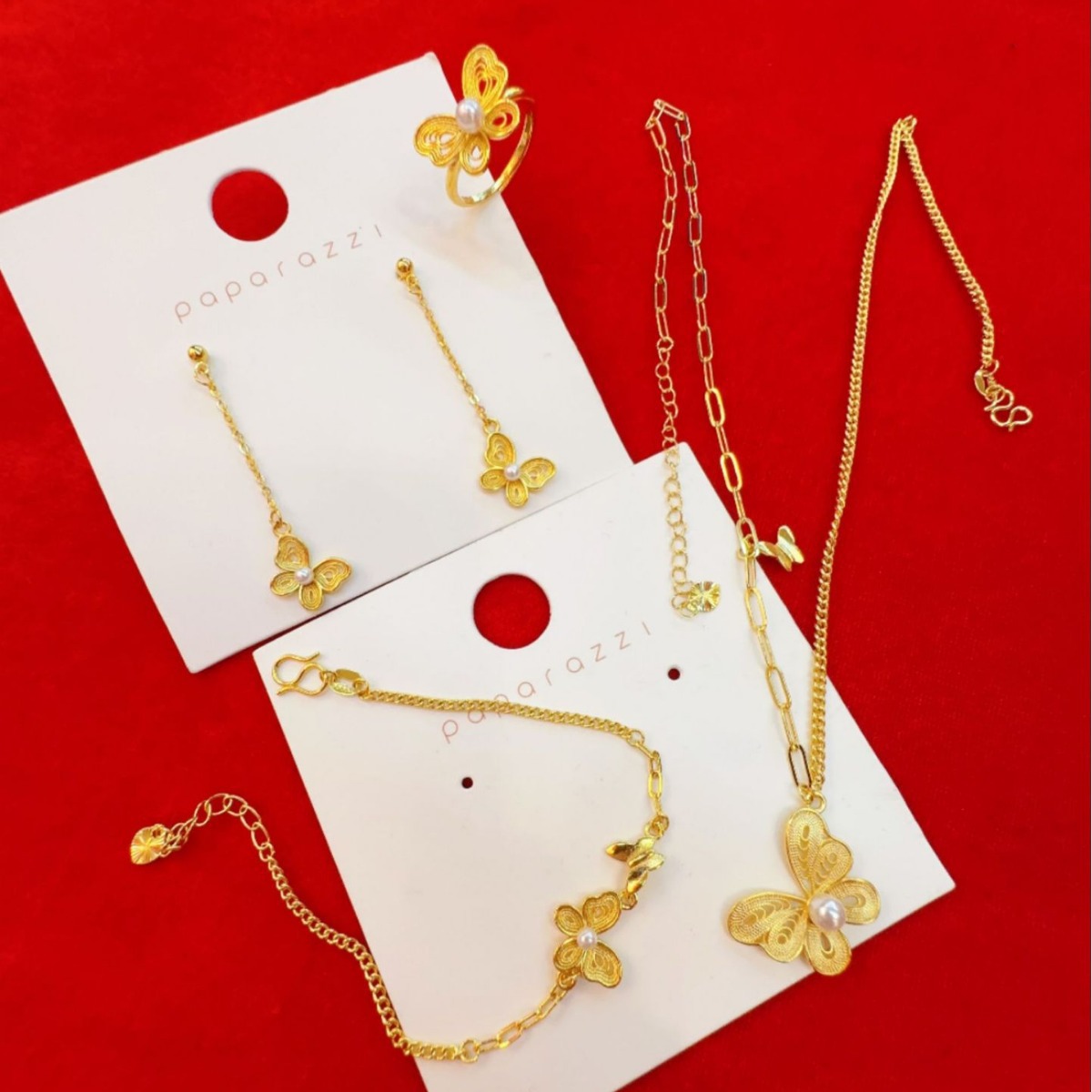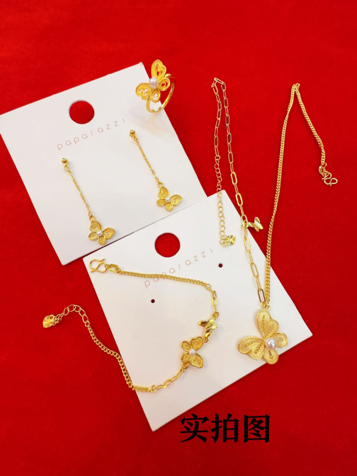 New Butterfly Love Flower Series Set Necklace Imitation Gold Butterfly Inlaid Shell Bead Bracelet Ring Butterfly Earrings Three-piece Set