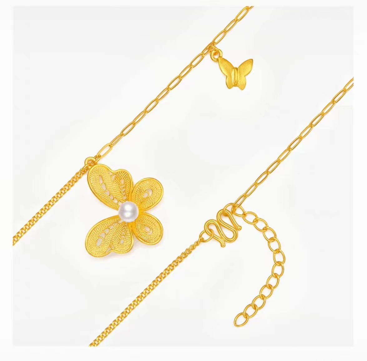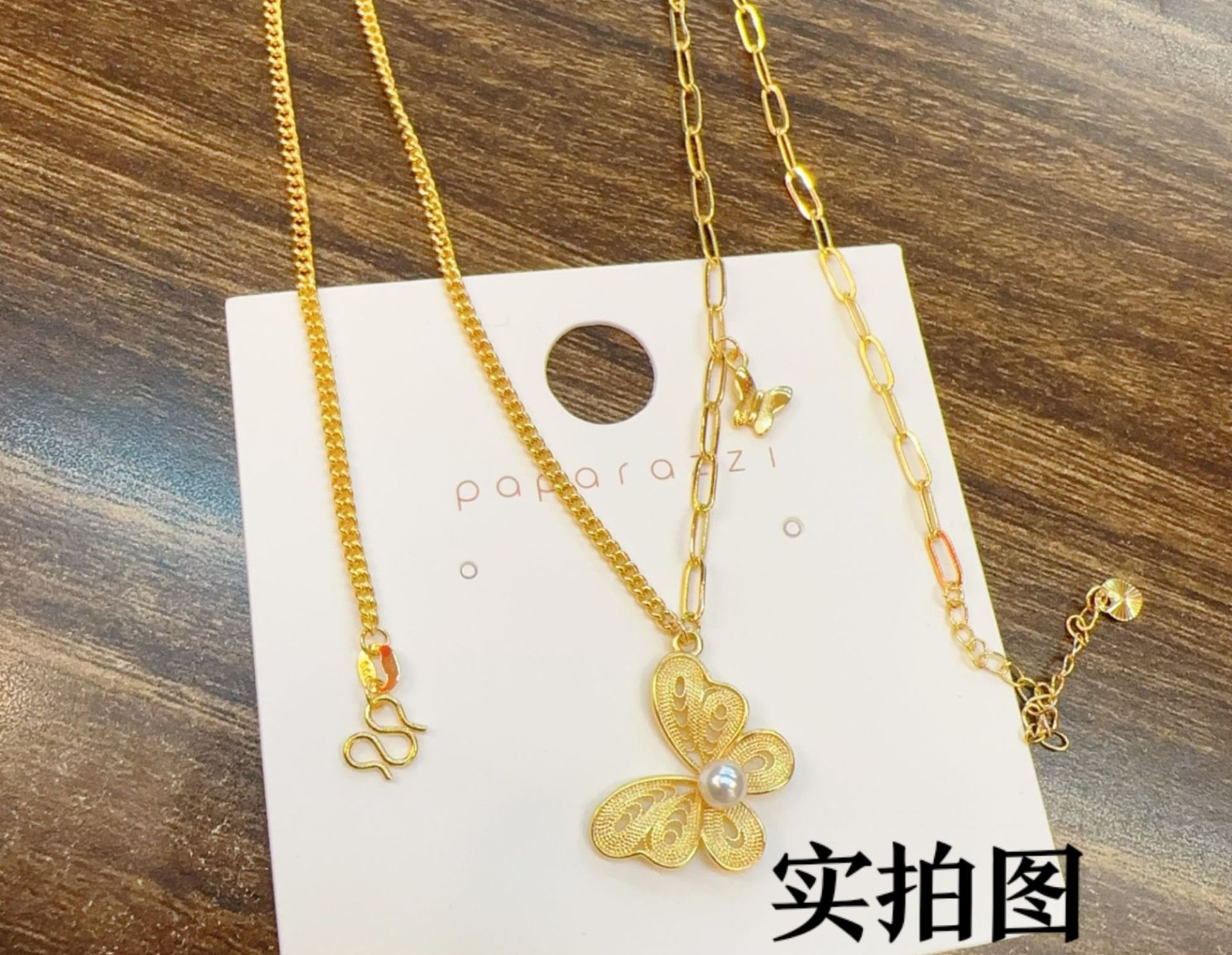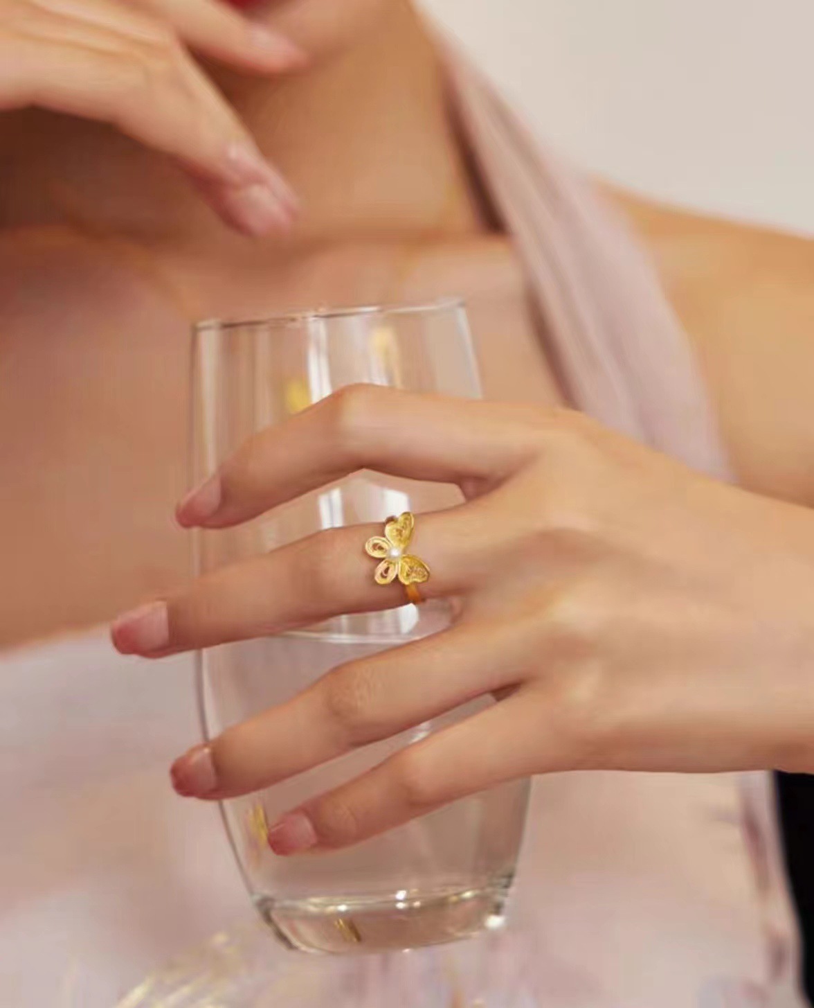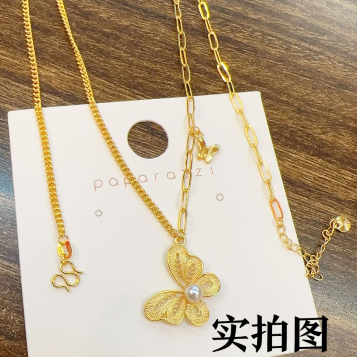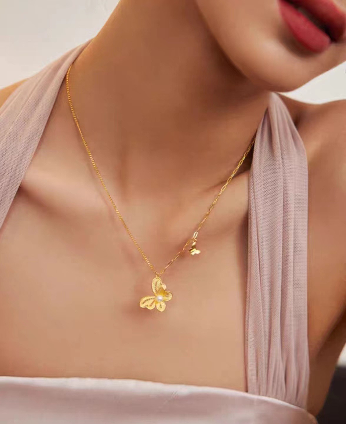 New Butterfly Love Flower Series Set Necklace Imitation Gold Butterfly Inlaid Shell Bead Bracelet Ring Butterfly Earrings Three-piece Set