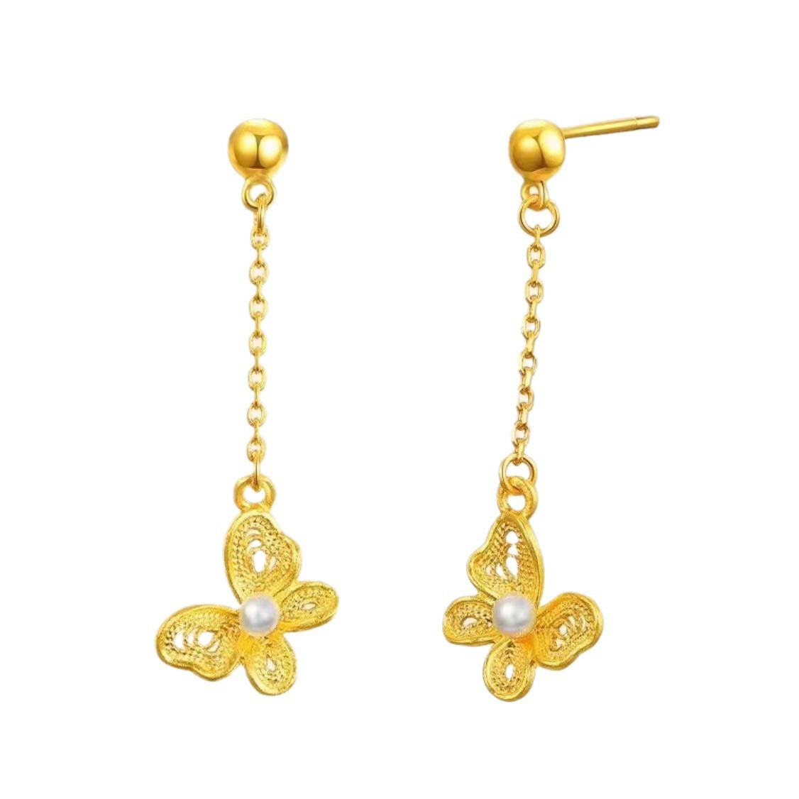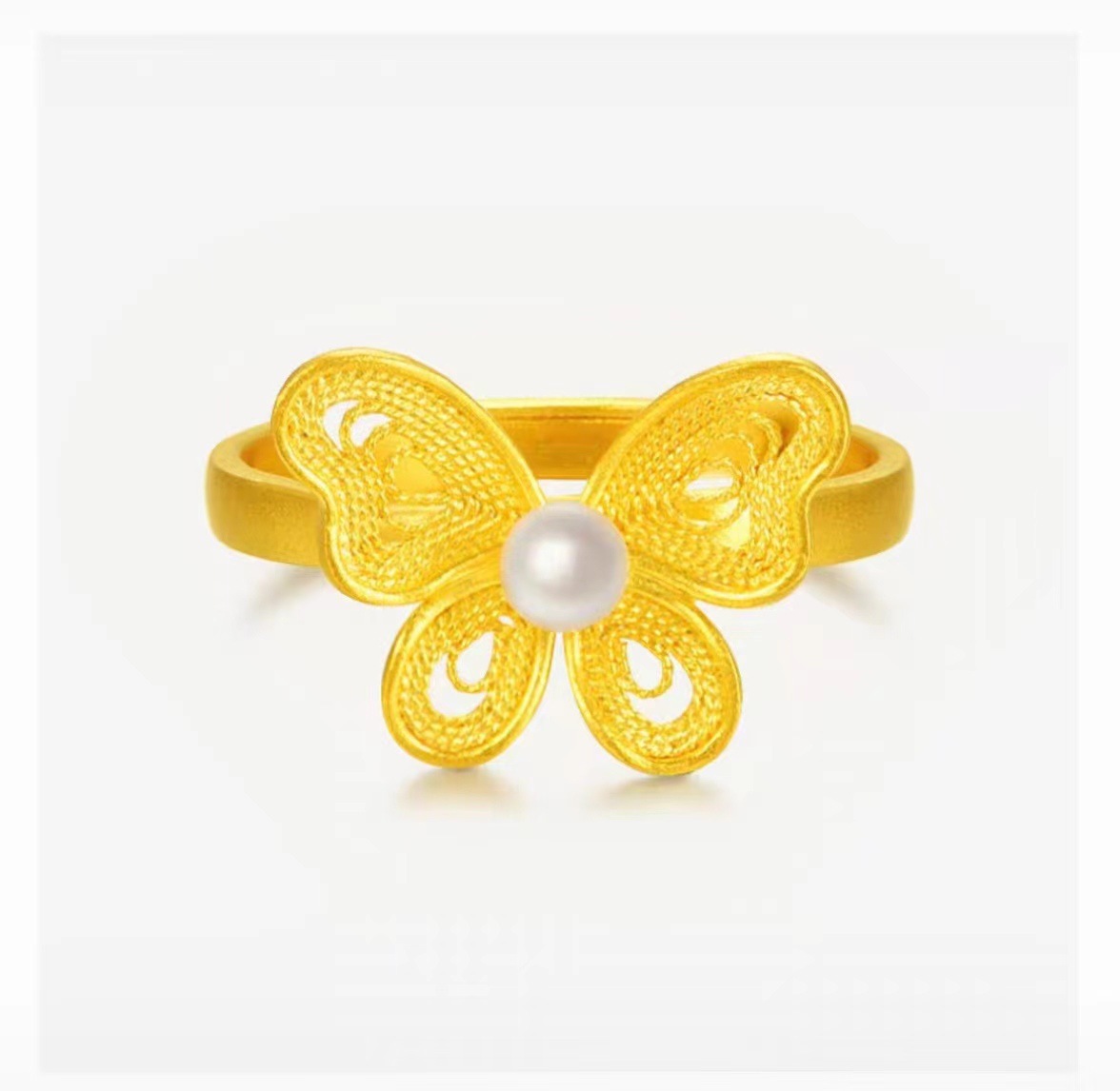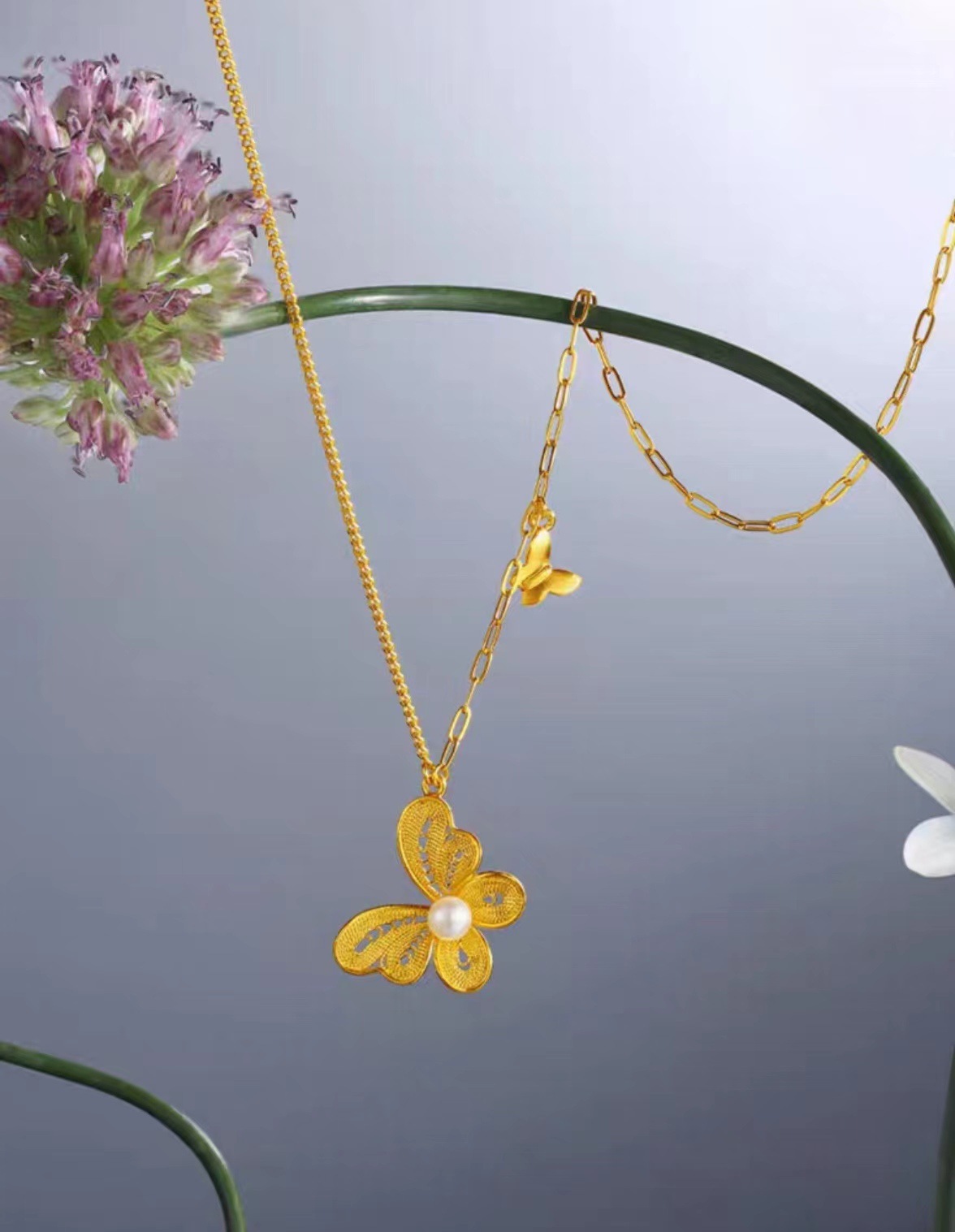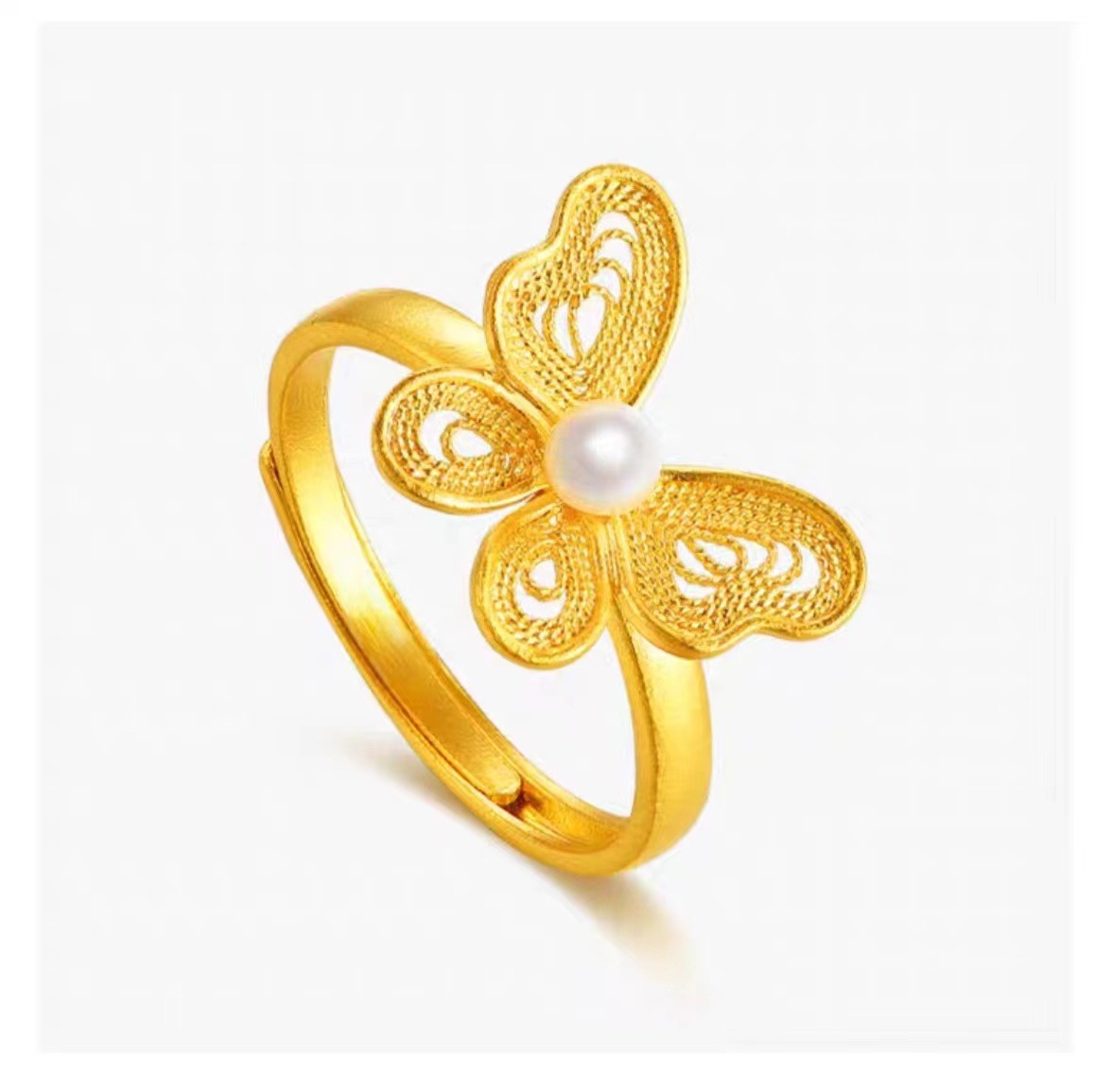 New Butterfly Love Flower Series Set Necklace Imitation Gold Butterfly Inlaid Shell Bead Bracelet Ring Butterfly Earrings Three-piece Set