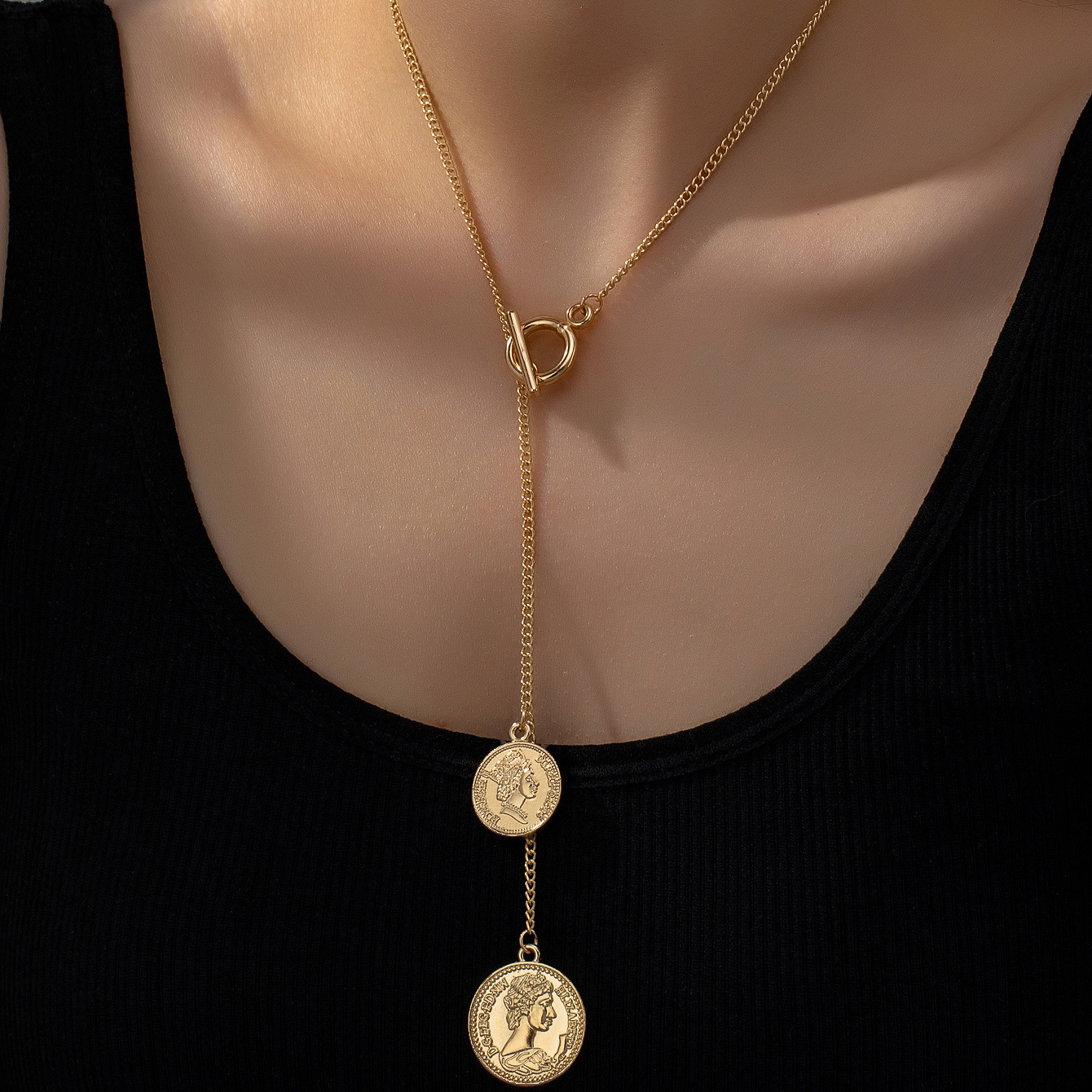 European and American Trendy Fashion Gold Geometric Pendant Necklace with a Round Disc Featuring a Head Portrait