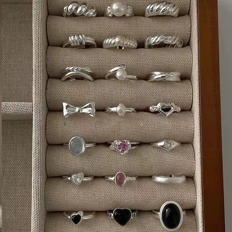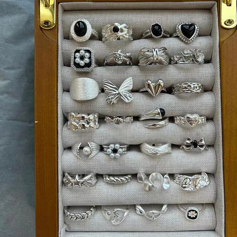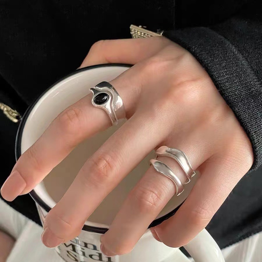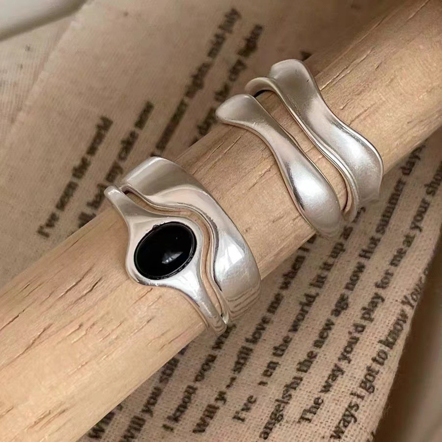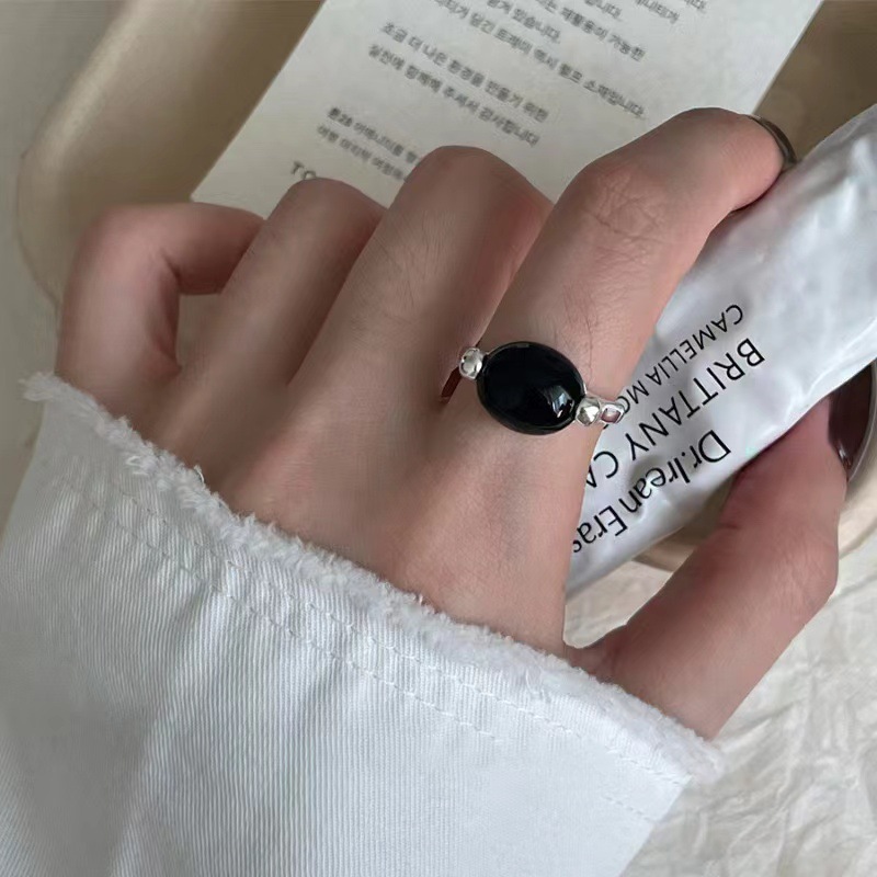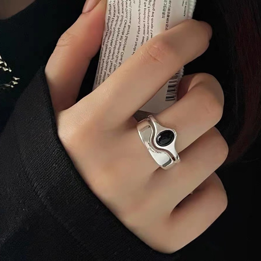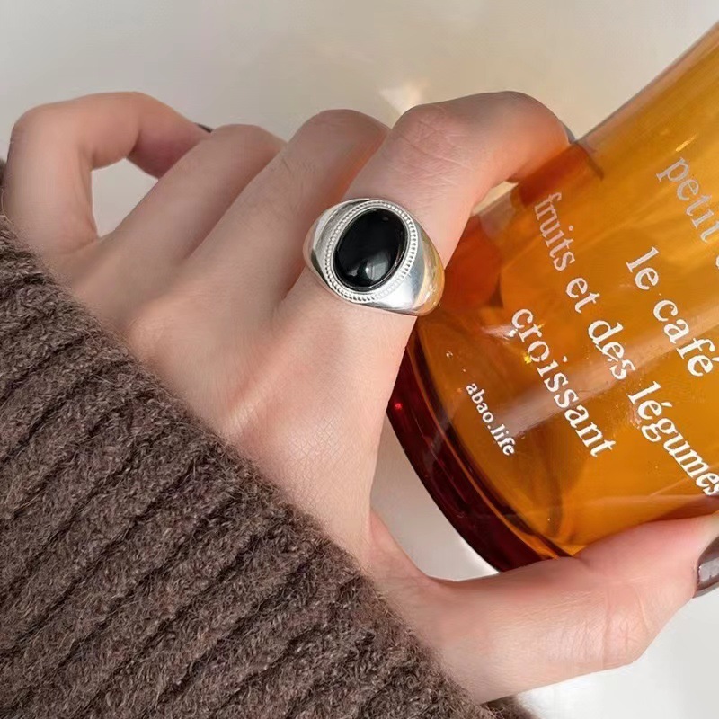 Light luxury heavy industry plain ring black agate ring women's niche retro high-end sense opening adjustable ring wholesale jewelry
