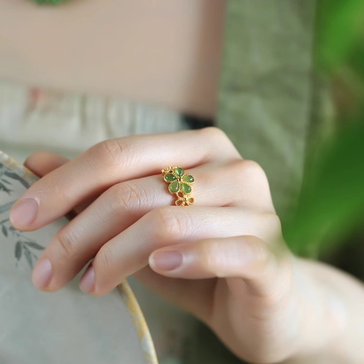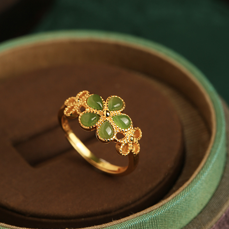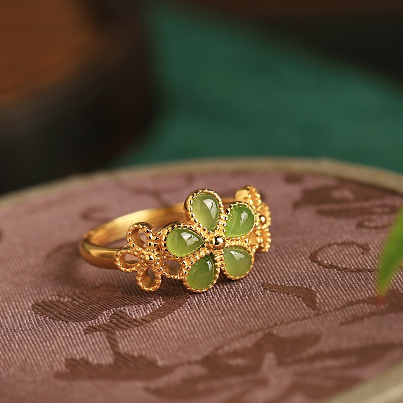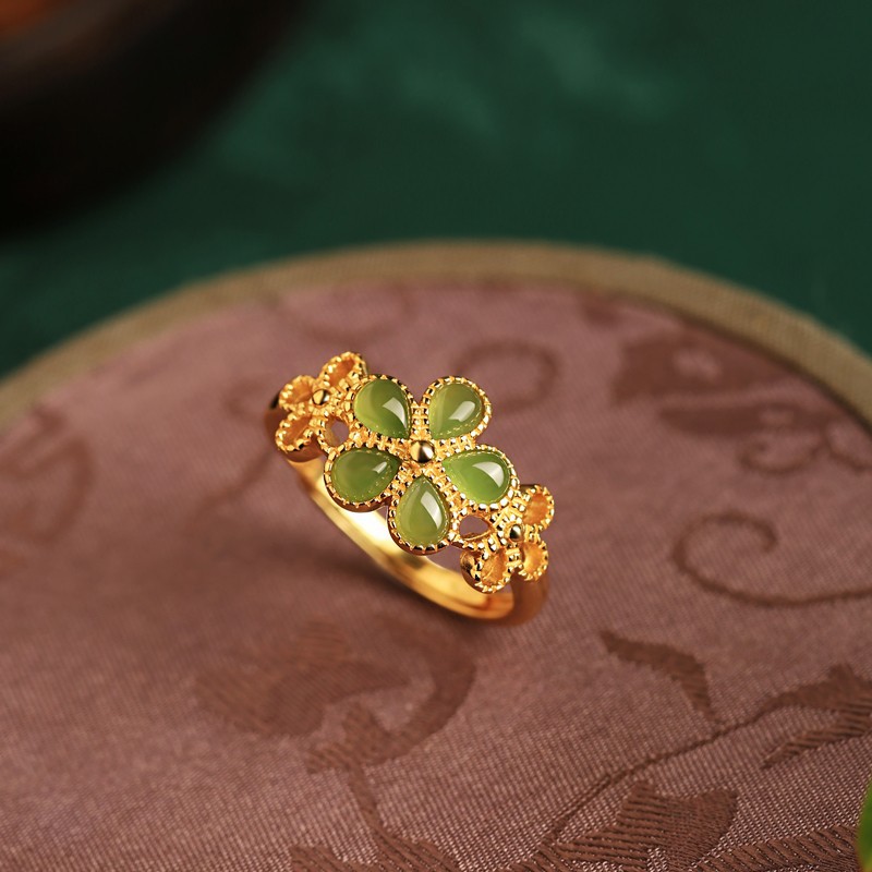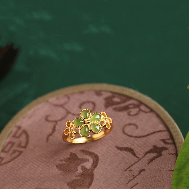 Artificial Hetian Jasper Copper Plated 18K Gold Mayflower Ring Women's New Chinese Style National Fashion Ring Jewelry