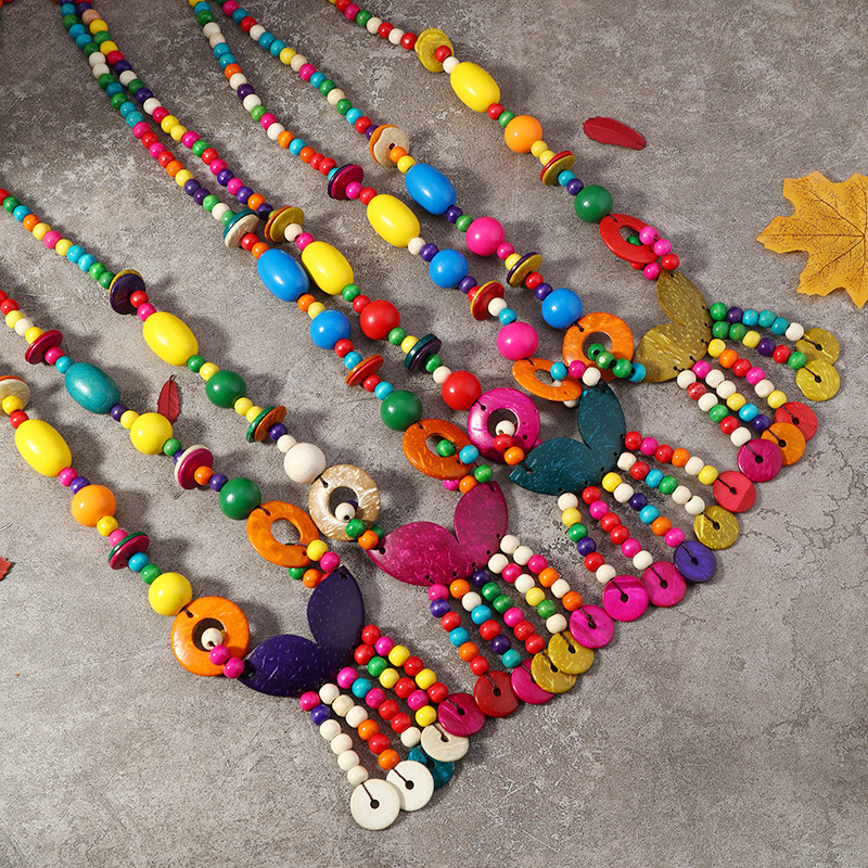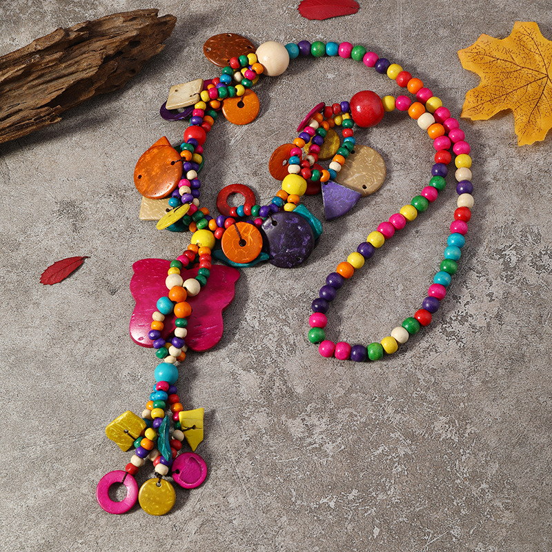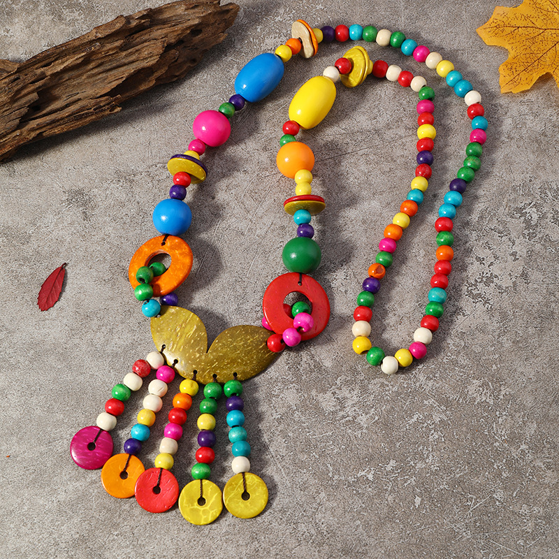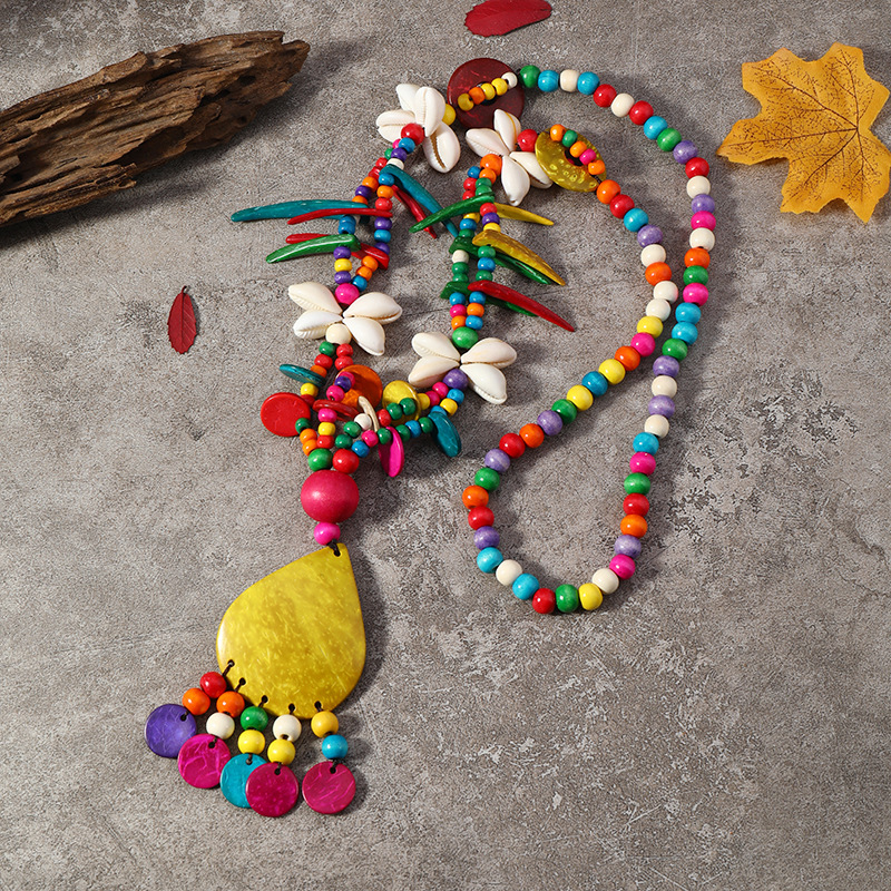 Bohemian Color Coconut Shell Necklace Holiday Style European and American Long Wooden Handmade Woolen Chain Women's Ethnic Style Accessories