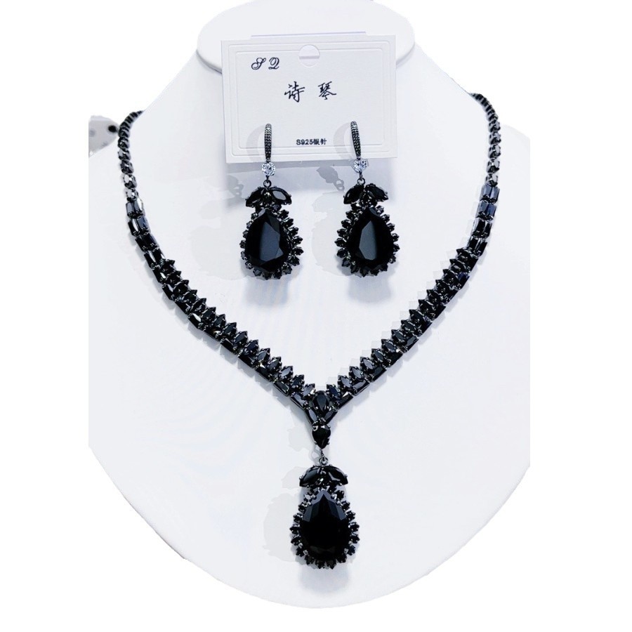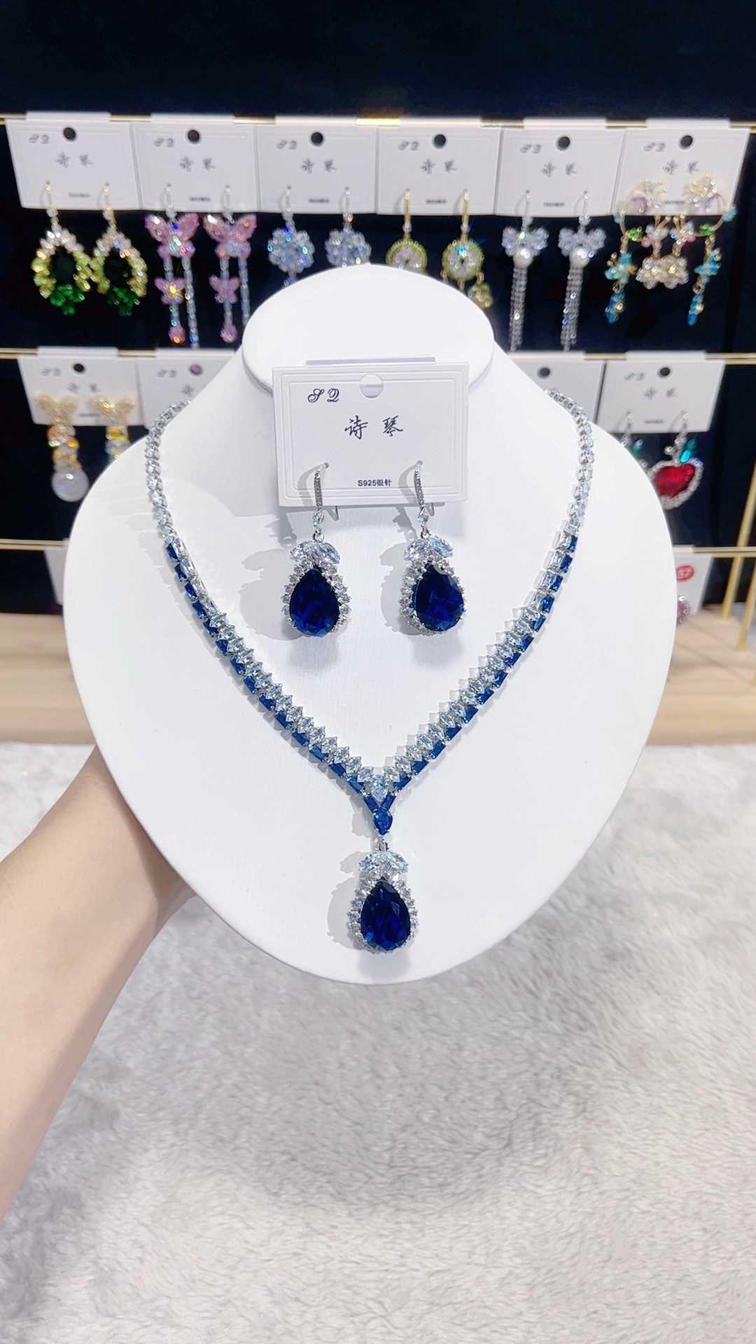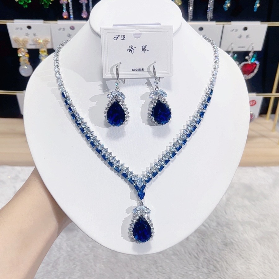 Fashion Trendy Zircon Luxury Necklace Earrings Blue Water Drop Set ins Live Hot Style Wearing Skirt Wearing