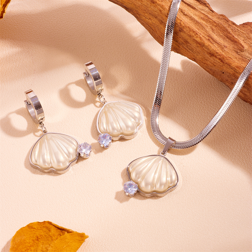 New style shell with diamond necklace earrings suit stainless steel non-fading color retaining shell with diamond earrings necklace women