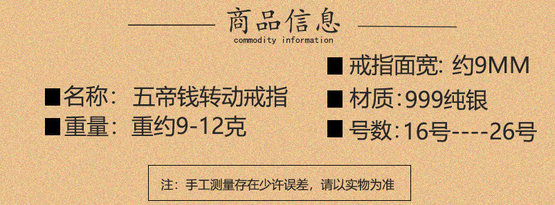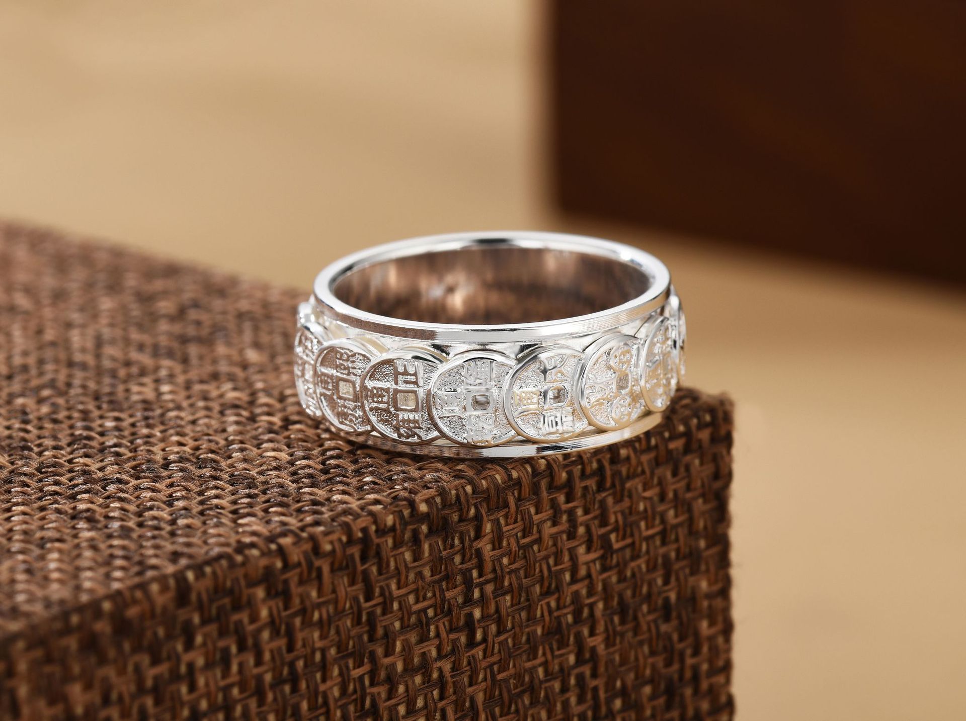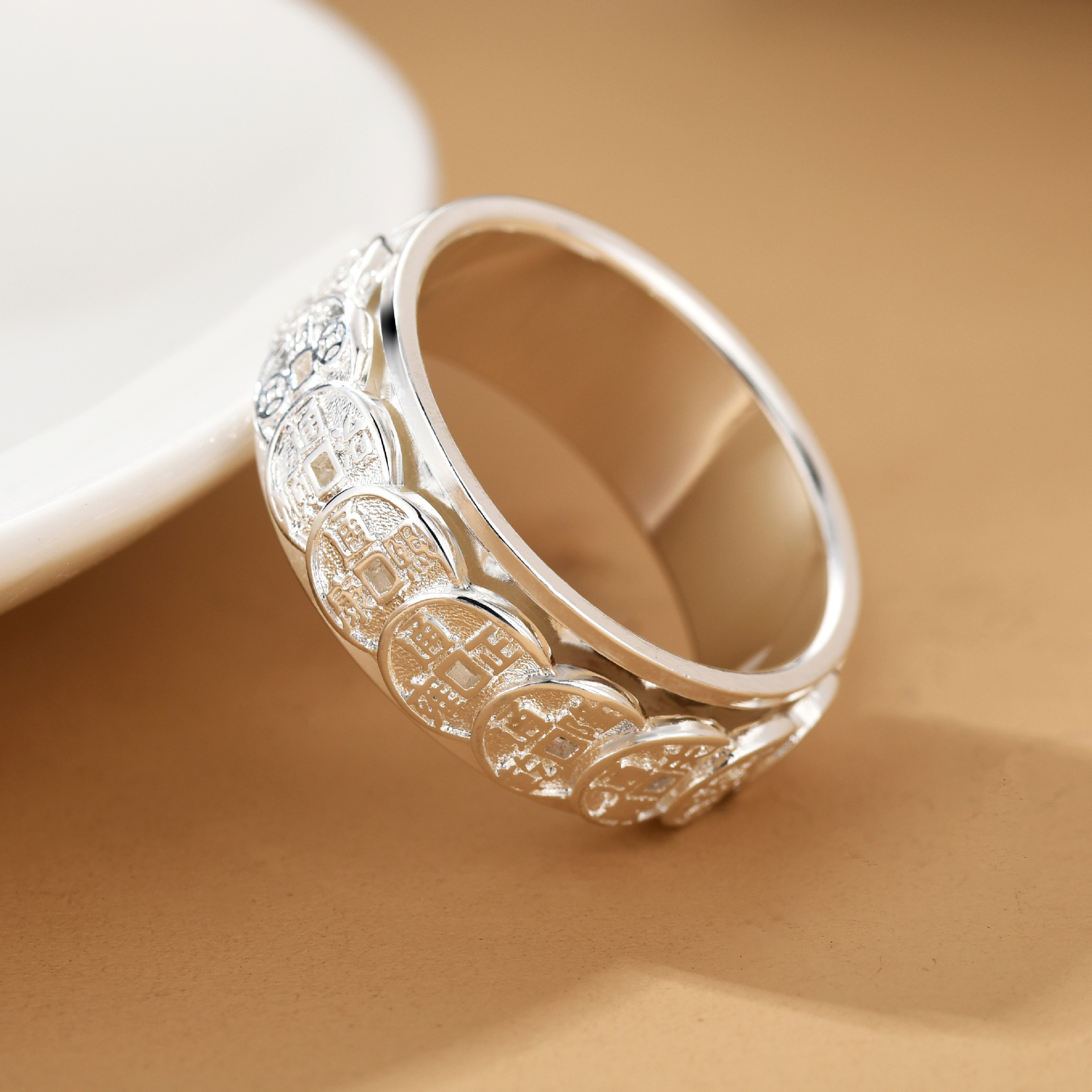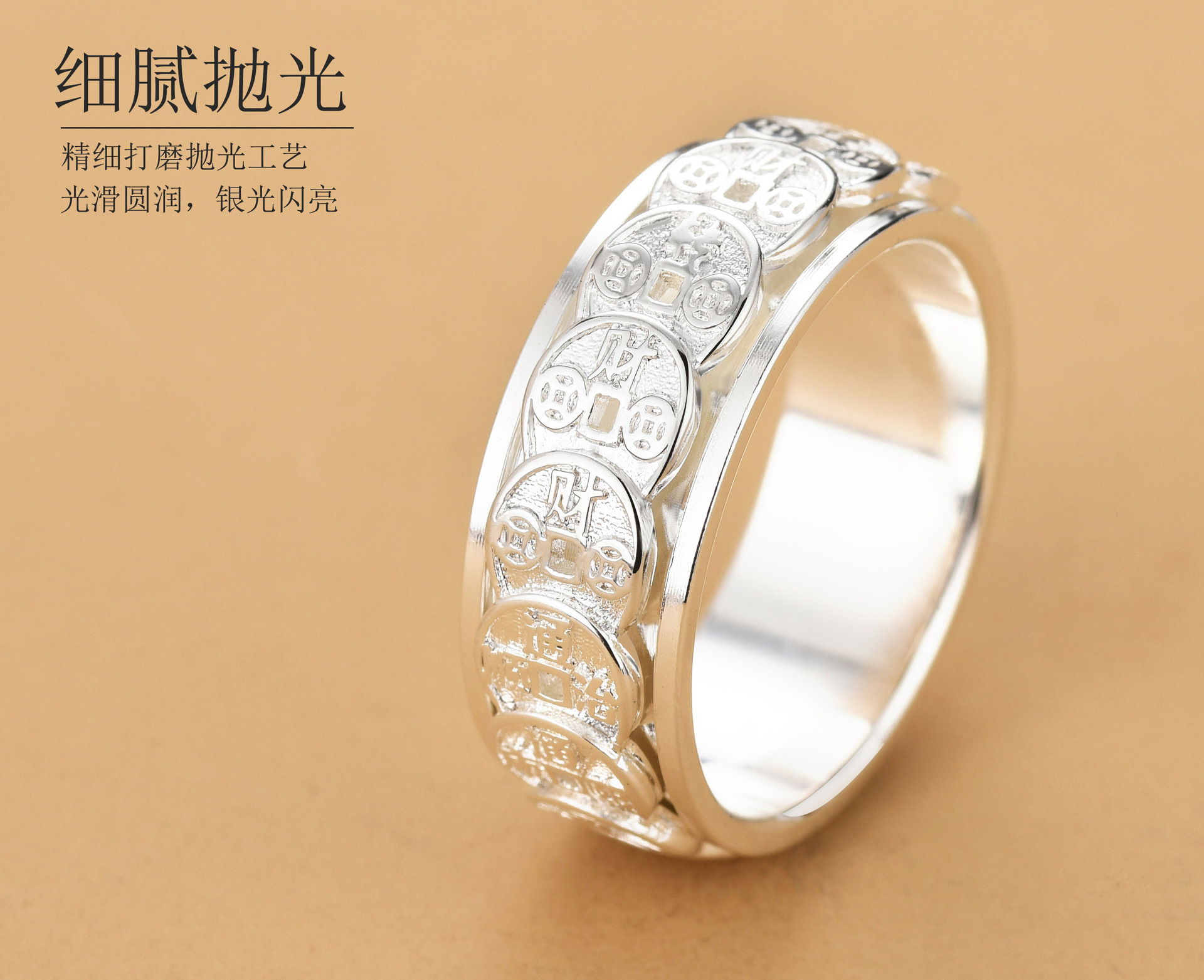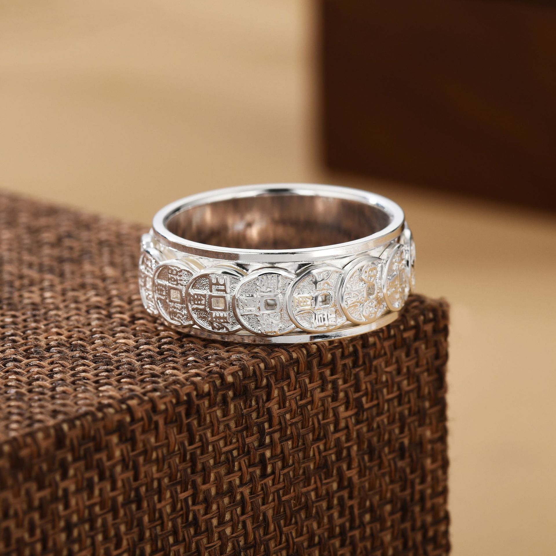 Rotatable Thai Silver Retro Ethnic Five Emperors Coin Rotatable Auspicious Personality Closed Ring for Men and Women