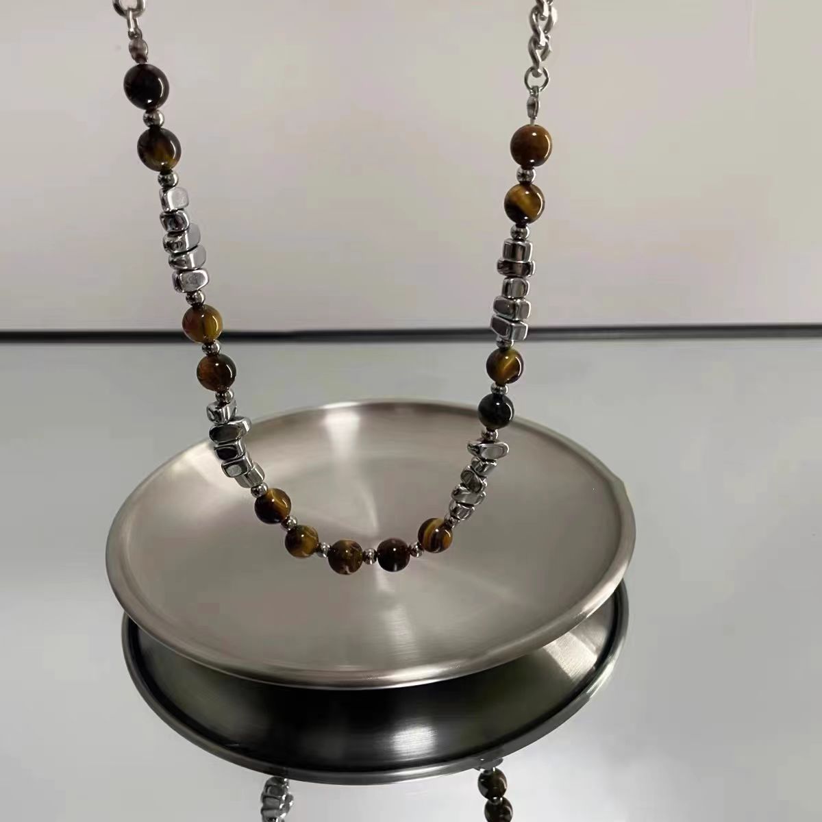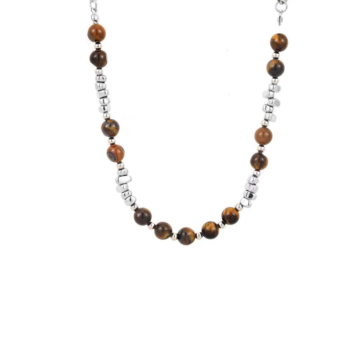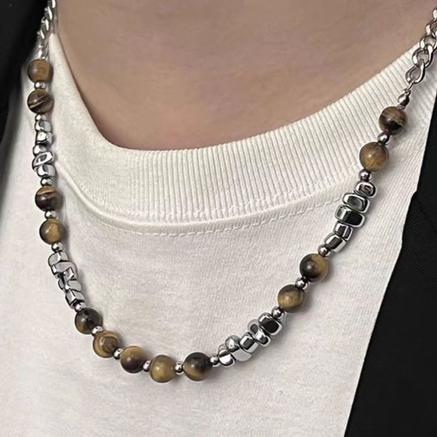 New tiger's eye stone broken silver beads stitching titanium steel necklace men and women all-match hip-hop neutral wind does not fade clavicle chain