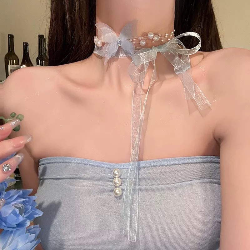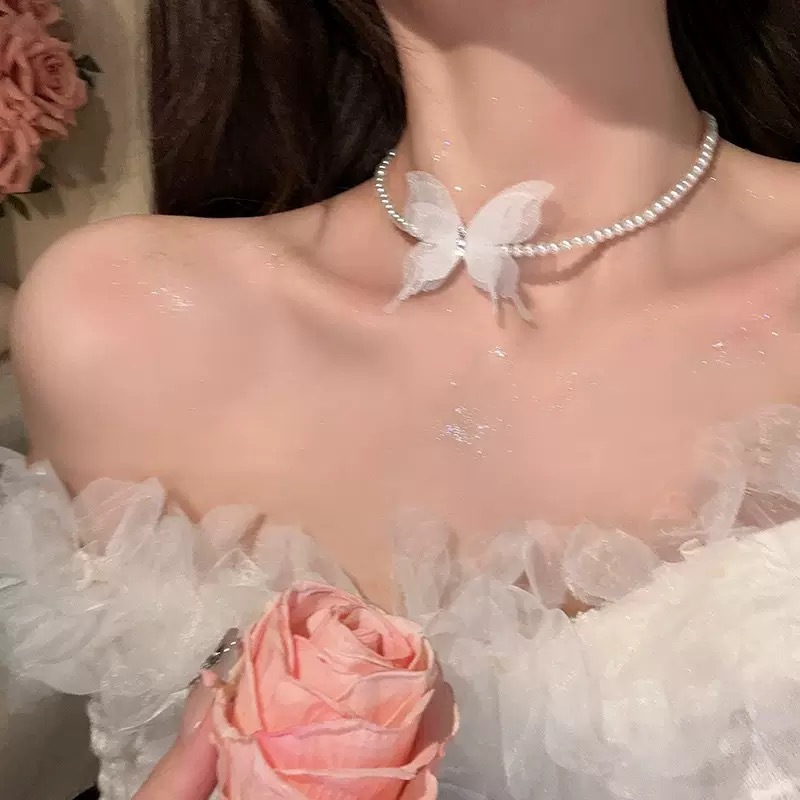 Color: White tulle butterfly pearl necklace