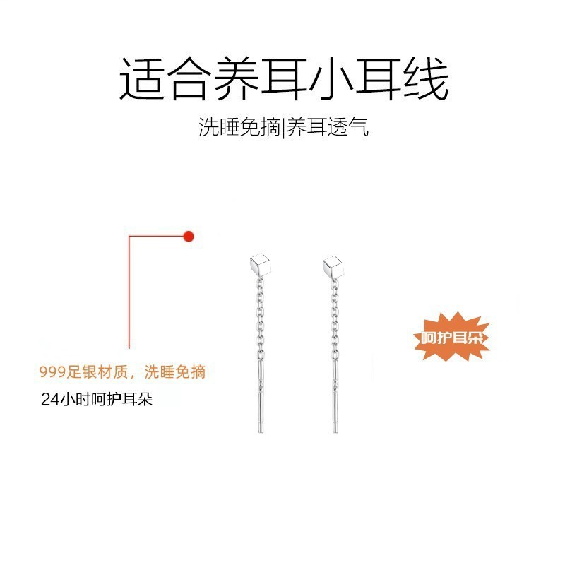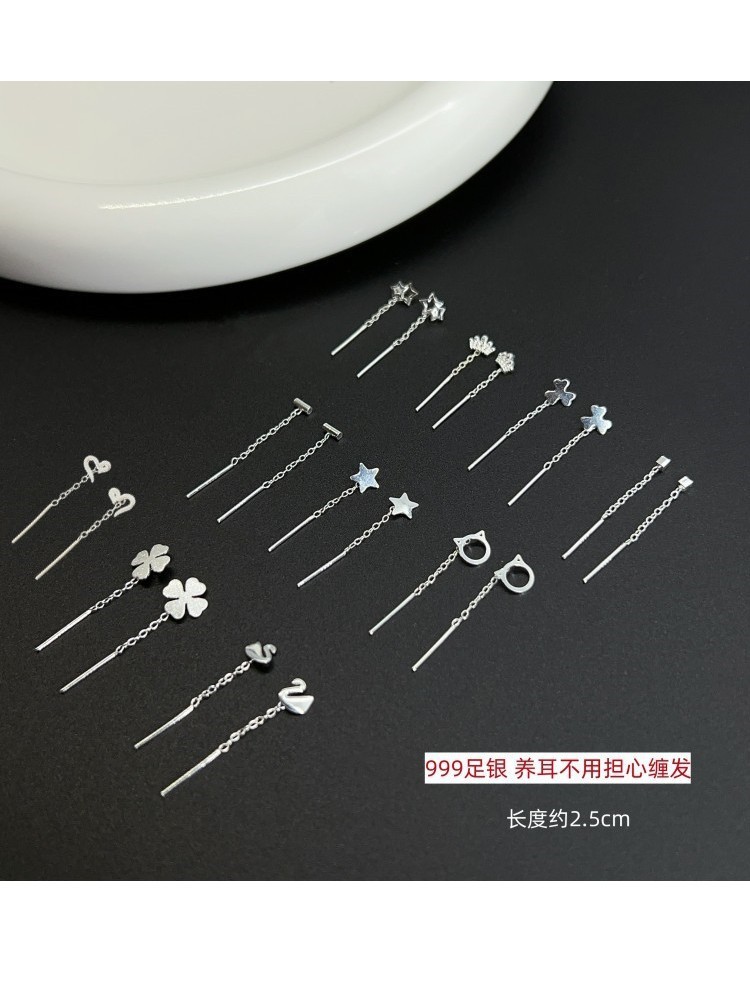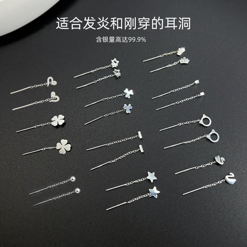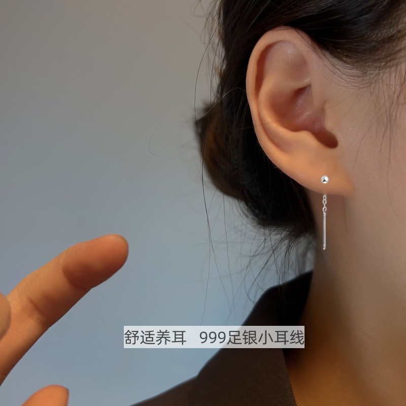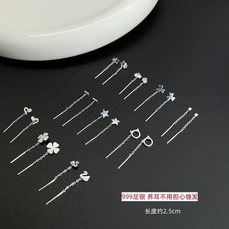 Happy ornament silversmith S999 silver earrings female 2.5cm long and short ear line ear hole thin face temperament earrings generation hair