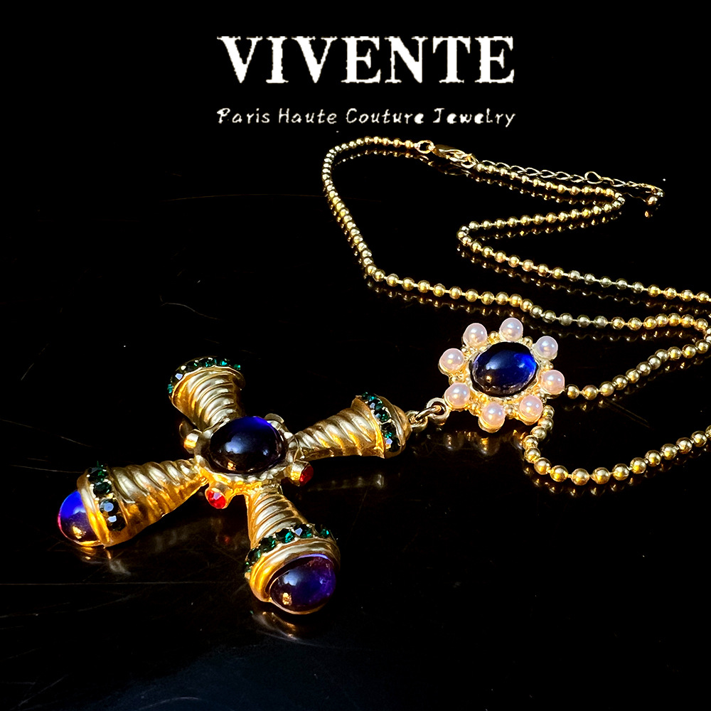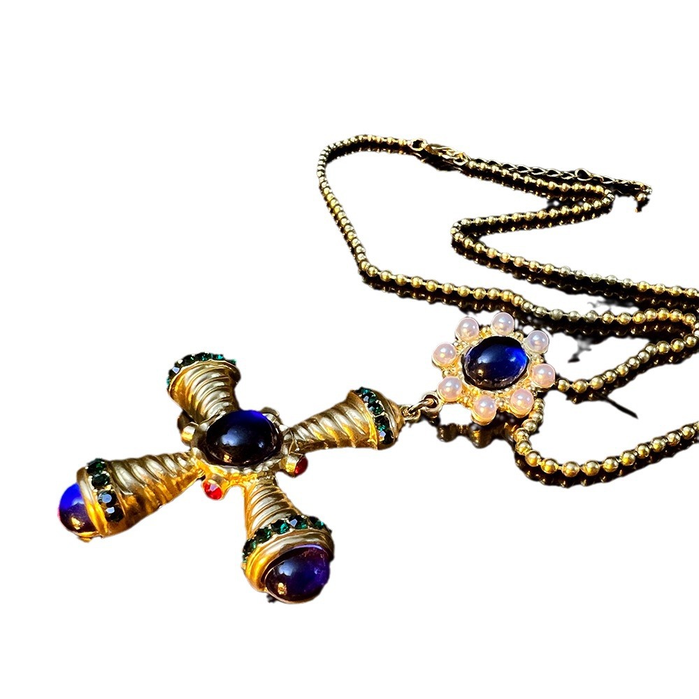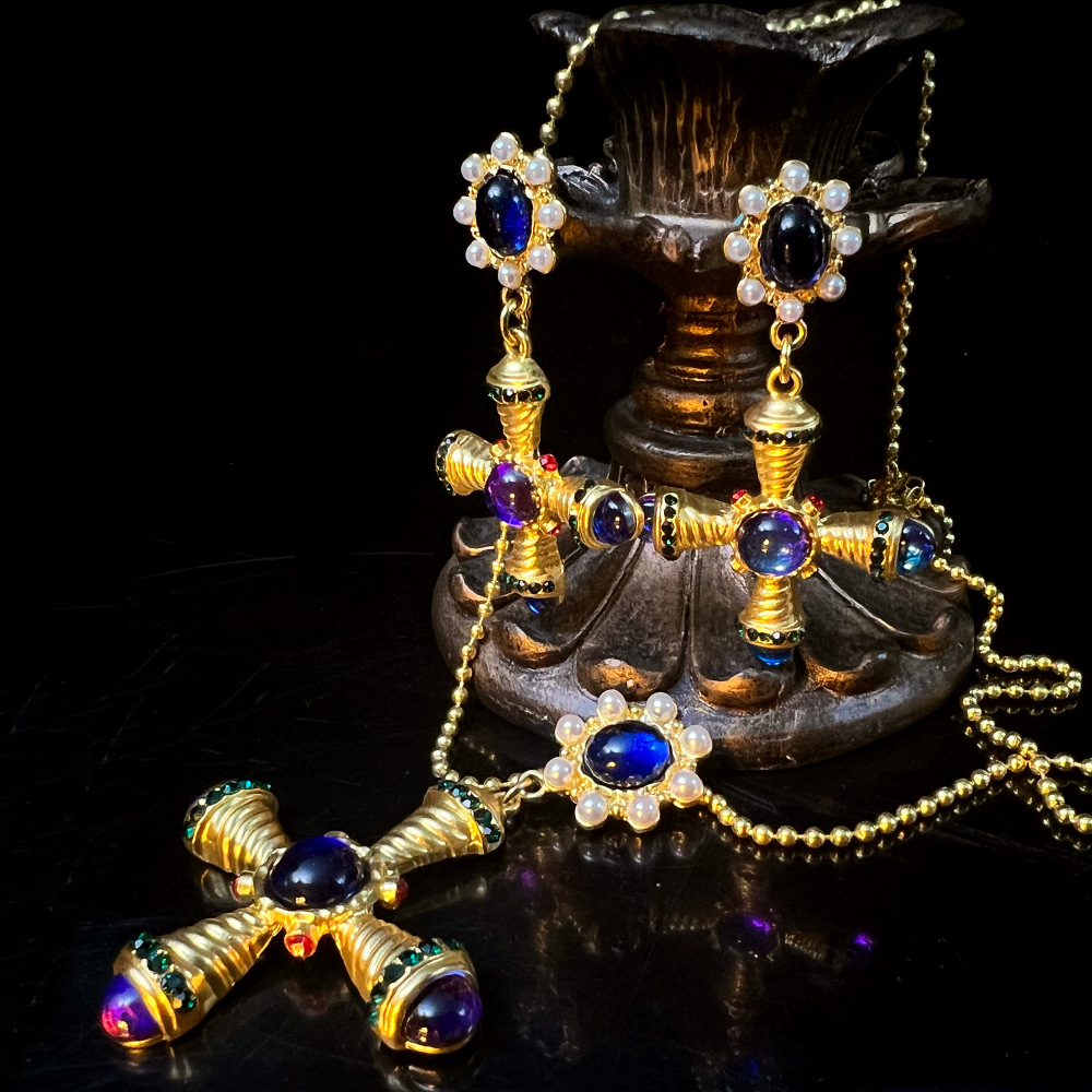 Middle Ancient Jewelry suit Western Antique vintage Sapphire Vintage Copper Plated Gold Cross Earrings Necklace