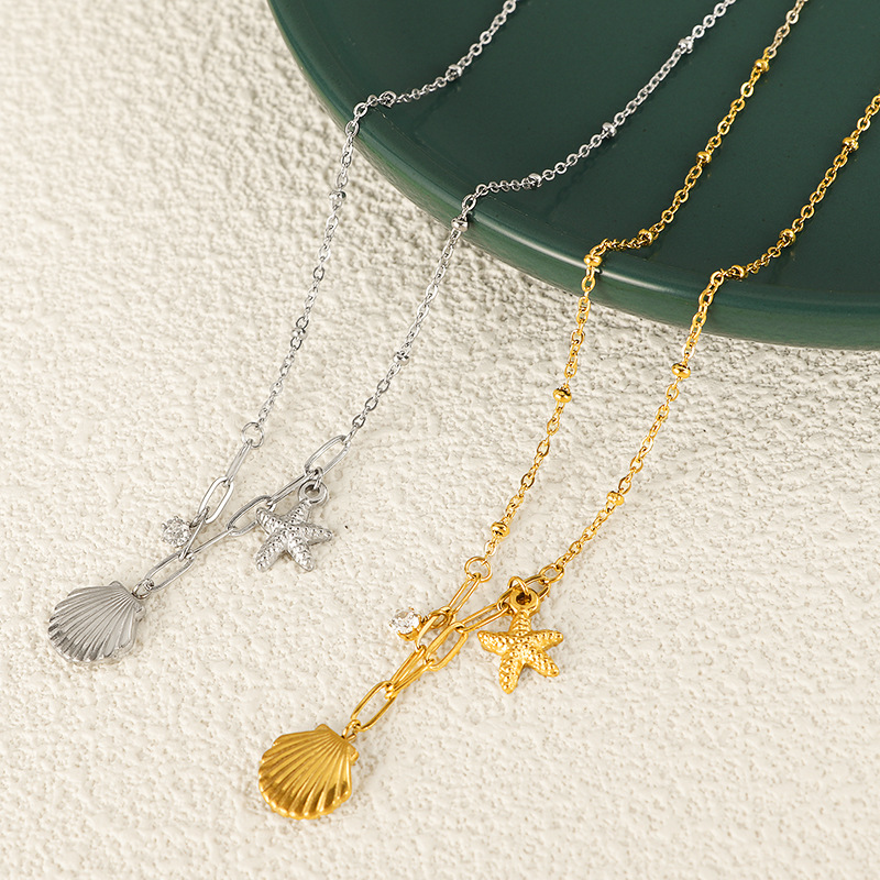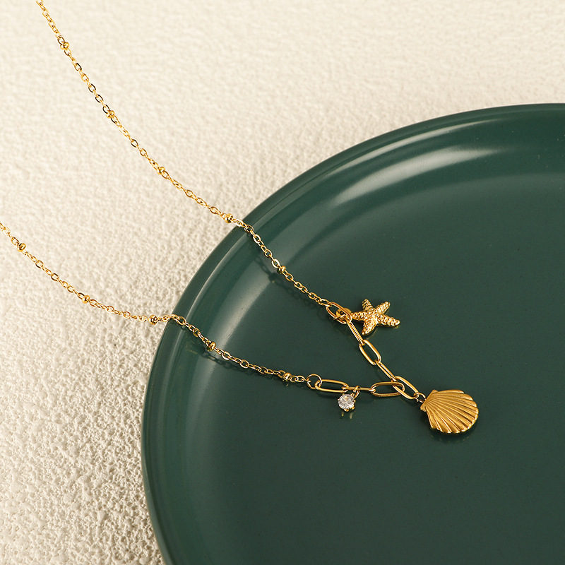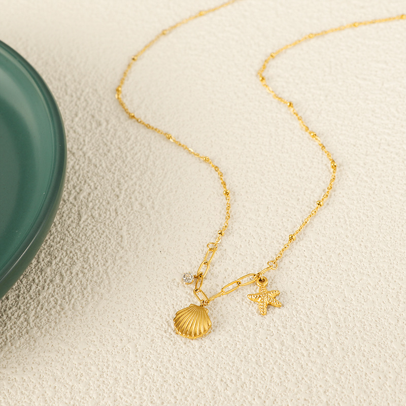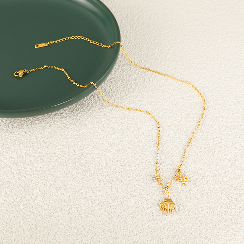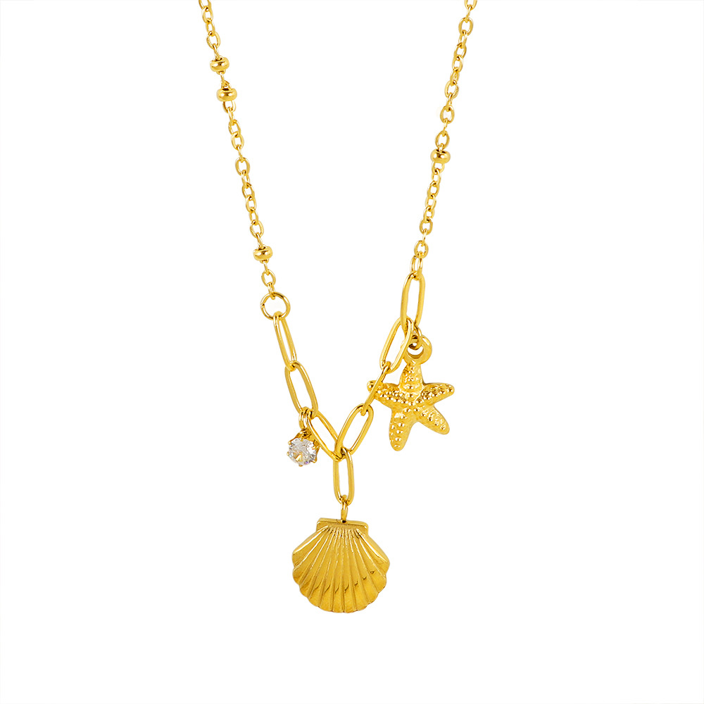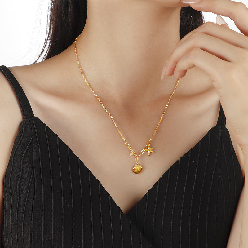 Summer Beach Golden Shell Starfish Flash Diamond Necklace Clavicle Titanium Steel Necklace Holiday Style Niche Light Luxury Necklace for Women