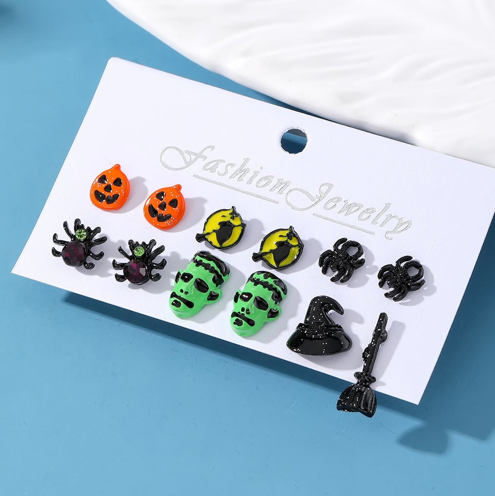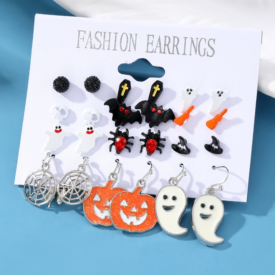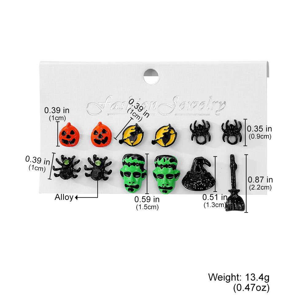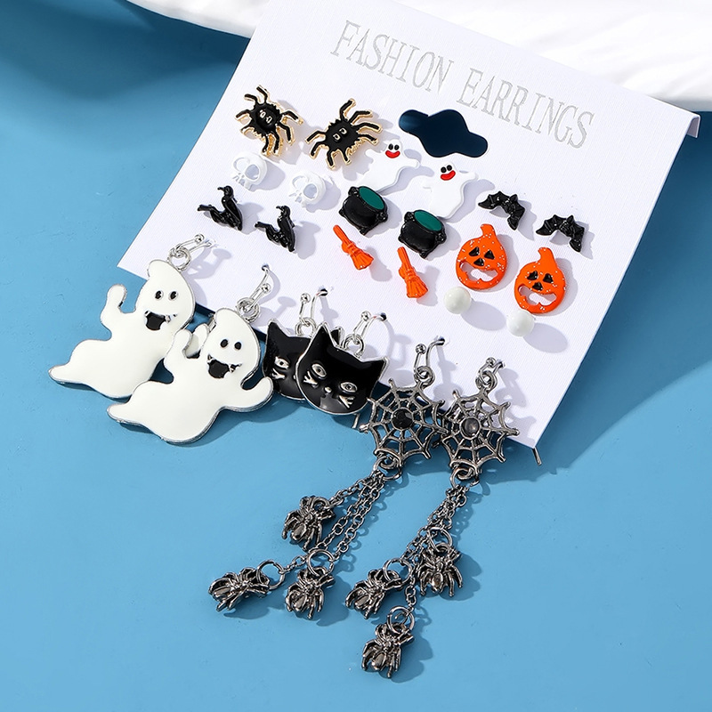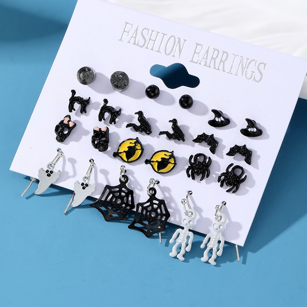Cross-Border Halloween Horror Funny Earrings Alloy Diamond Skull Pumpkin Cat Spider Web Ghost Earrings