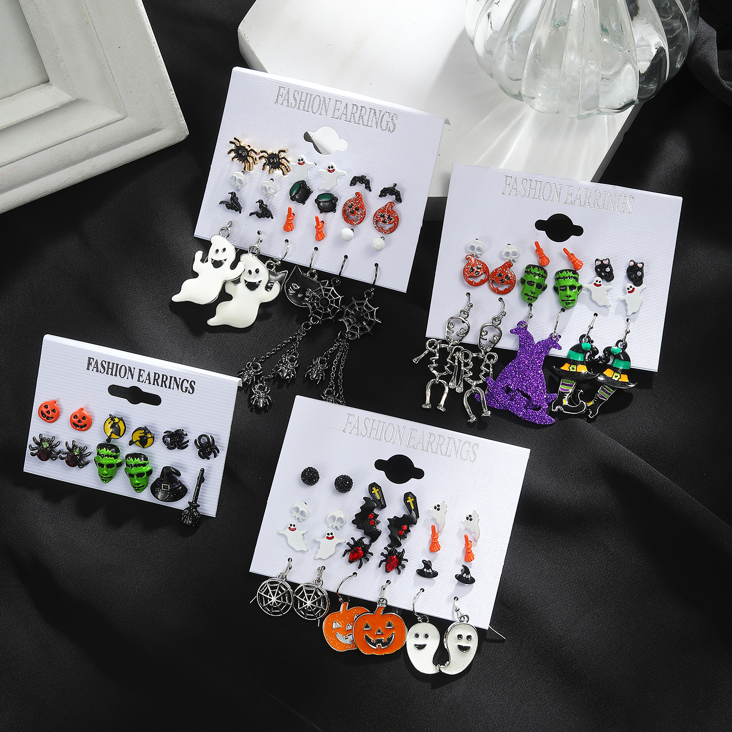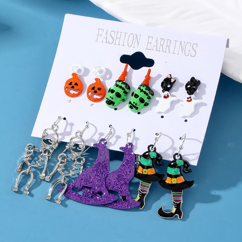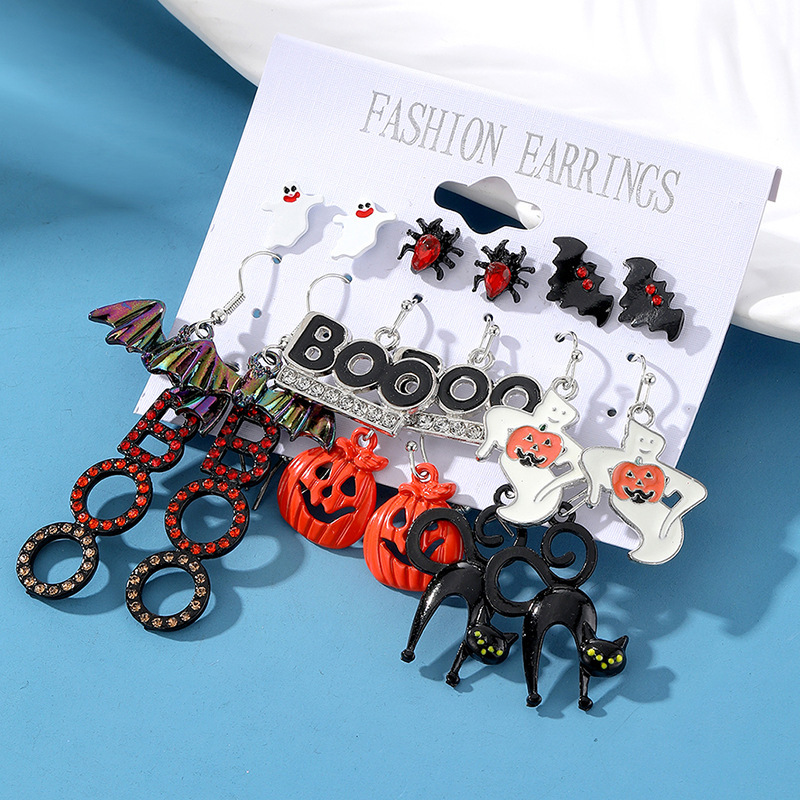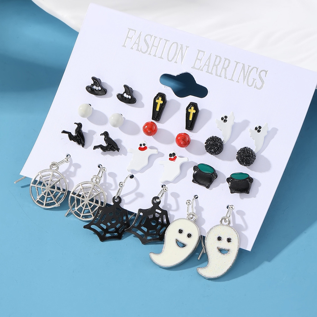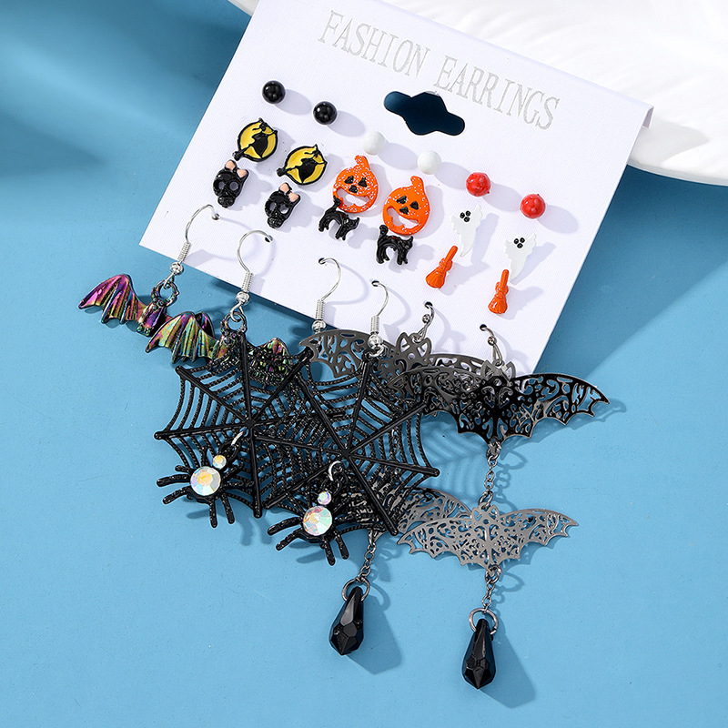 Cross-Border Halloween Horror Funny Earrings Alloy Diamond Skull Pumpkin Cat Spider Web Ghost Earrings