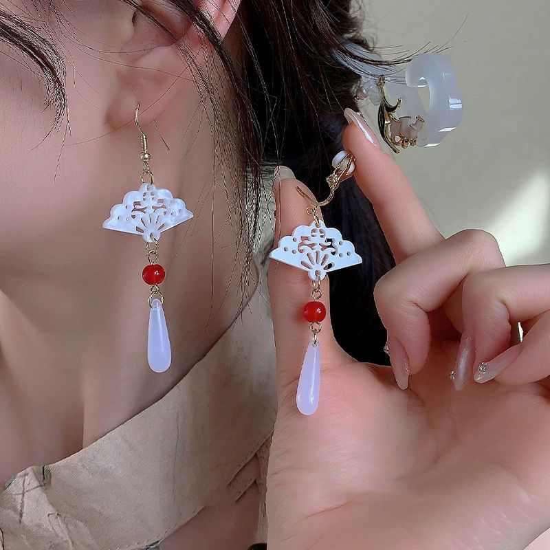 Color: New chinese style fan water drop jade ear hooks