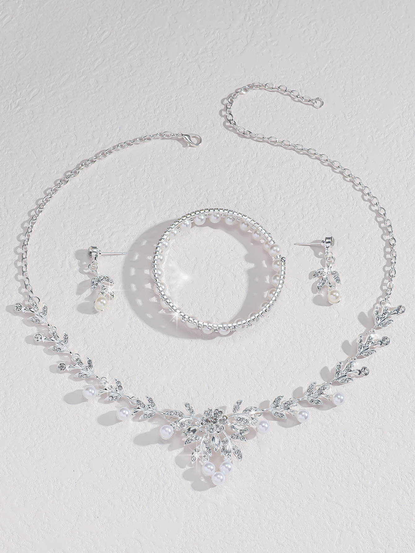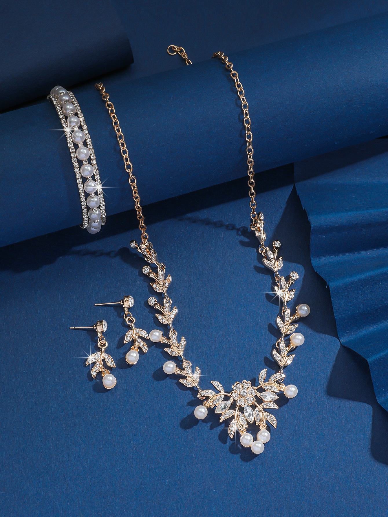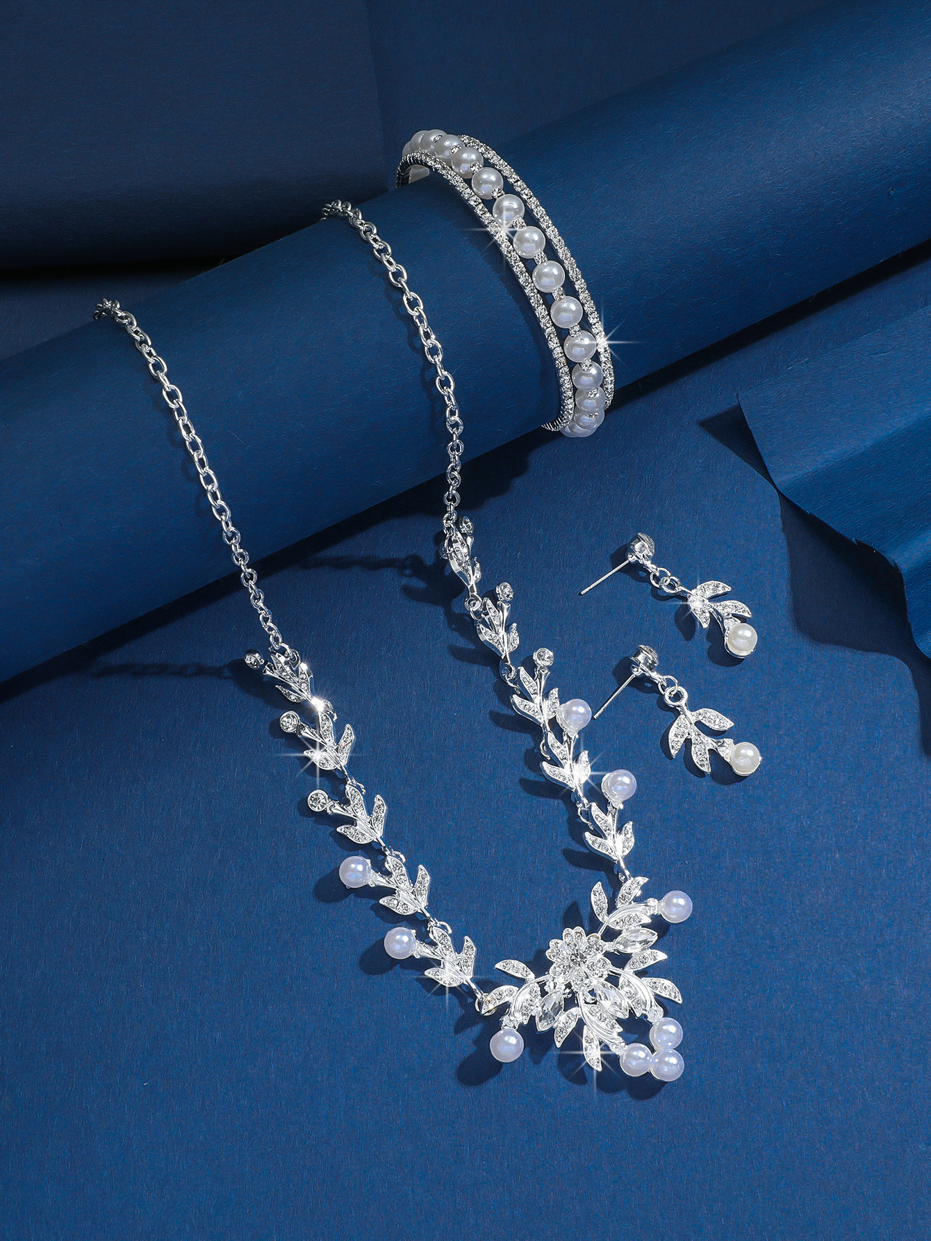 European and American Explosions Retro Versatile Women's Clavicle Chain Elegant Leaves Flowers Imitation Pearl Beaded Necklace Earrings suit