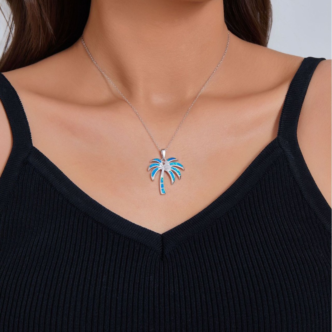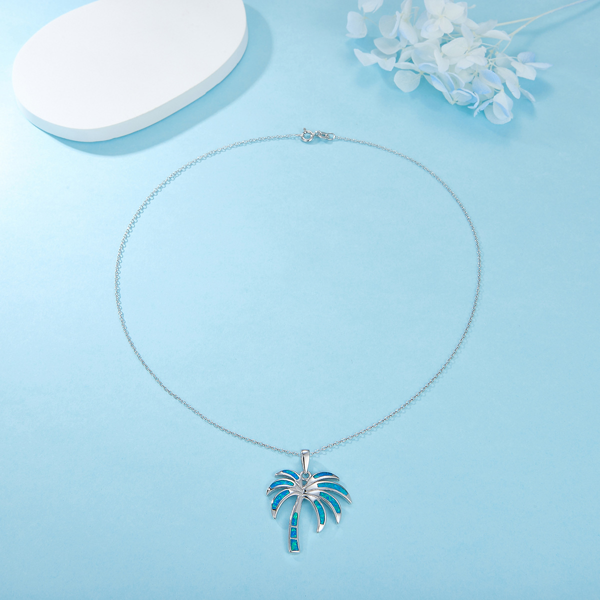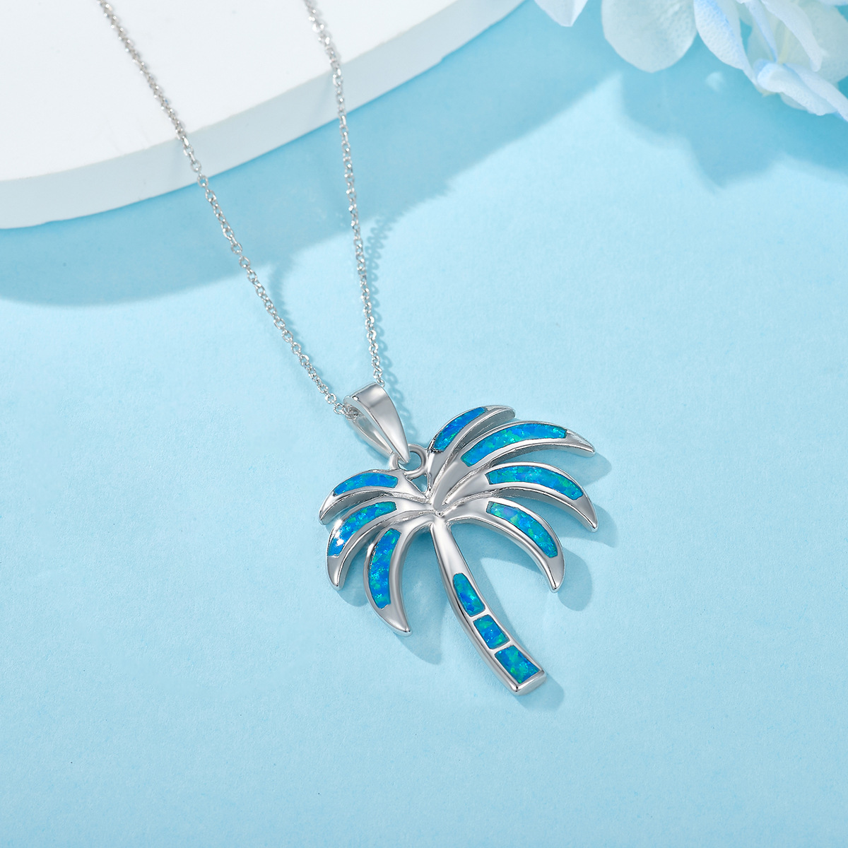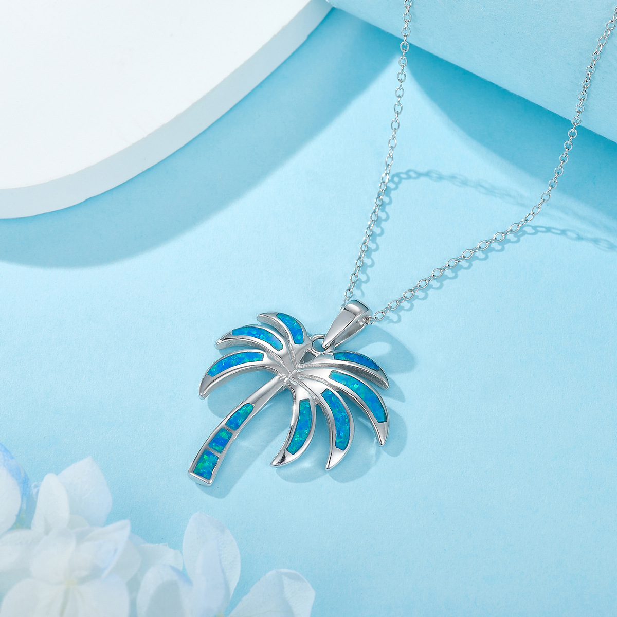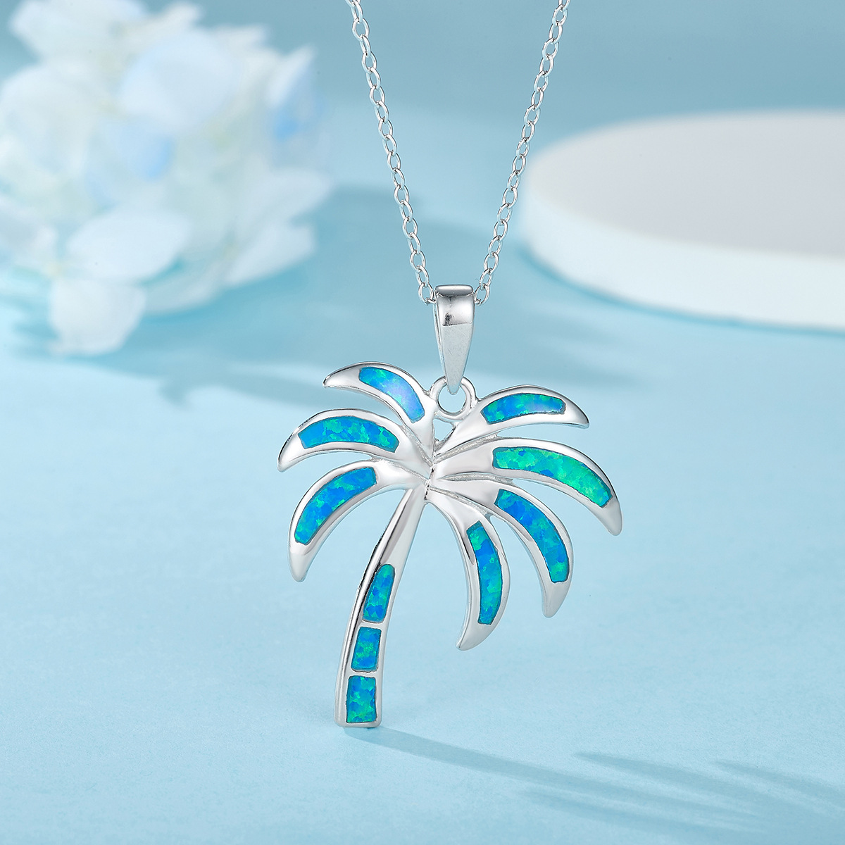 European and American Blue Opal Hawaiian Coconut Tree Necklace Copper Silver Opal Inlaid Pendant Tropical Style Women's Necklace Customization