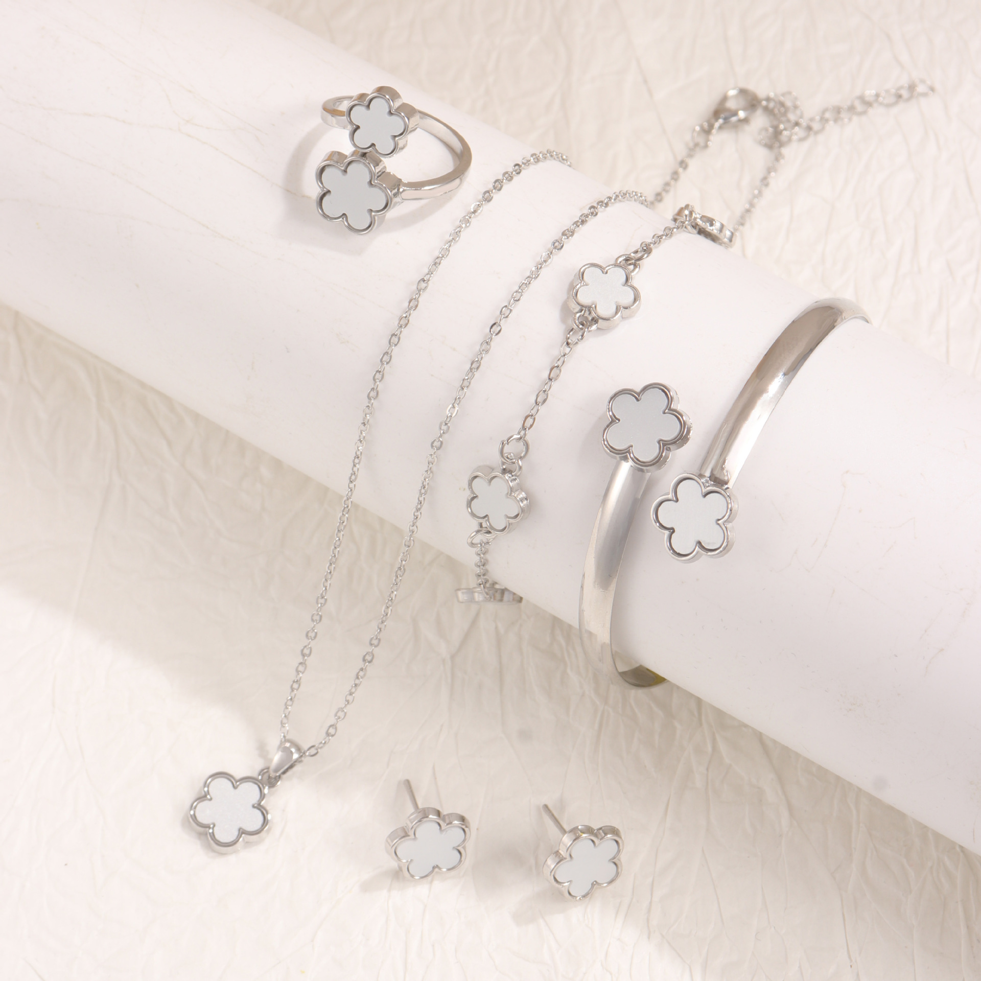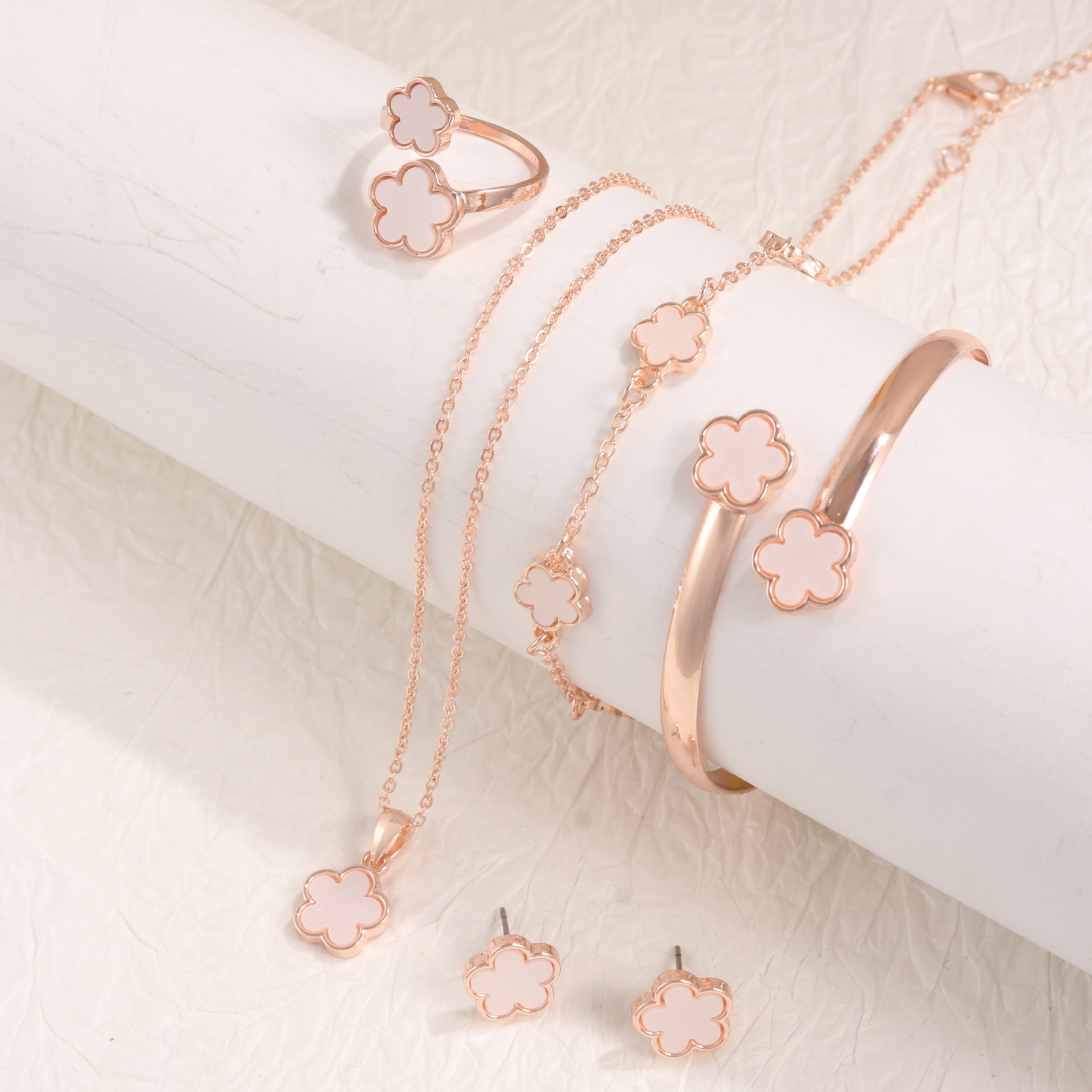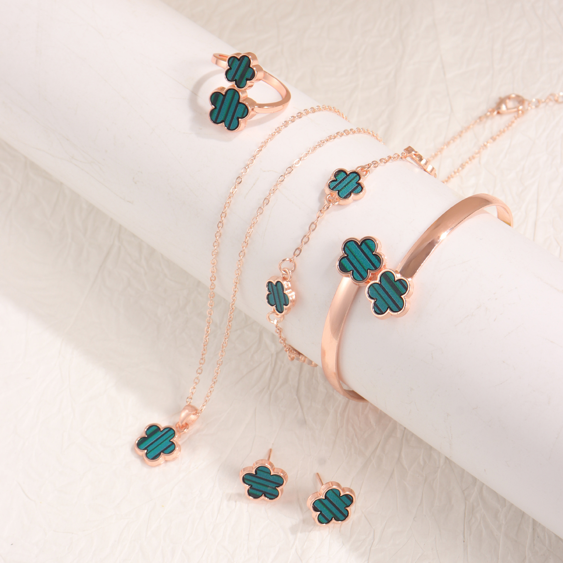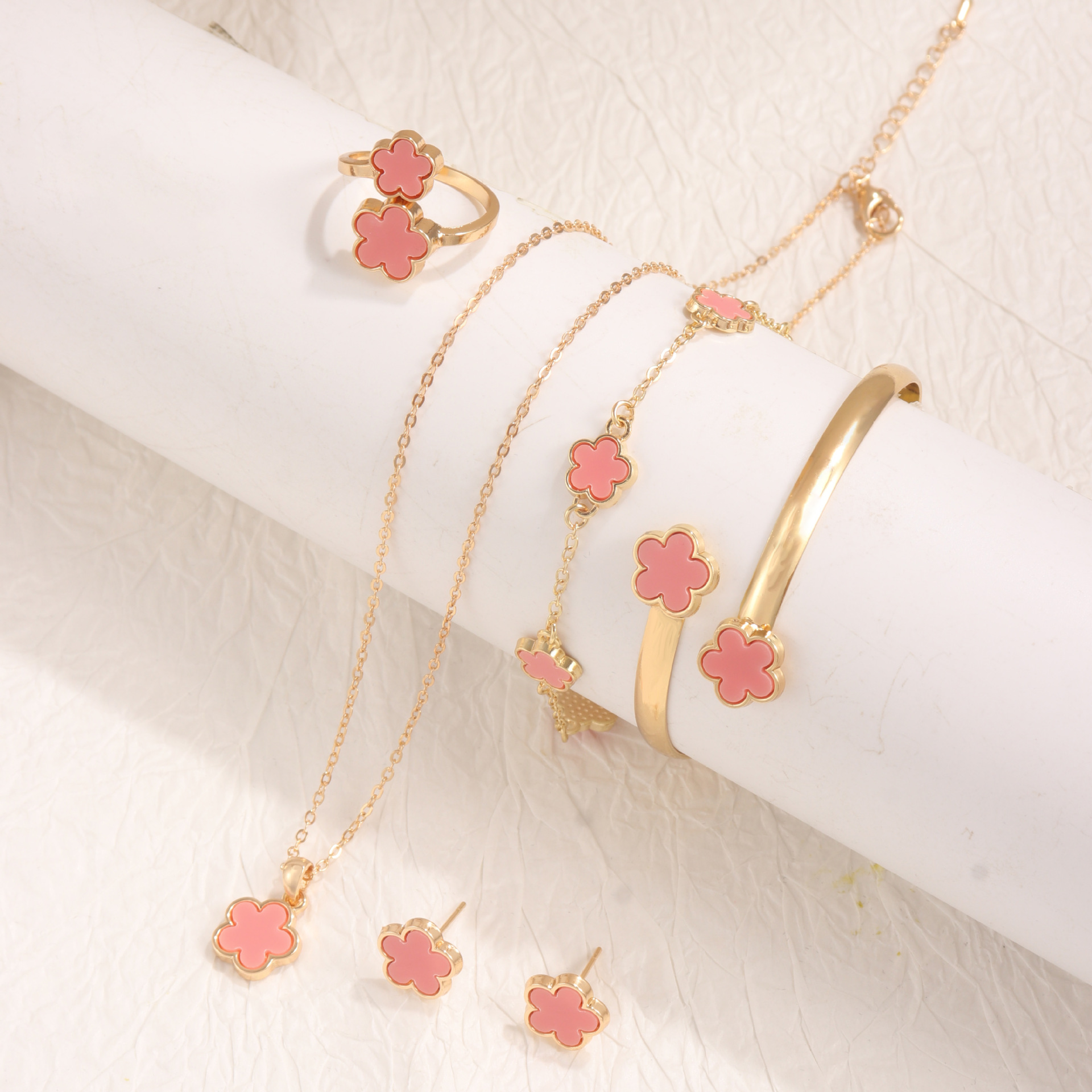 temu Hot Sale Bright Lucky Flower Jewelry suit Acrylic Bracelet Bracelet Five Leaf Clover Necklace Ring Earrings for Women