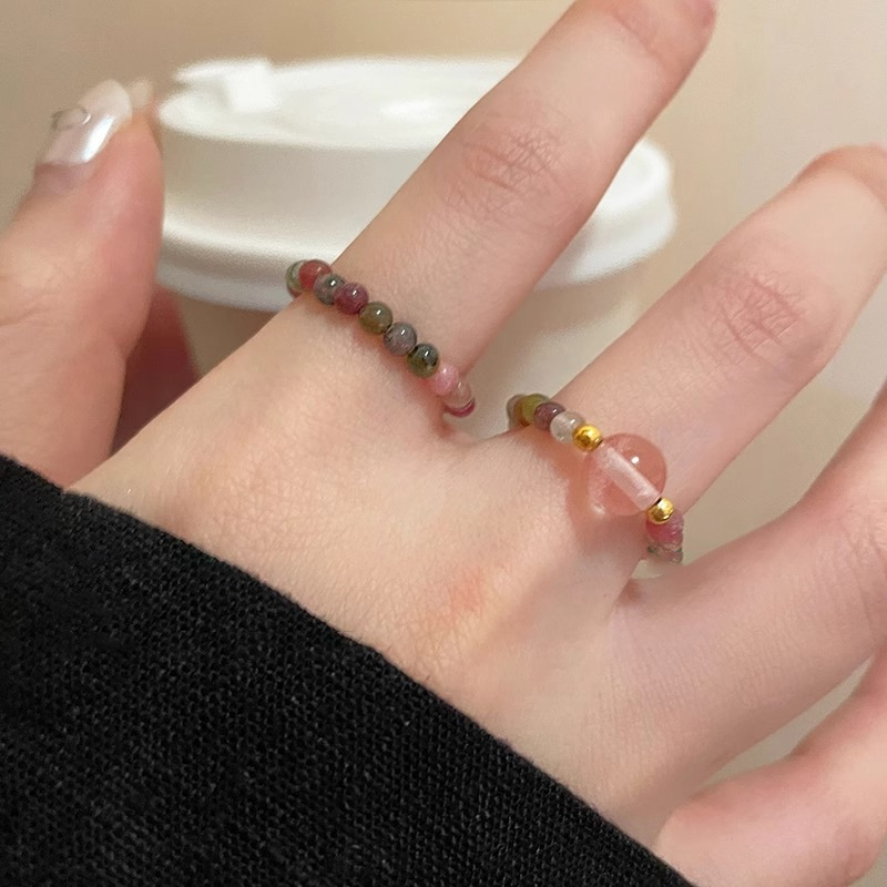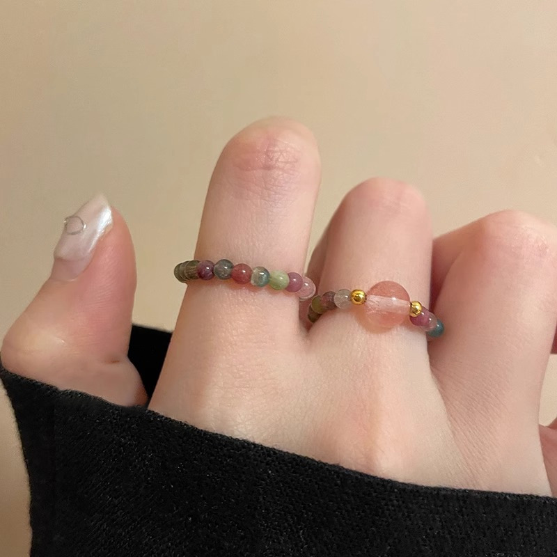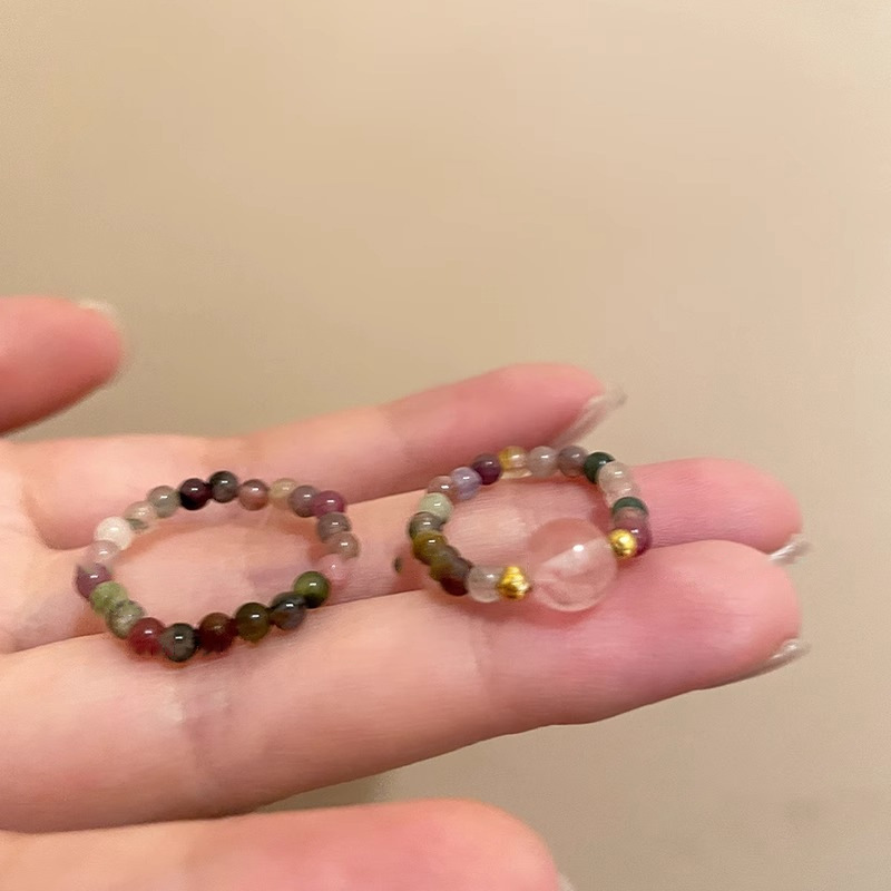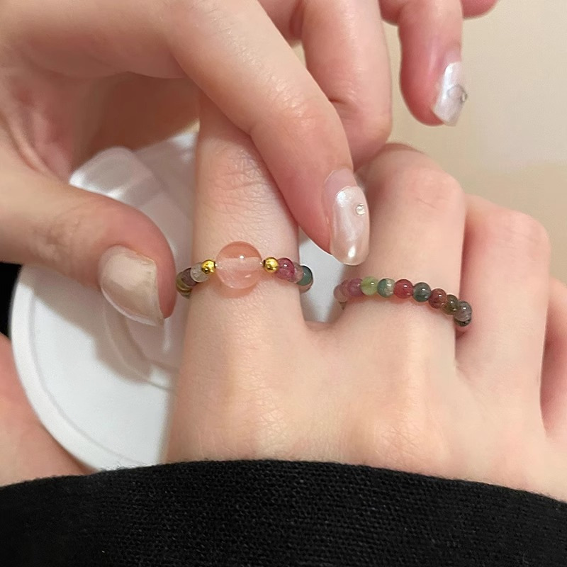 Large Round Bead Tourmaline Beaded Ring suit Women's Retro Ethnic Style Elastiness Rope Finger Ring Advanced Sense Simple Ring