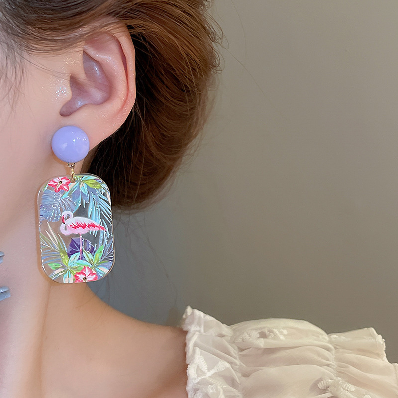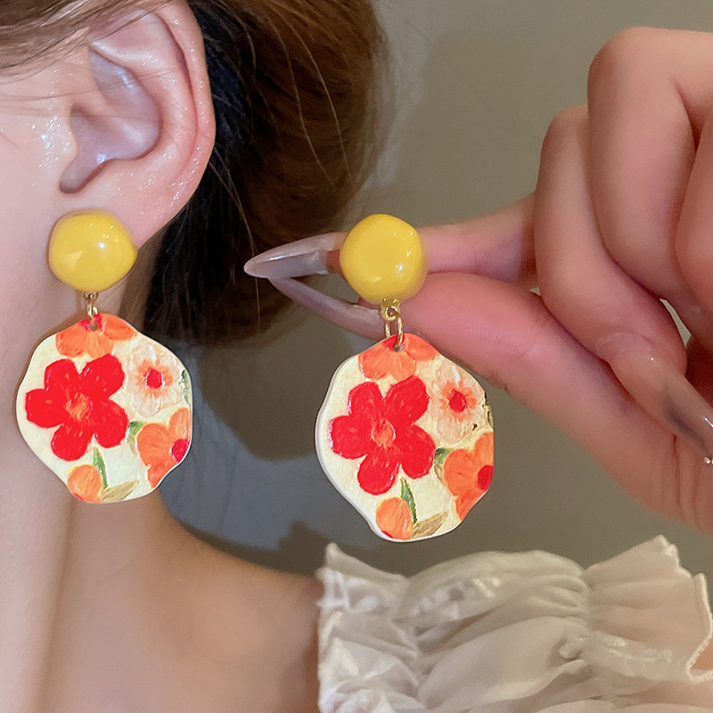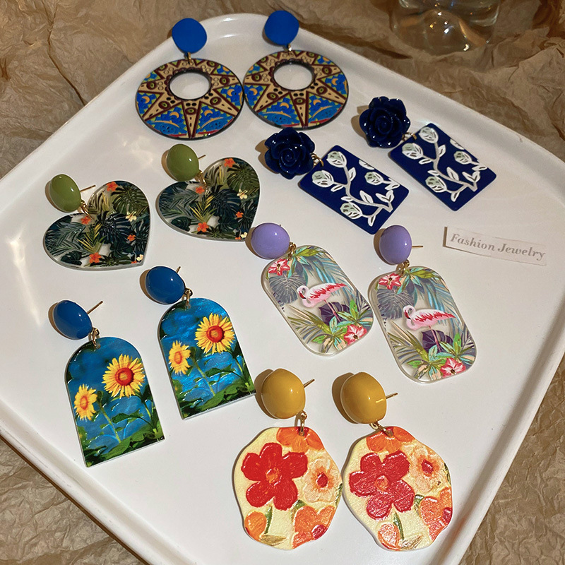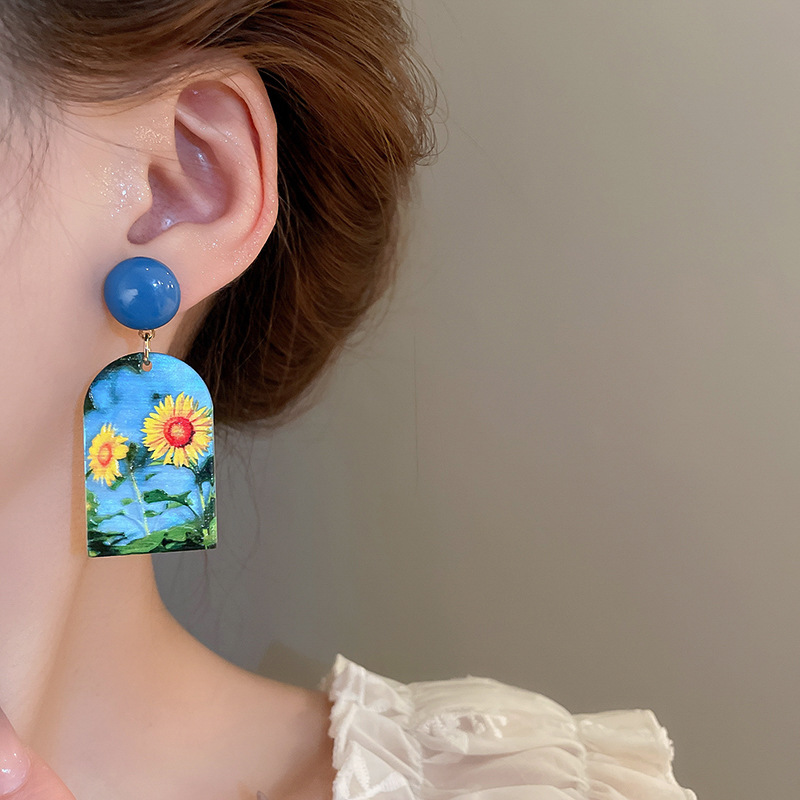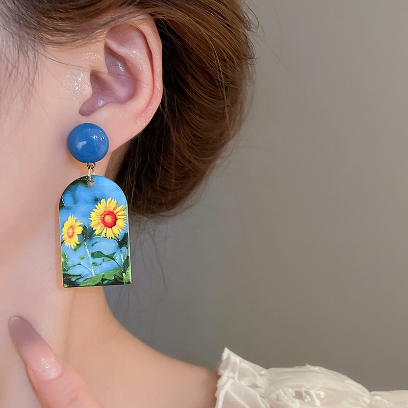 Silver Needle French Oil Painting Sunflower Earrings Creative Design Flamingo Earrings Cross-border Aesthetic Artistic Style Earrings