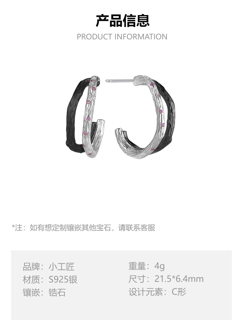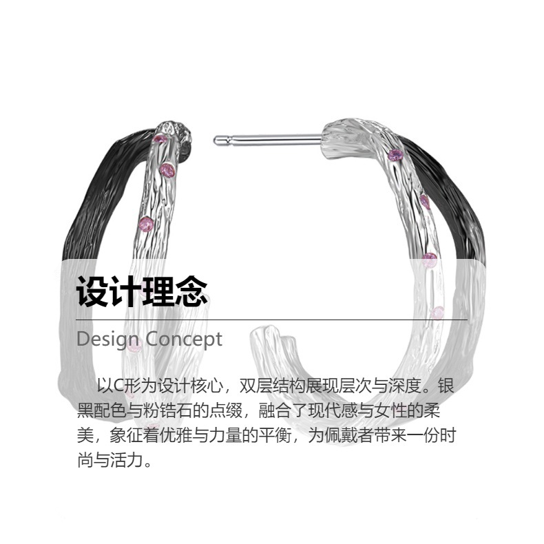 Cross-border New S925 Sterling Silver Double Layer Silver Black Color Matching C- shaped Earrings Design Sense Diamond Pink 5A Zircon Earrings