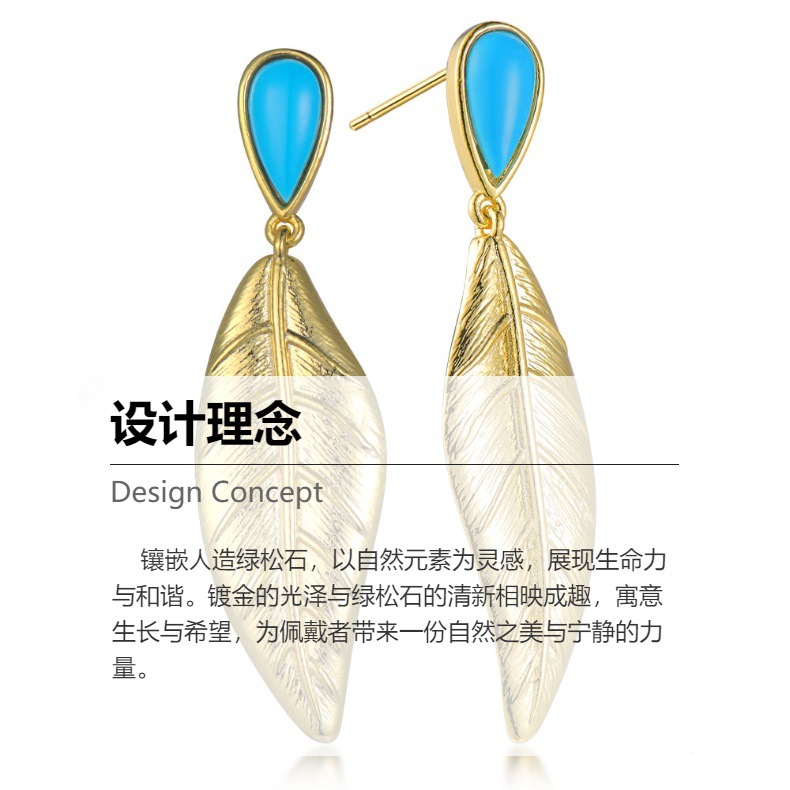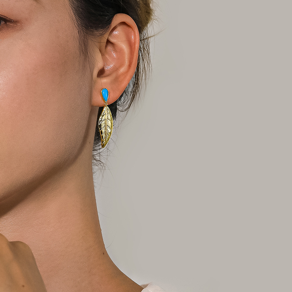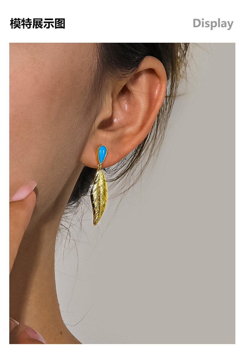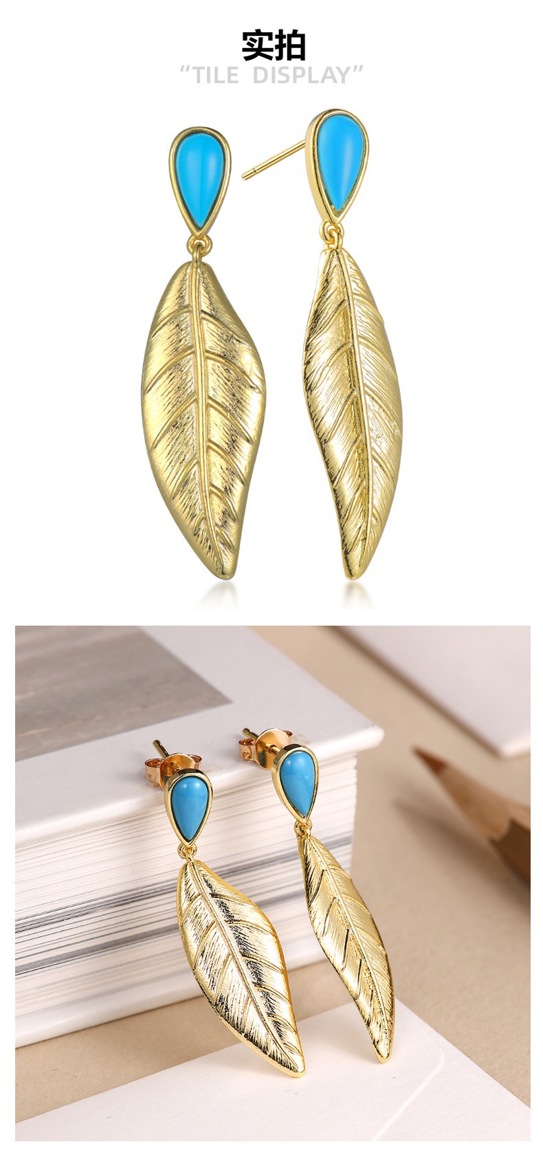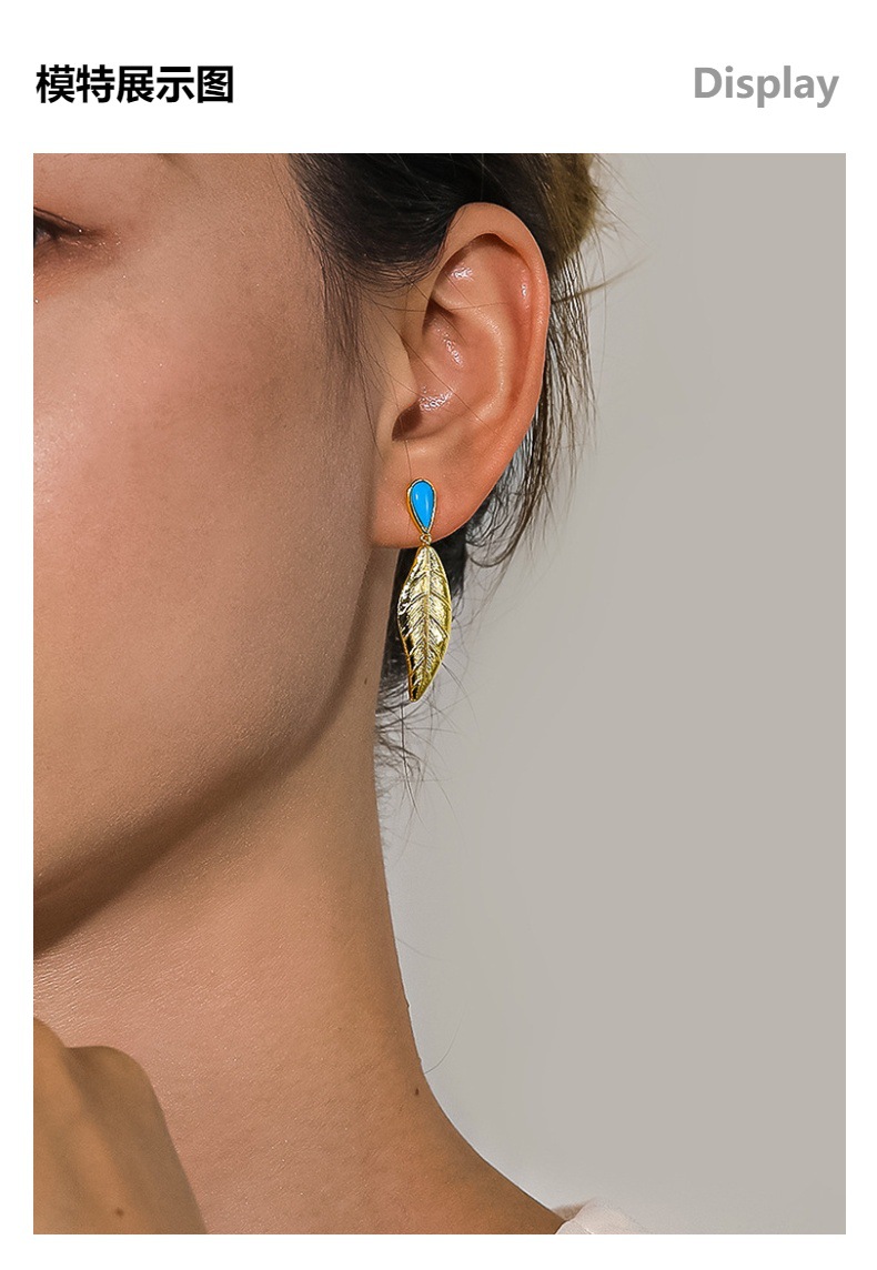Cross-Border European and American Leaf Earrings Personalized 18K Metal Texture Plated Artificial Turquoise Blue Tassel Earrings