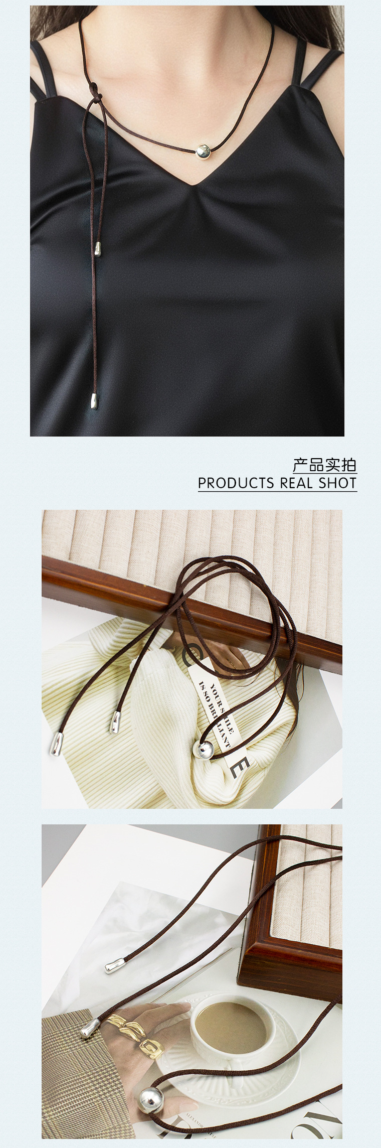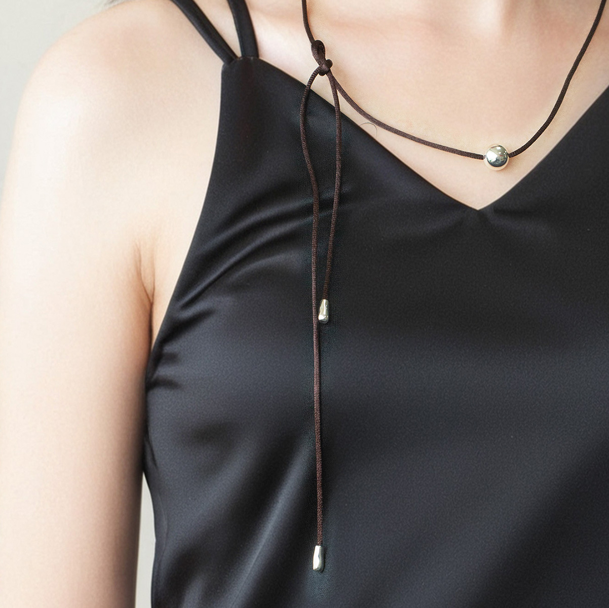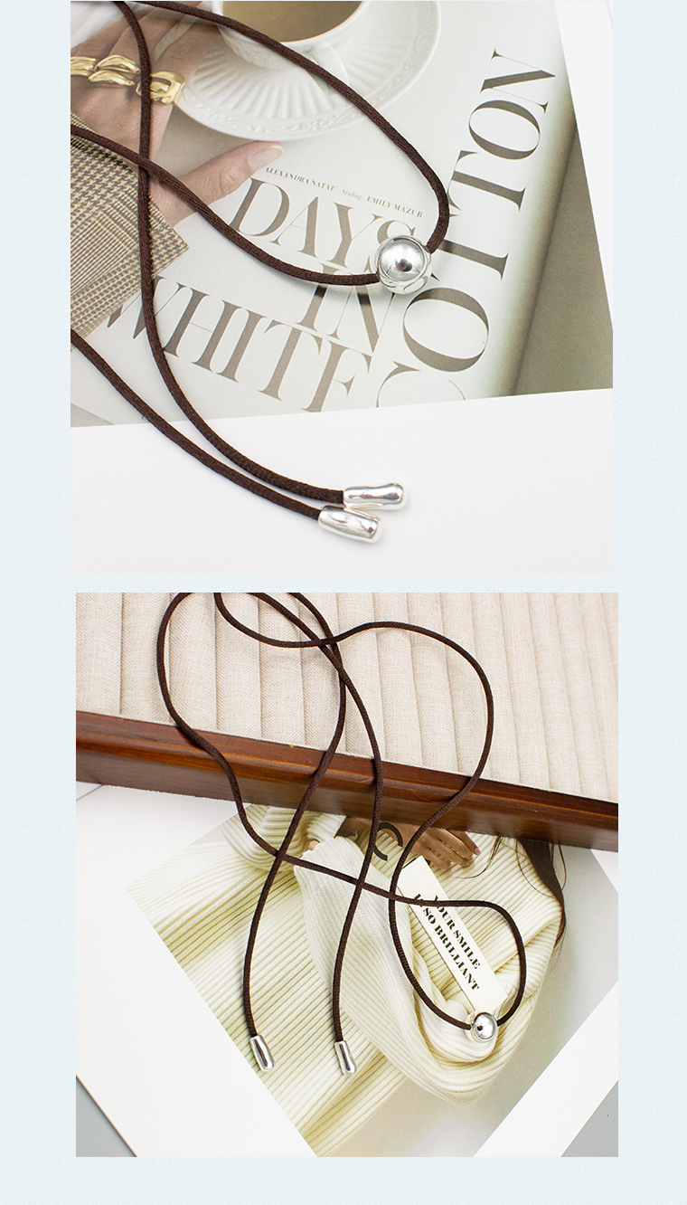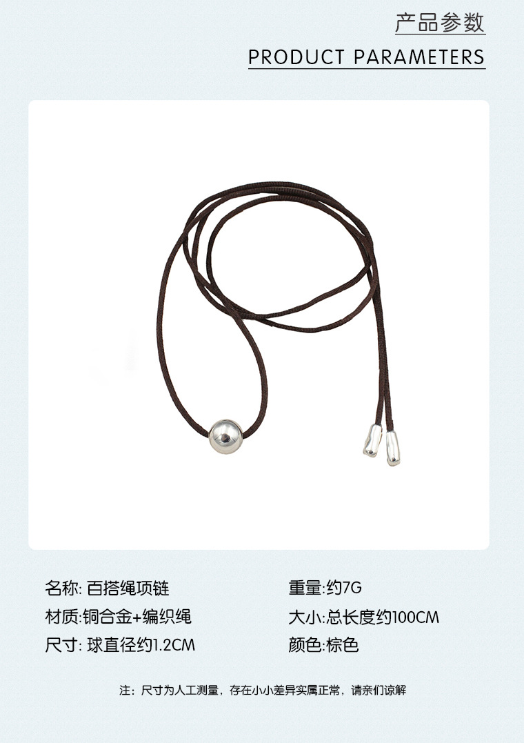 New Chinese Style Silver Ball Brown Rope Necklace Adjustable Cold Wind Small Many Wear French Style Distinctive Brown Rope Clavicle Chain