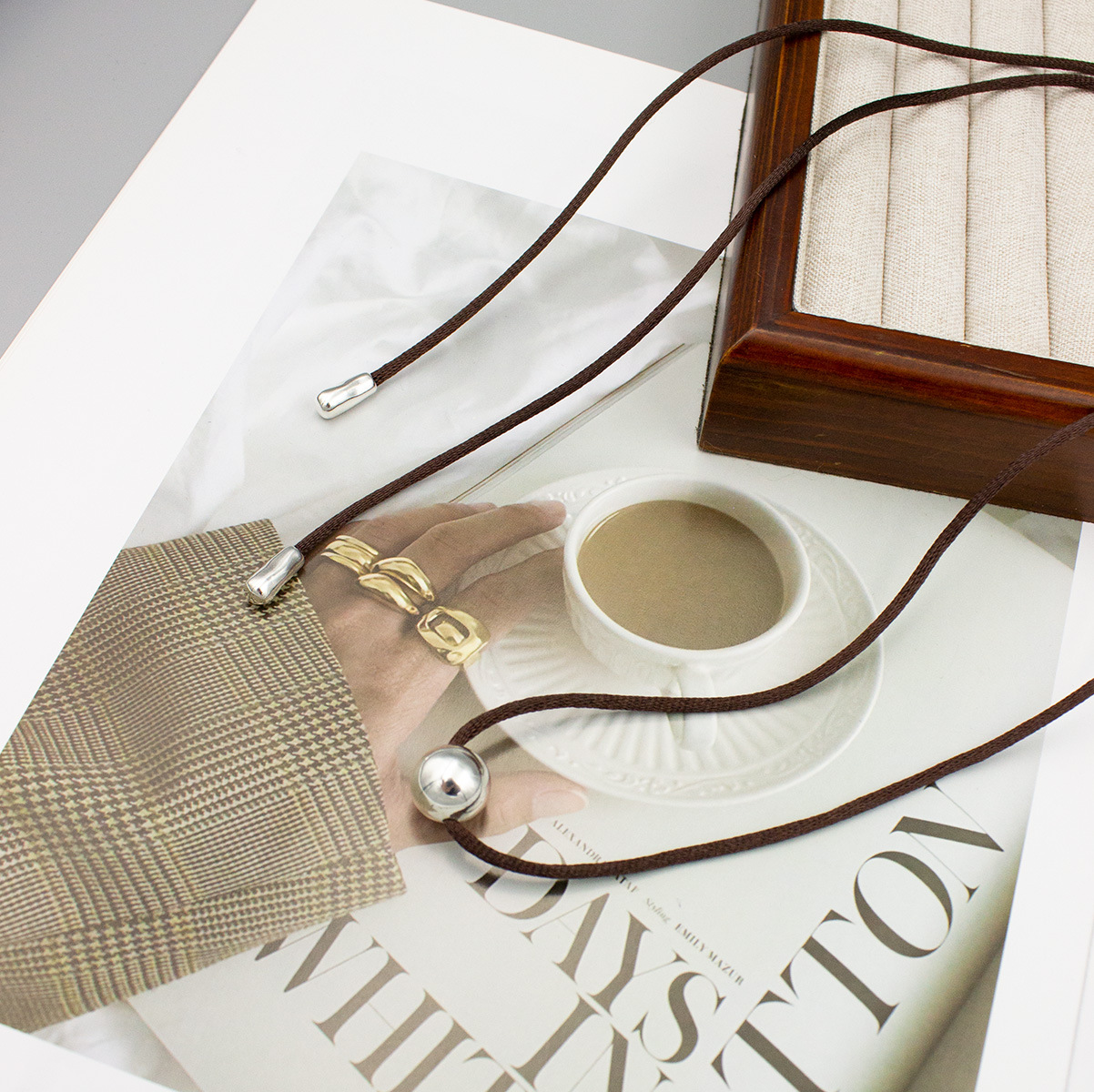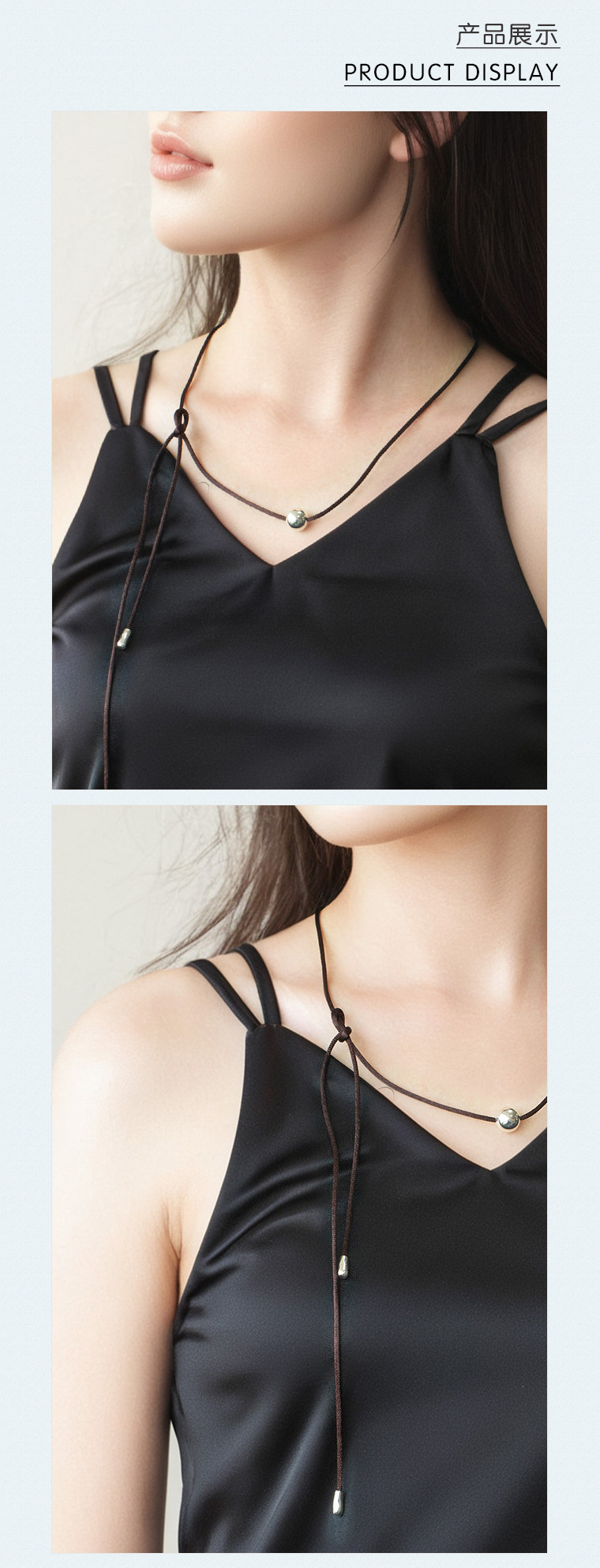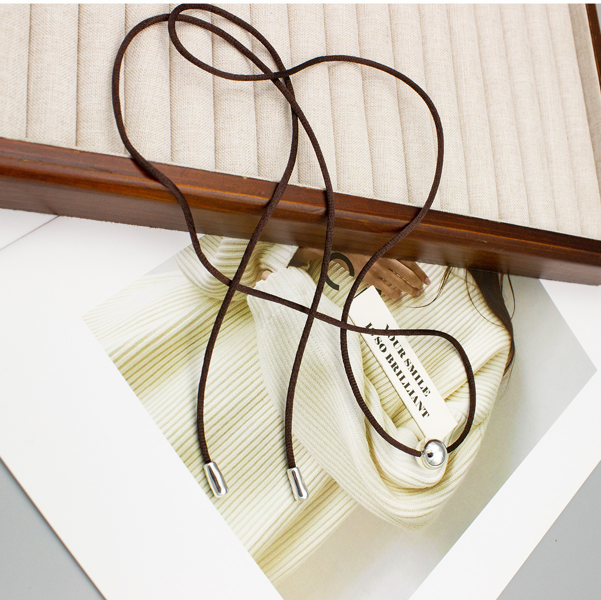 New Chinese Style Silver Ball Brown Rope Necklace Adjustable Cold Wind Small Many Wear French Style Distinctive Brown Rope Clavicle Chain
