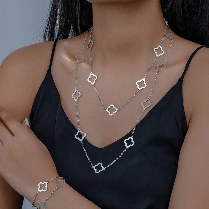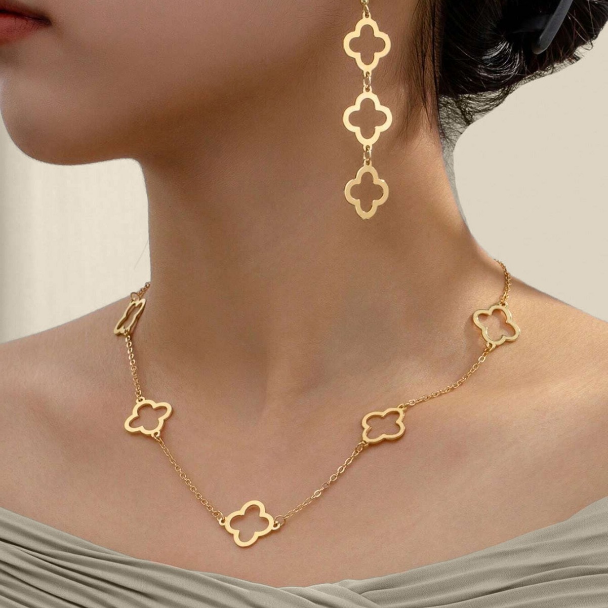 European and American Cross-border Hollow-out Four-leaf Clover Chain Retro Bracelet Necklace suit Women's Light European and American Earrings Golden suit