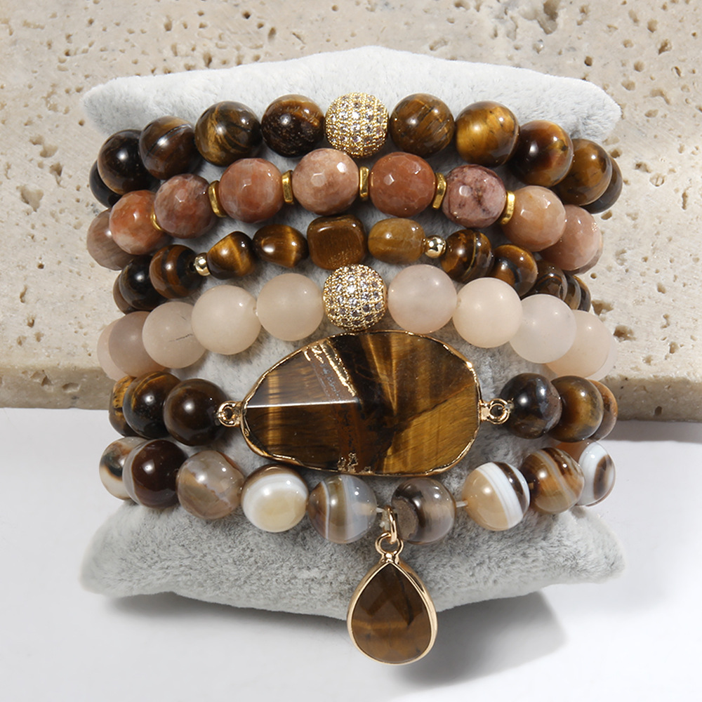 New Fashion Bohemia 6pcs Tiger Eye Natural Stone Glass Handmade Beaded Elastic Stack Bracelet Set for Women