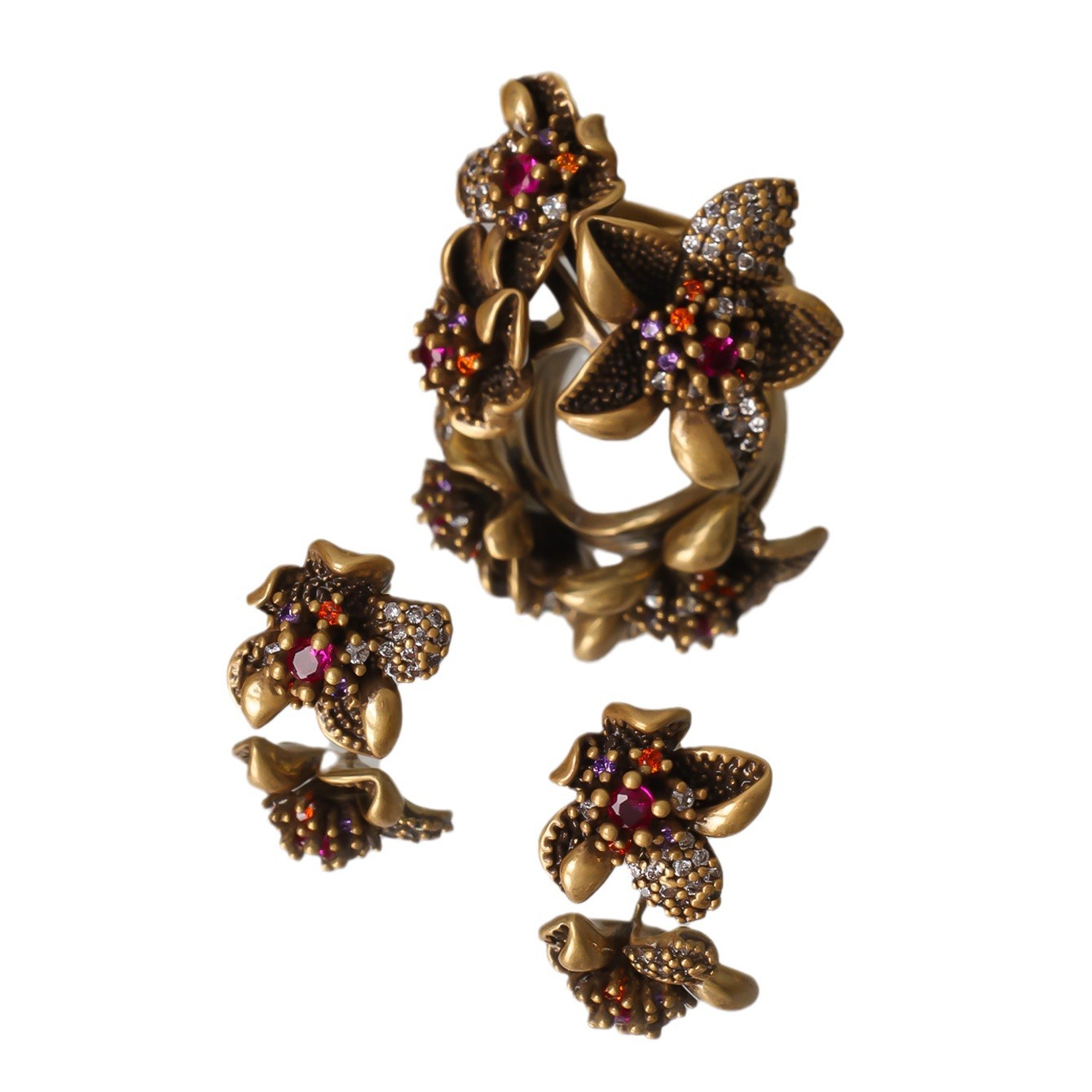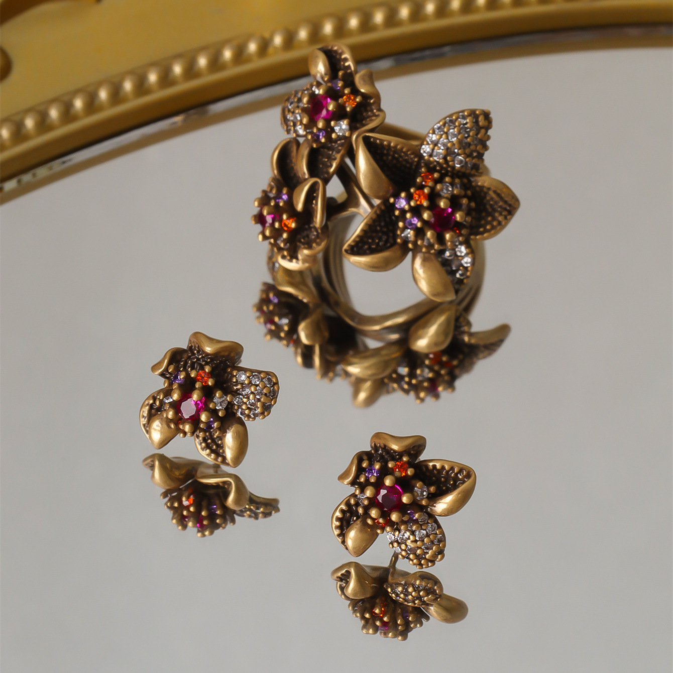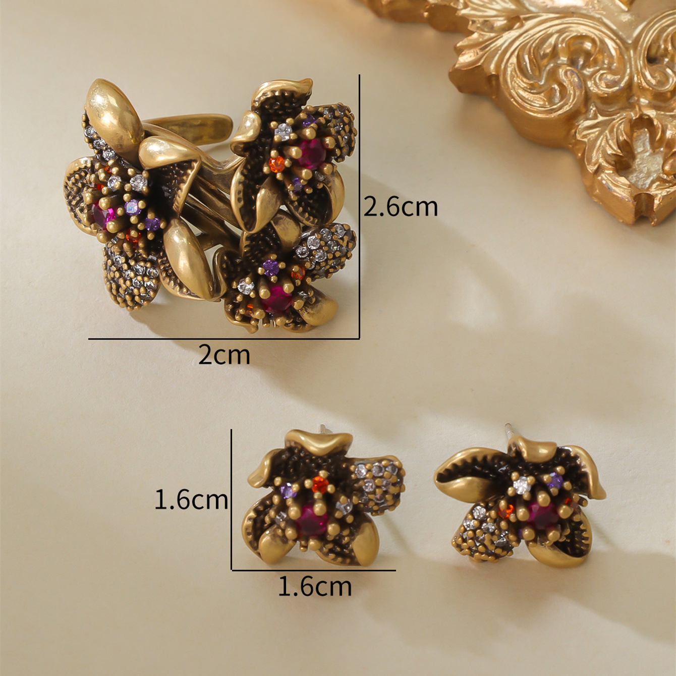 European and American retro distressed multi-bouquet flower stud earrings ring suit flower core color zircon fashion niche ring for women