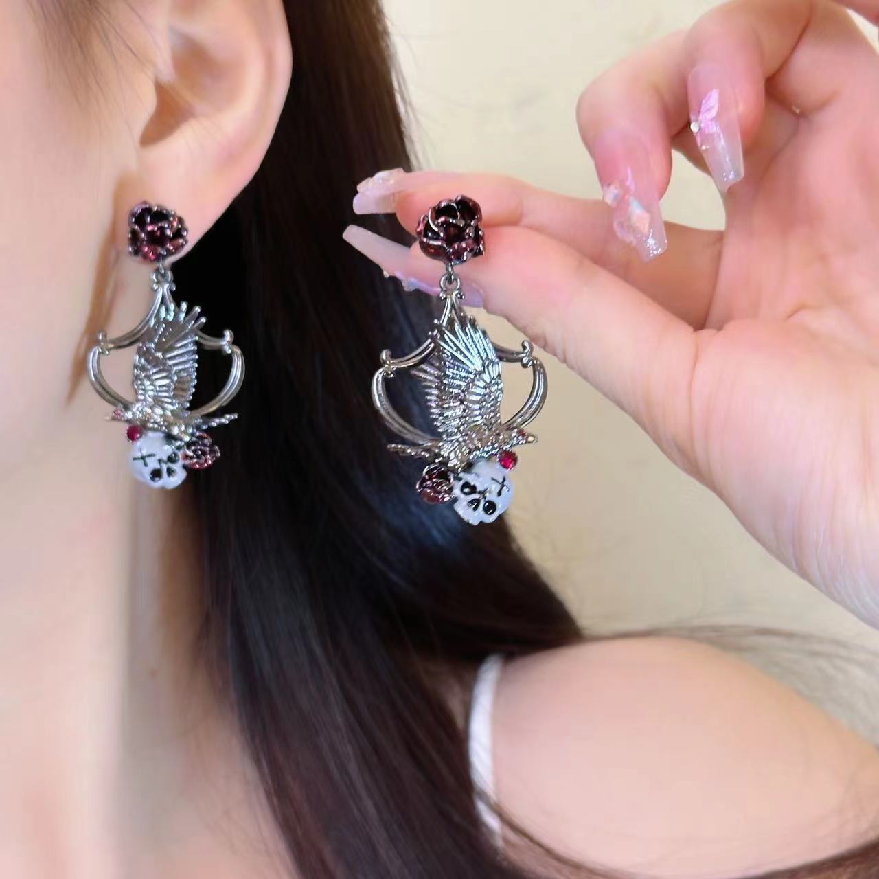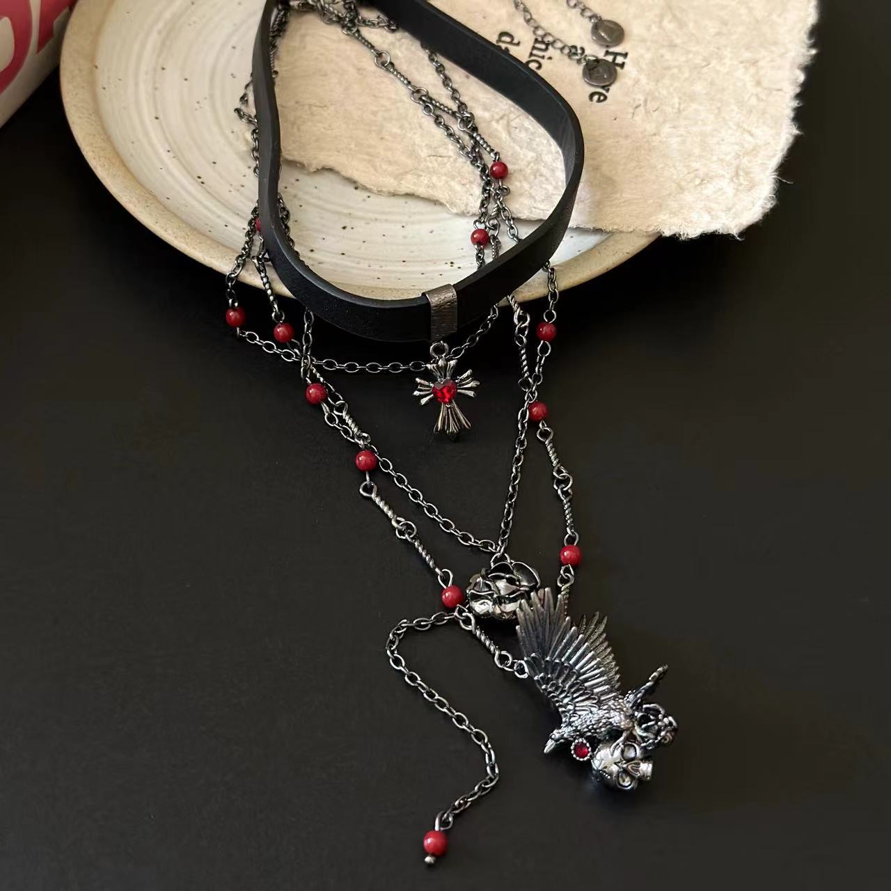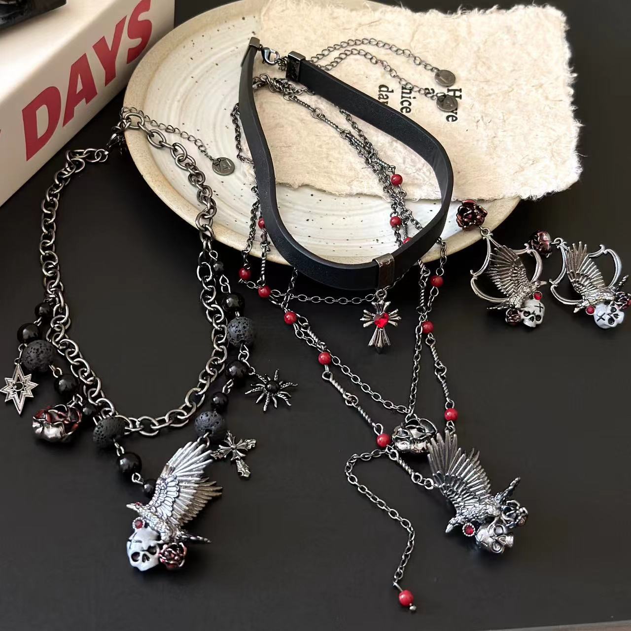 Diablo Sweet Cool Spice Crow Skull Cross Chain Y2K Subculture Leather Collar Earrings Necklace Tide