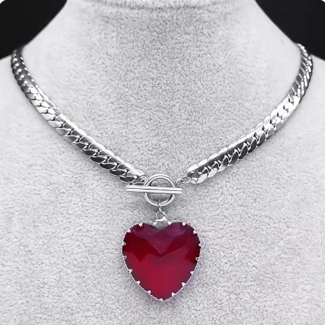 New Cross-Border Gothic Punk Red Heart Necklace Collar Women's Silver Glass Love Pendant Chain Personality