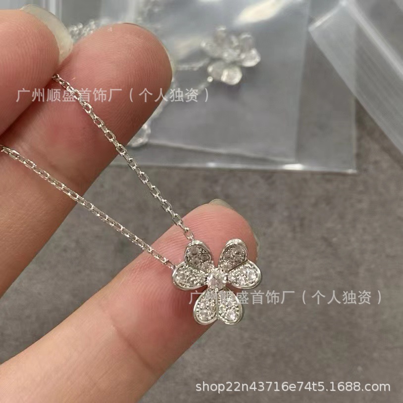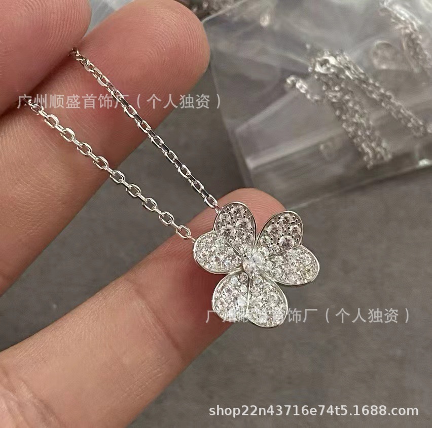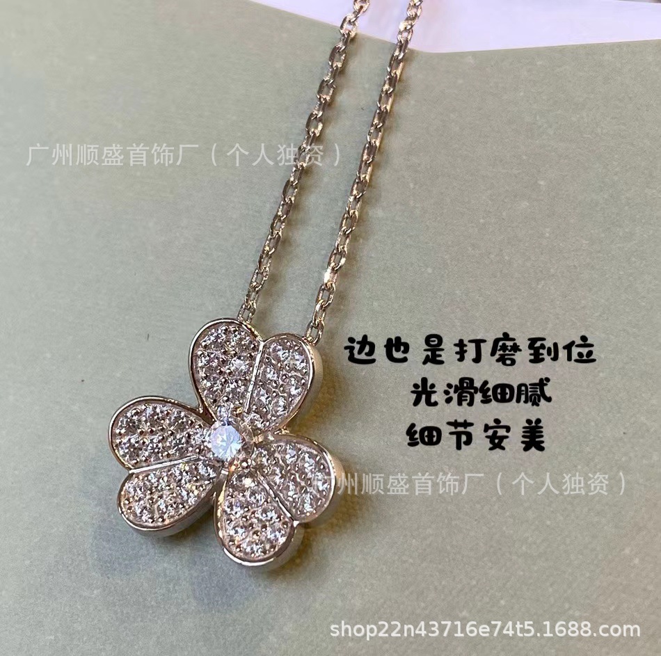 Lucky Clover Sterling Silver Necklace for Women 18K Rose Gold Full Diamond Petal Pendant Clavicle Chain 925 Silver Chain