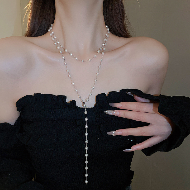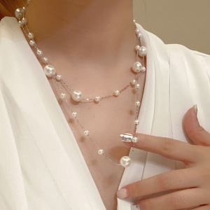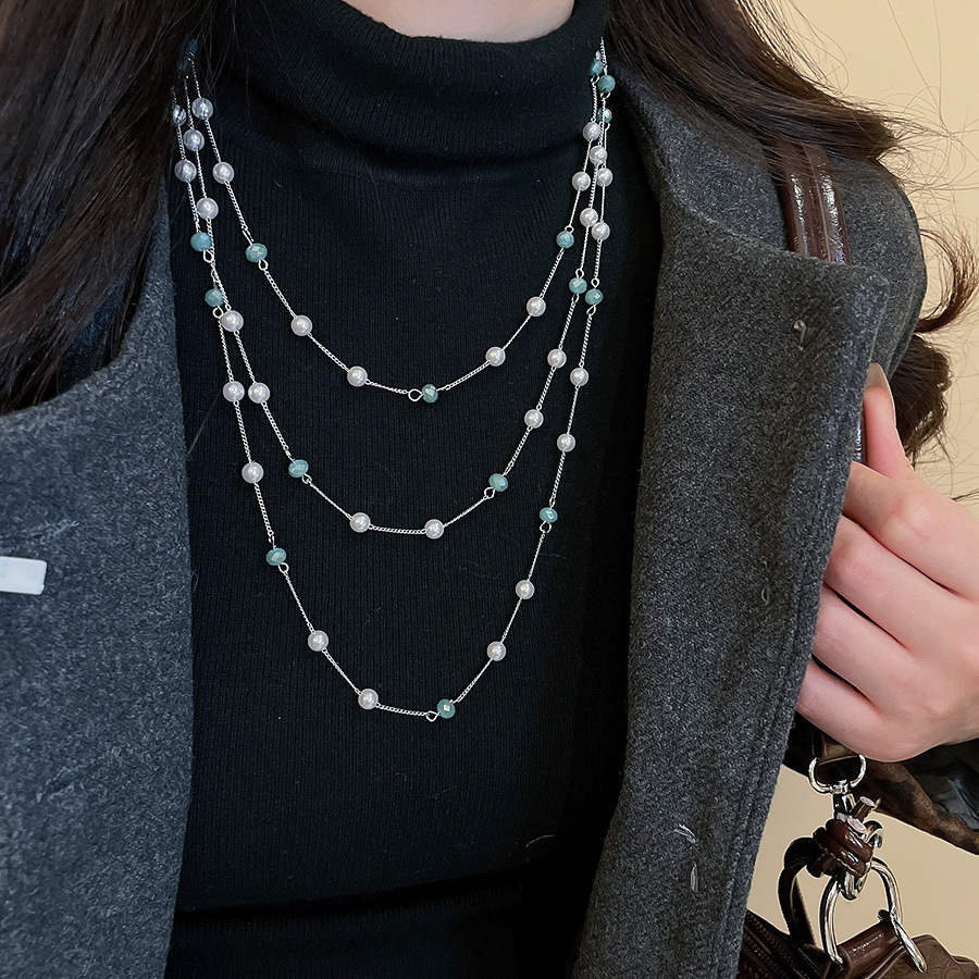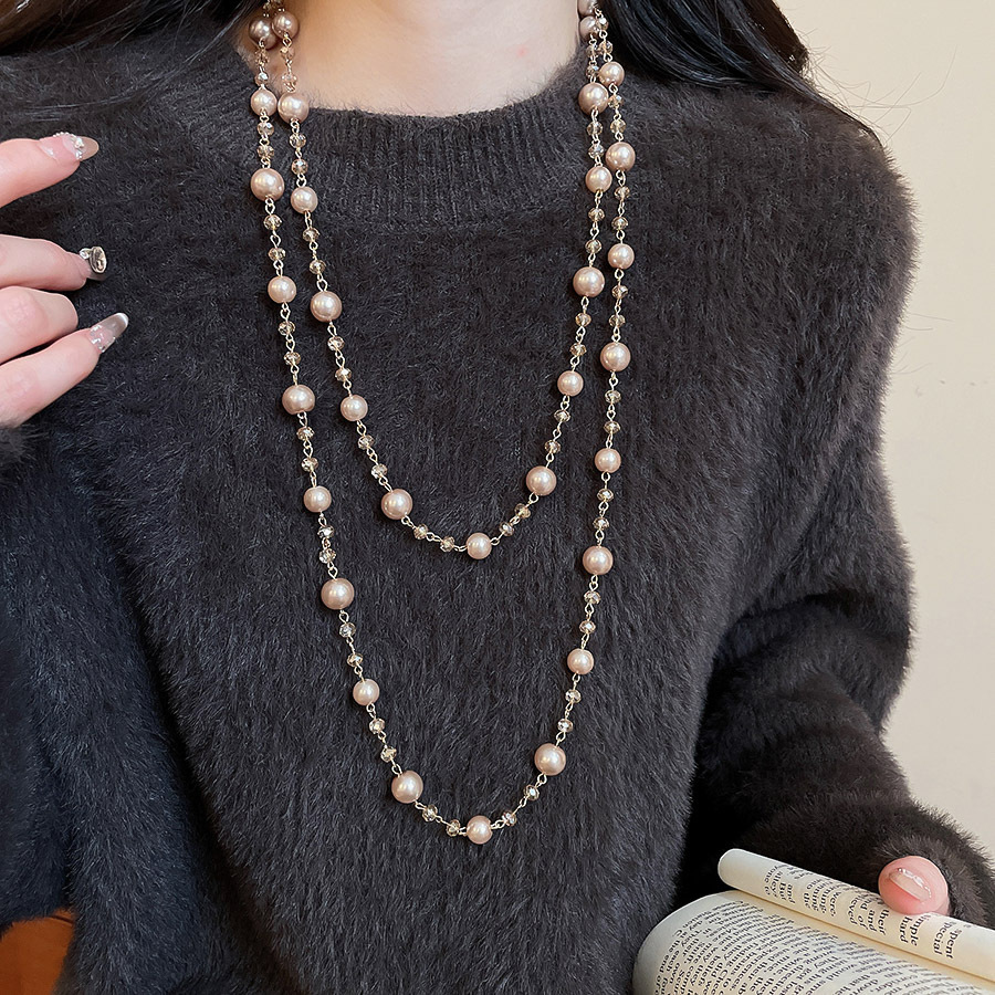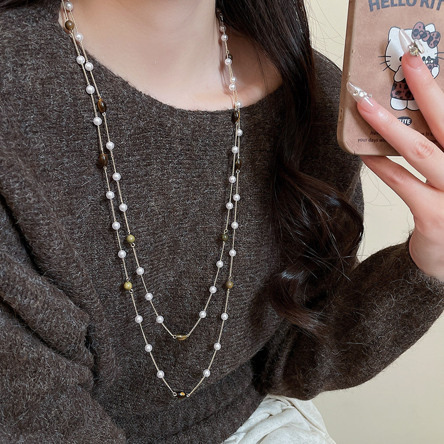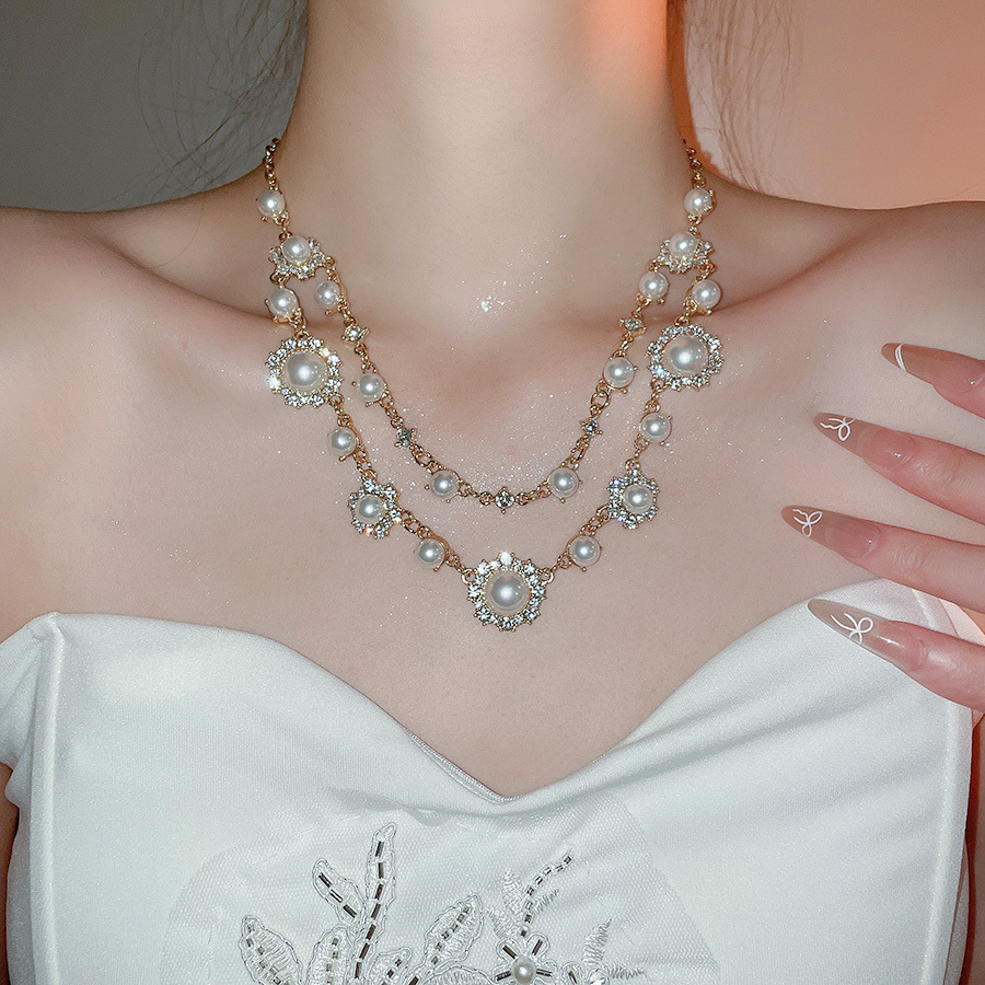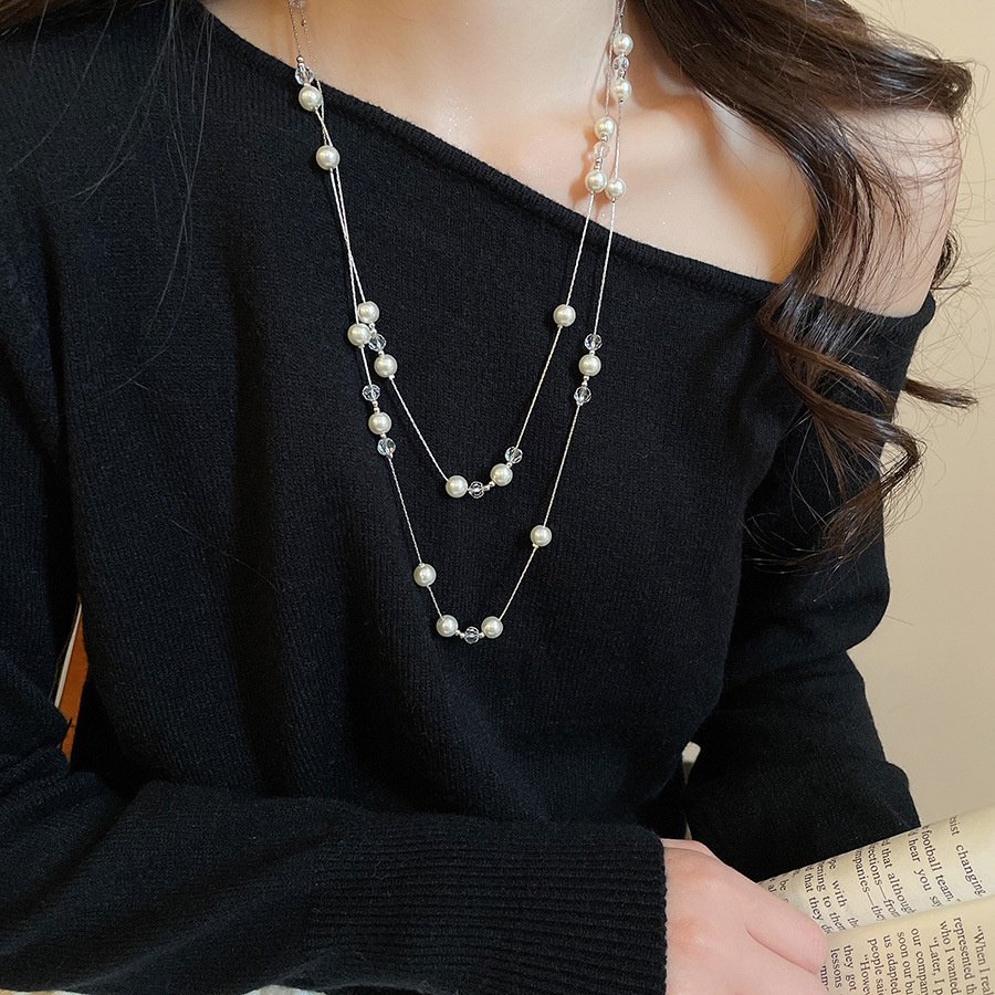 New Artificial Pearl Double Layer Stacked Necklace Cross-border Exquisite Fashion Clavicle Chain French Elegant Light Luxury Woolen Chain
