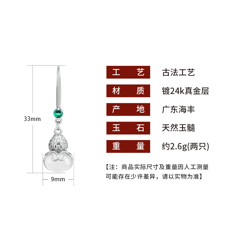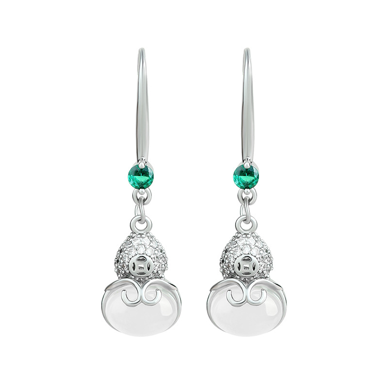 Original Classical Style Natural Ice White Chalcedony Ear Hook Women's Earrings Good Luck Hollow Gourd Temperament High-grade Earrings