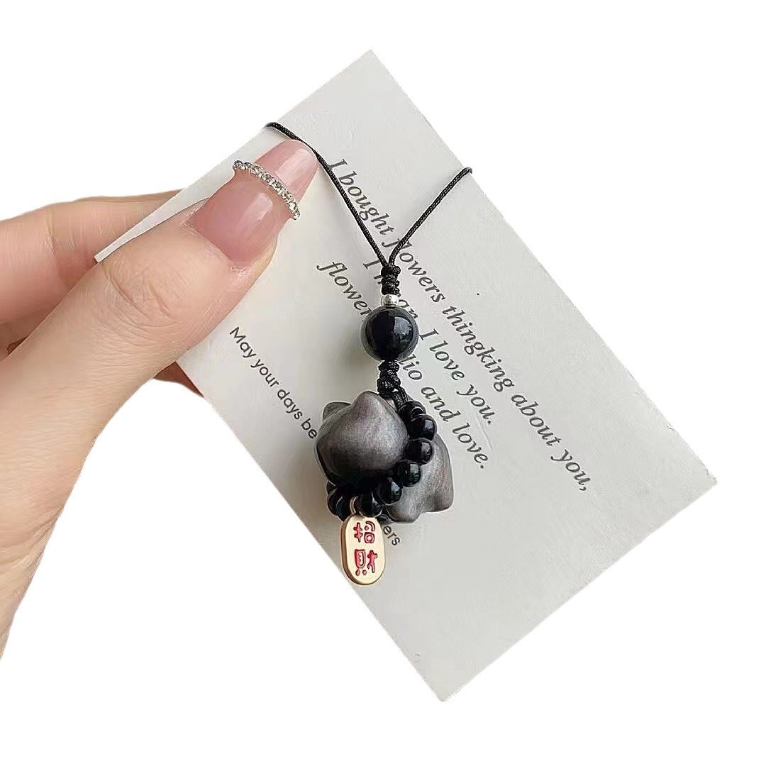 Silver Obsidian Cat Mobile Phone Pendant DIY Accessories Natural Silver Obsidian Personality Creative Bag Pendant Keychain Mobile Phone Chain