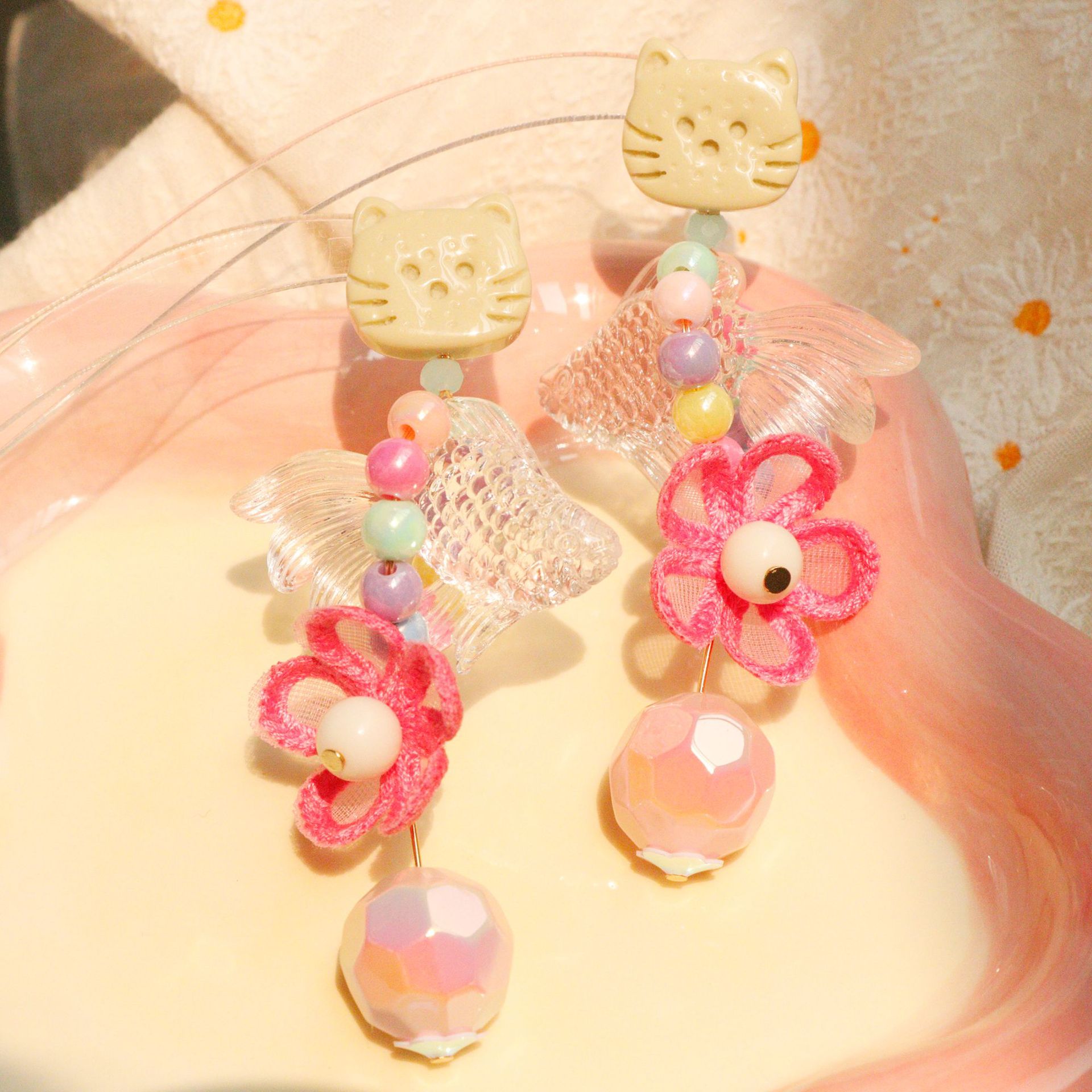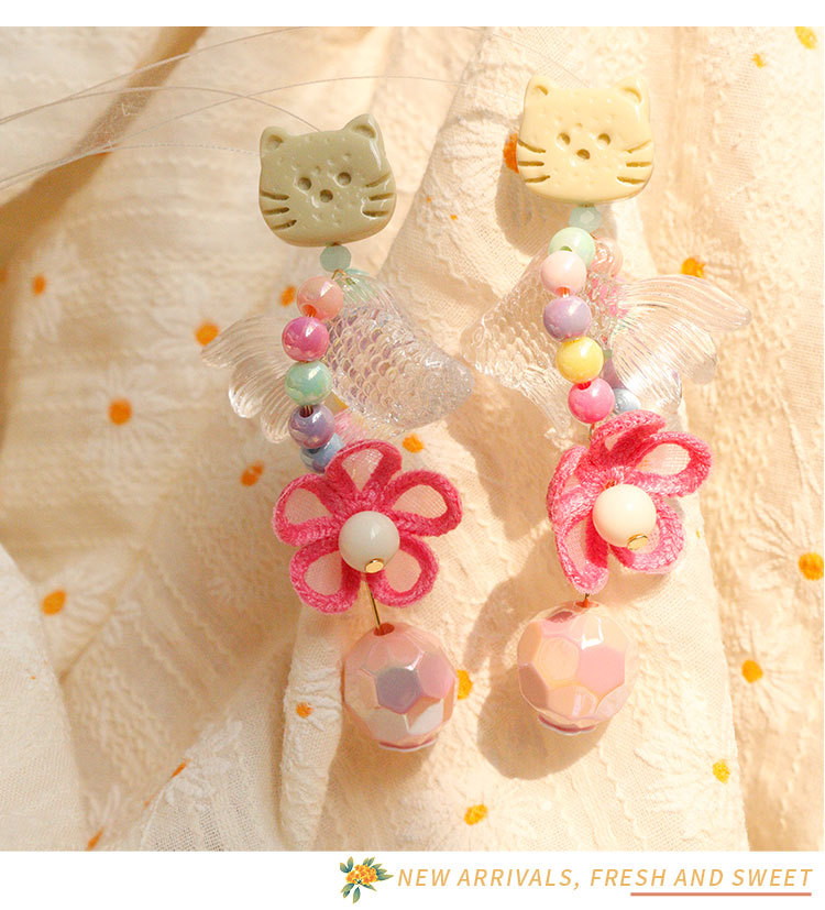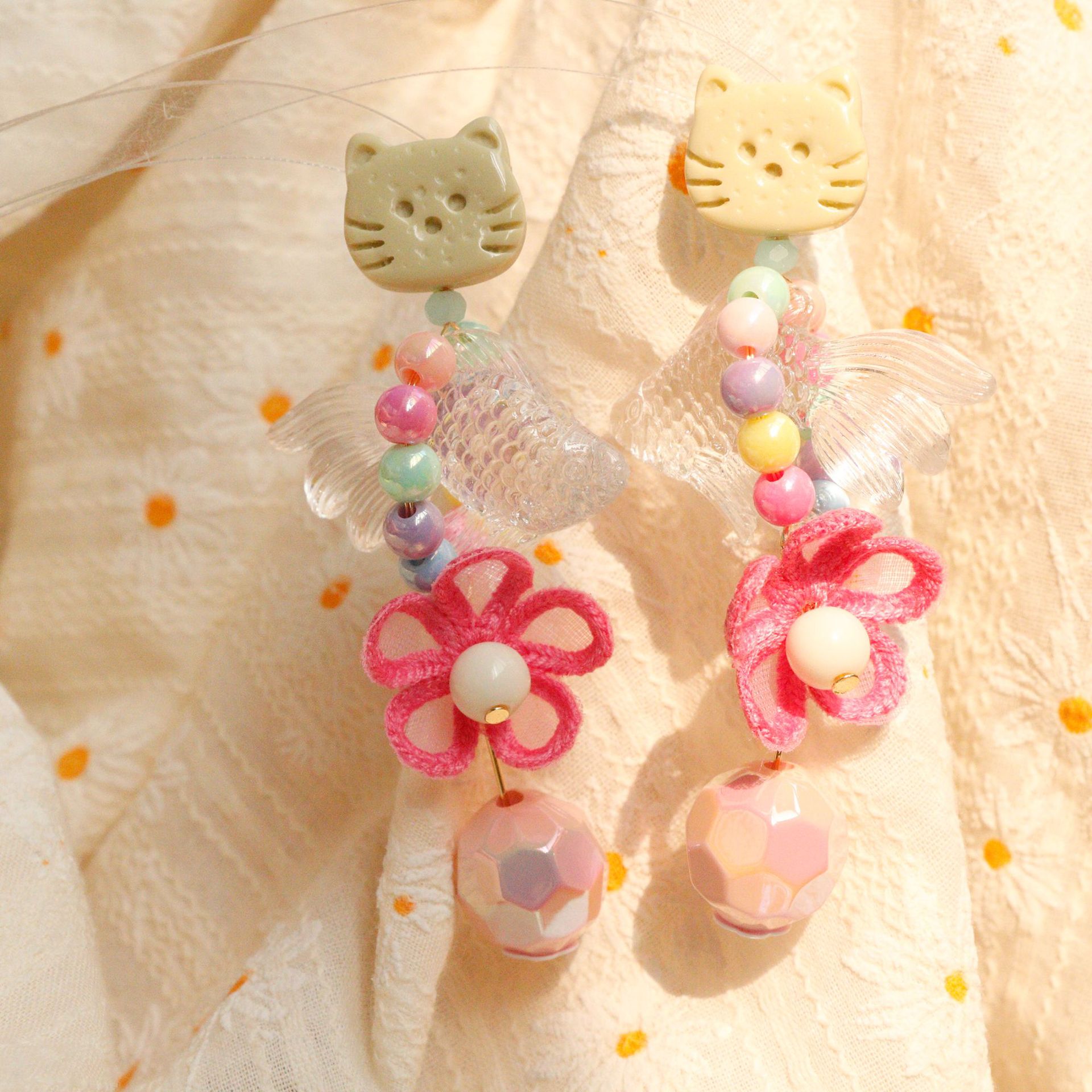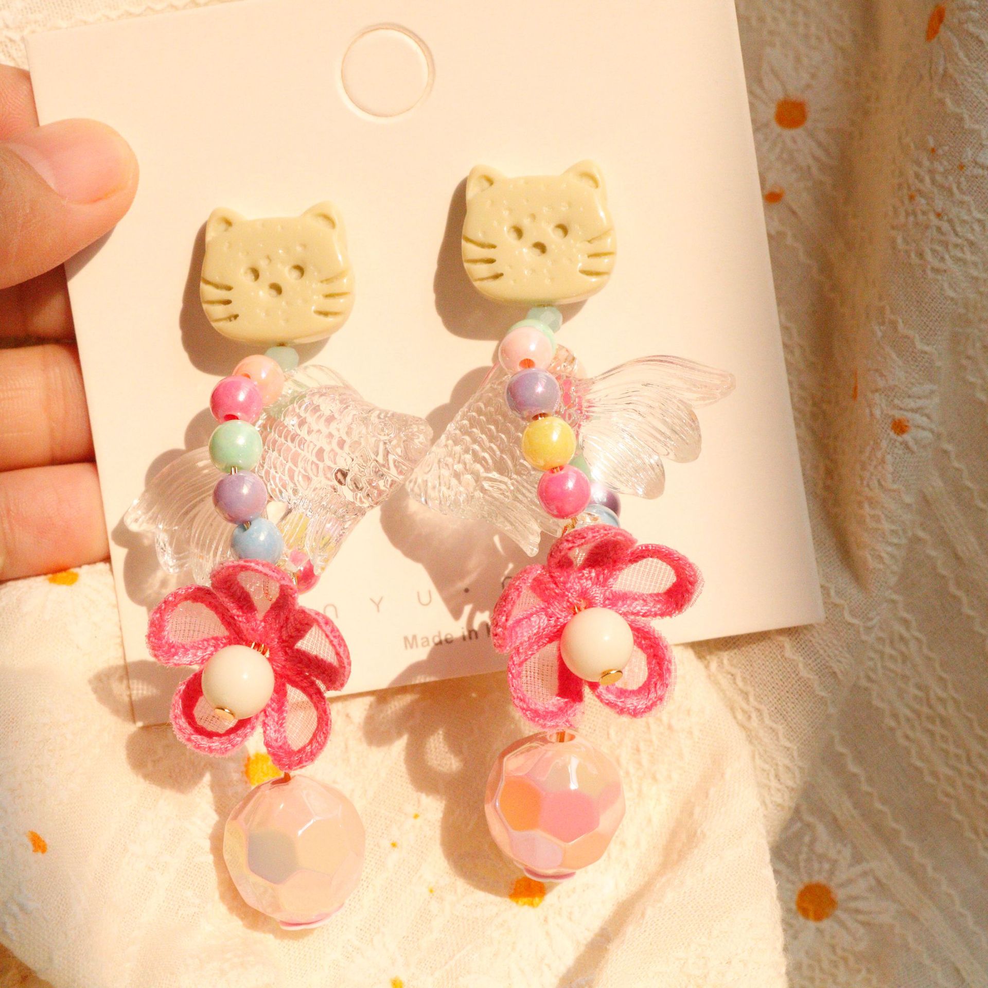 Japanese Showa Style Girl's Heart Cute Cat Colorful Beaded Flower Flower Fish Long Holiday Earrings Earrings Jewelry