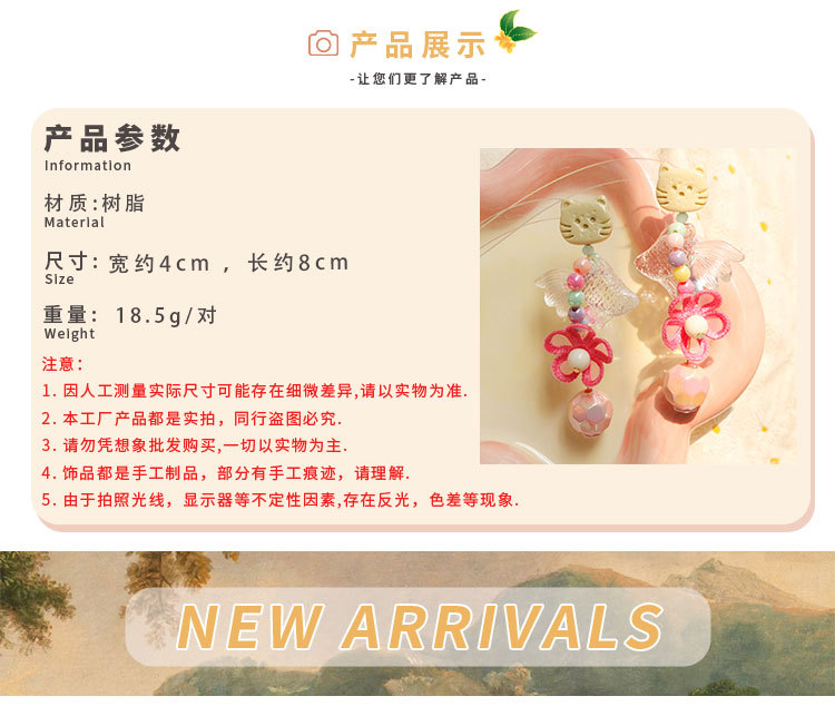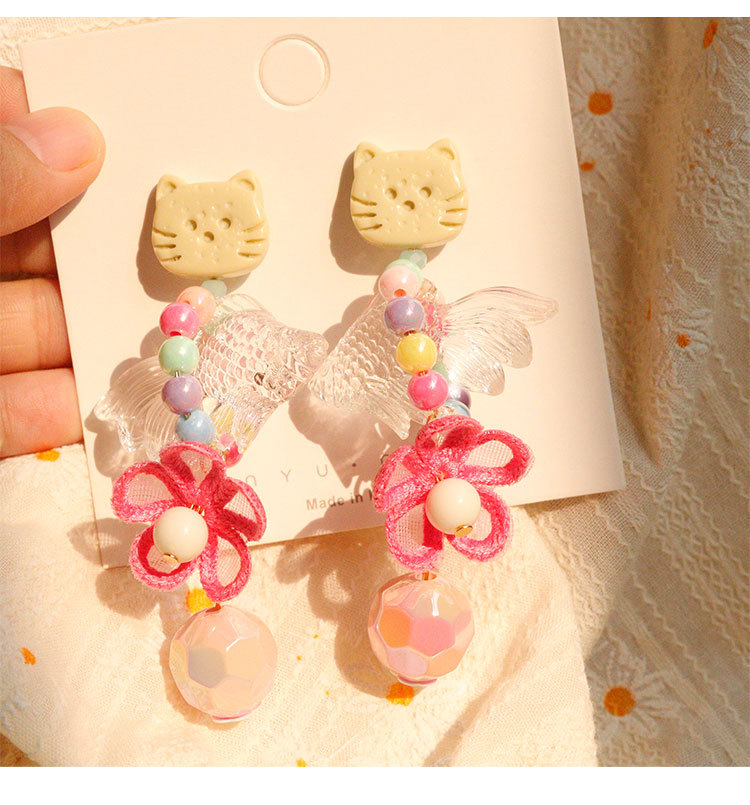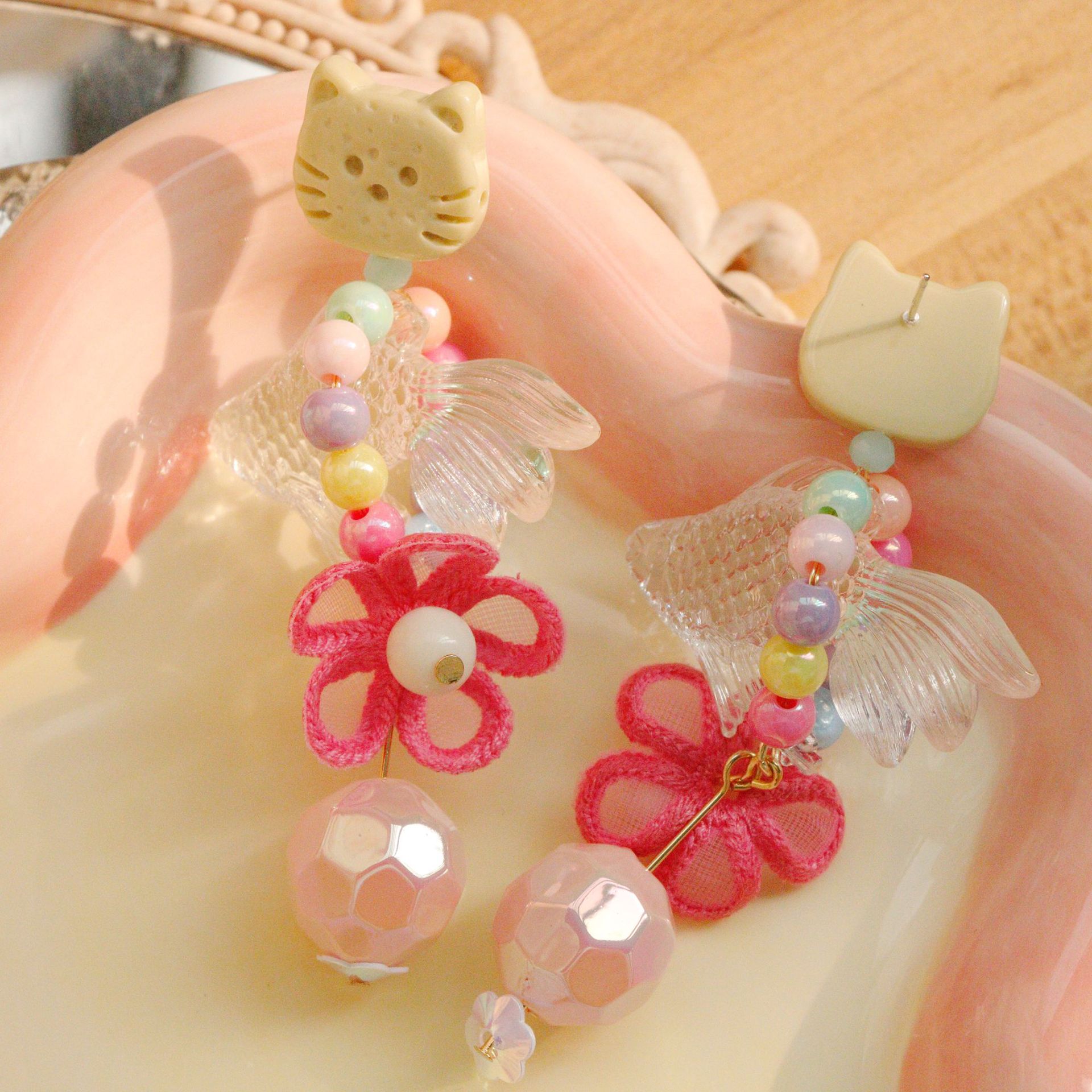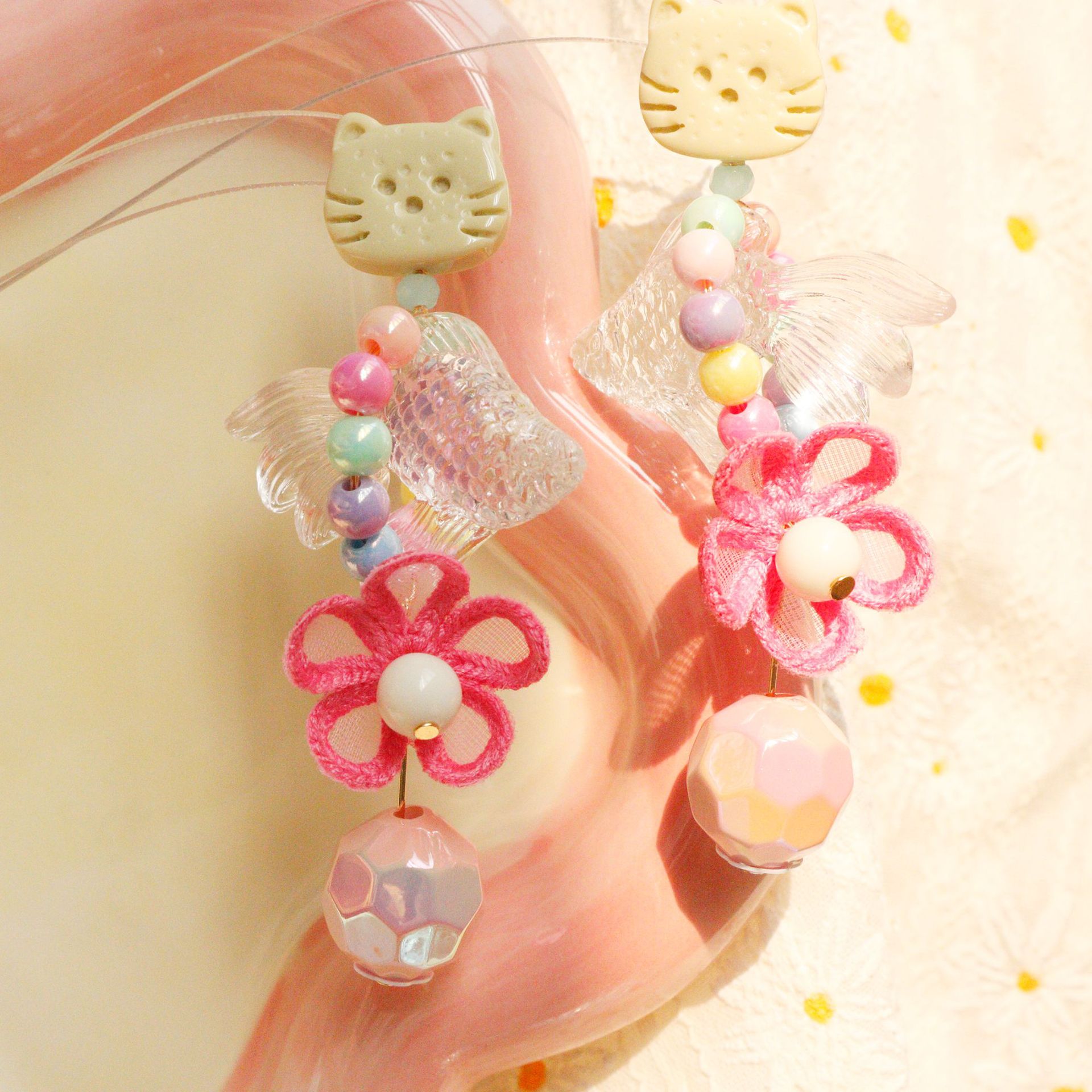 Japanese Showa Style Girl's Heart Cute Cat Colorful Beaded Flower Flower Fish Long Holiday Earrings Earrings Jewelry