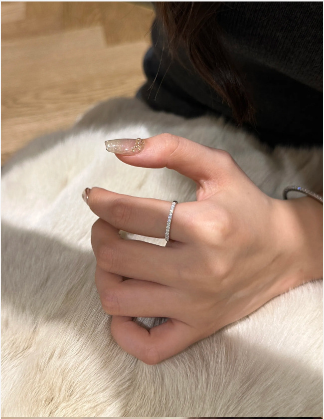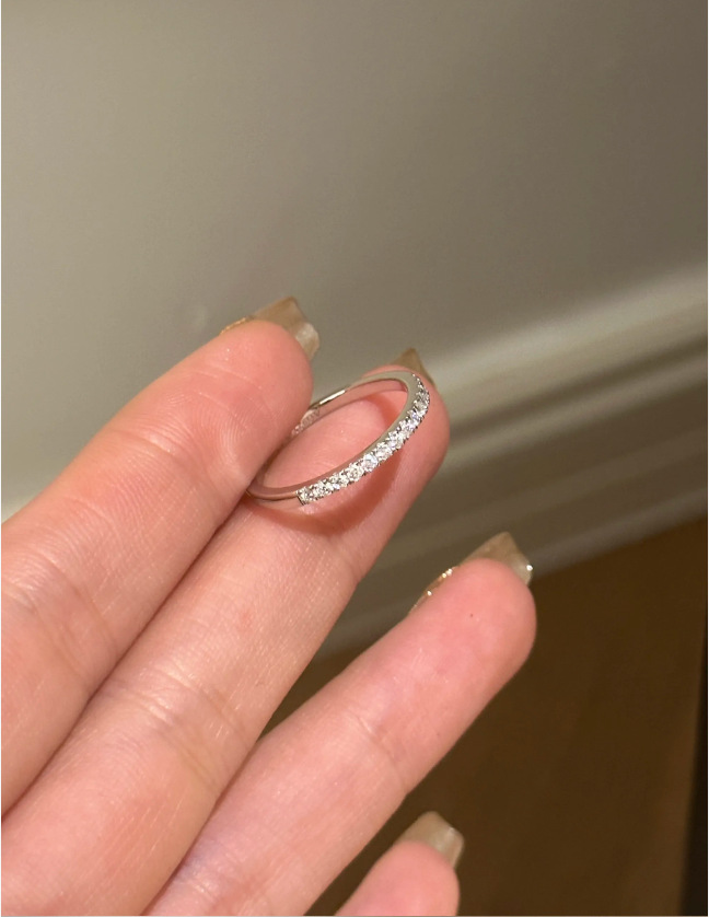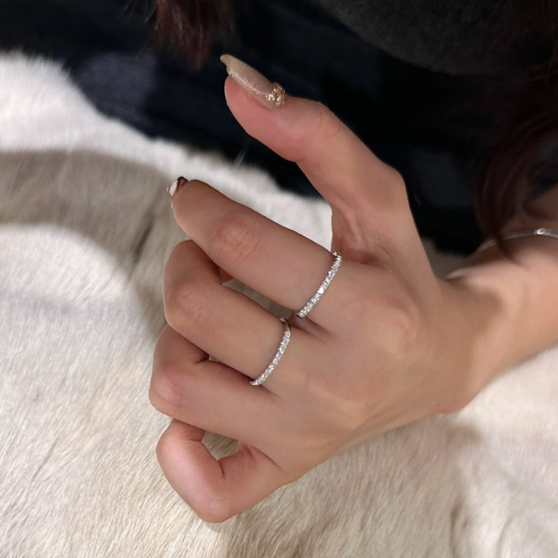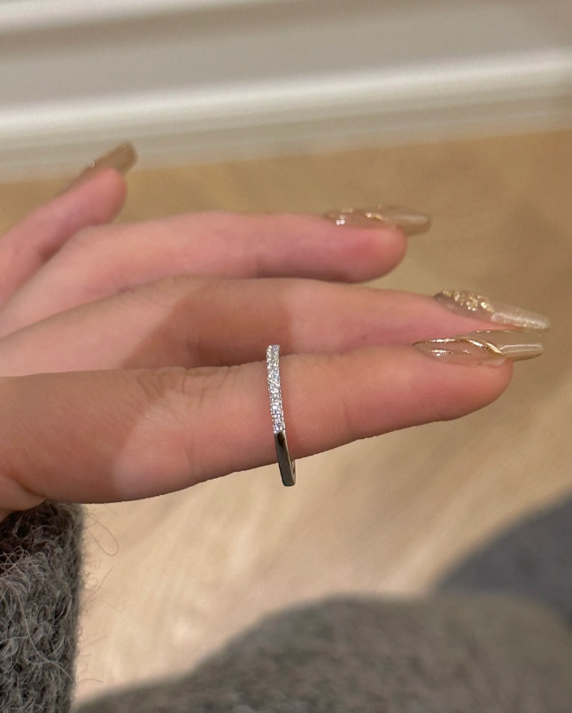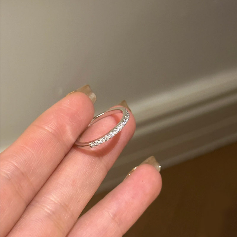 Teach S925 Sterling Silver Niche Half-Diamond and Half-Plain Very Fine Ring for Women with Flash Zirconium All-Match Stacked Instagram Beauty Ring