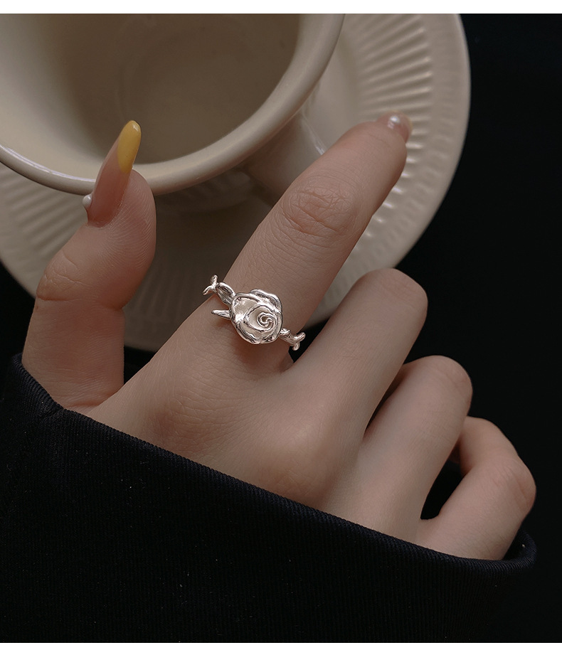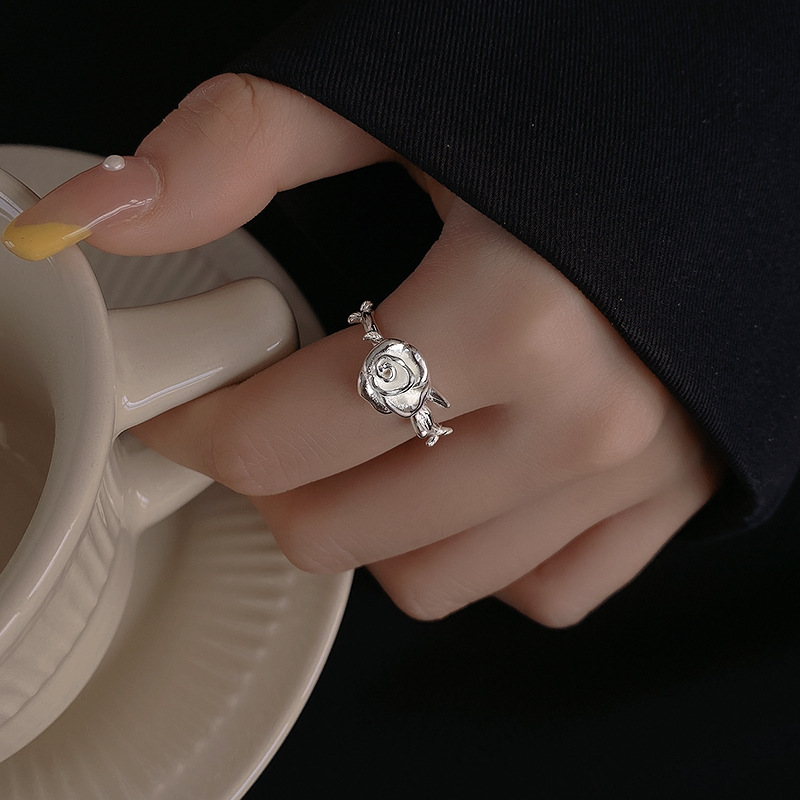 Niche Design Thai Silver Finger Ring Fashion Rose Ring Unique Flower Opening Alloy Finger Ring Women