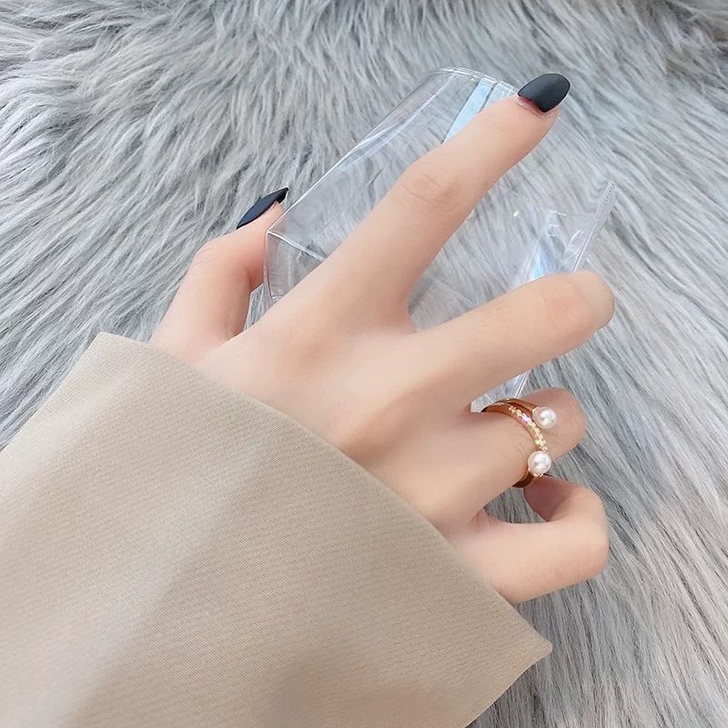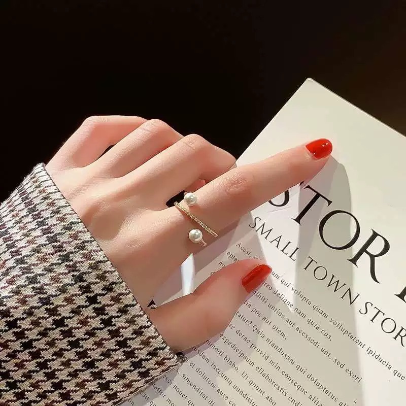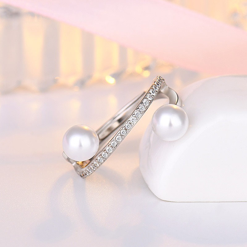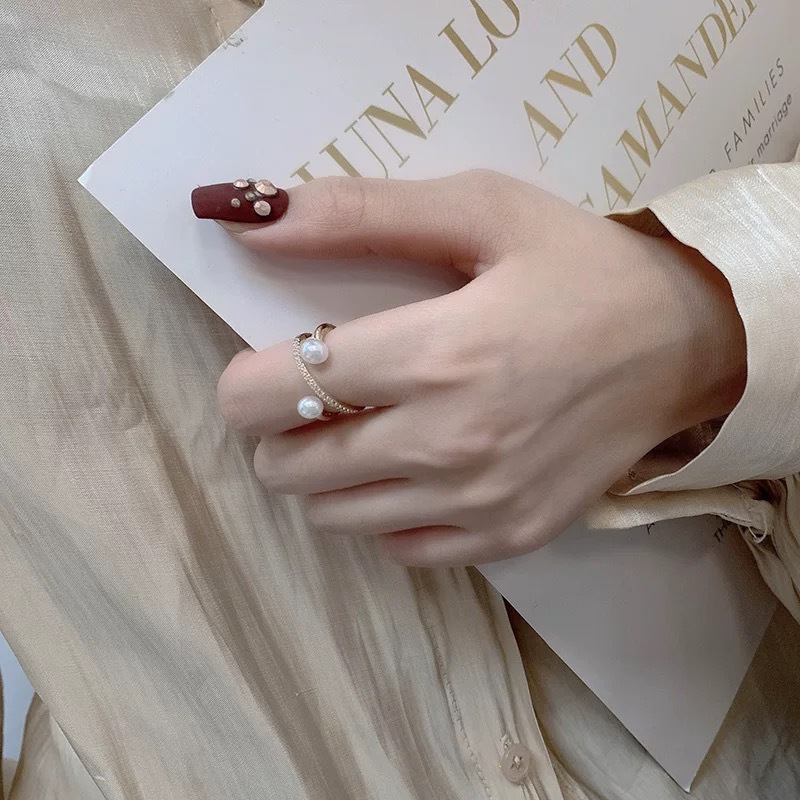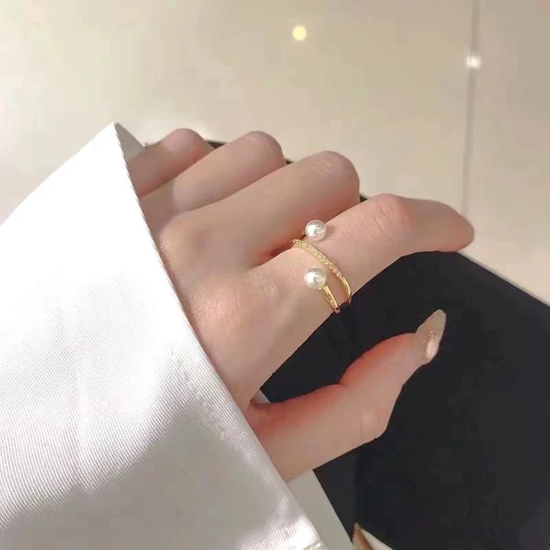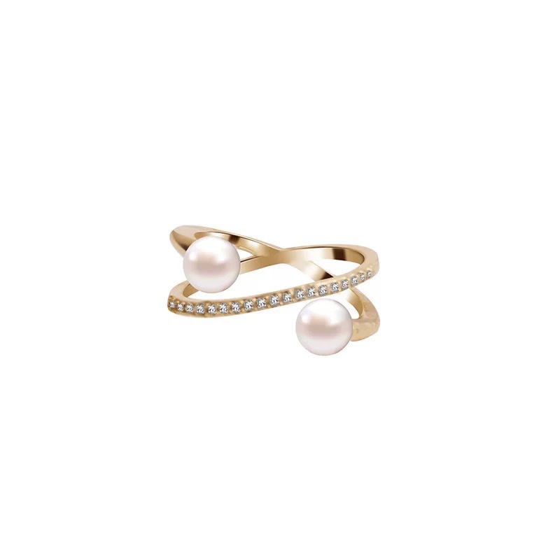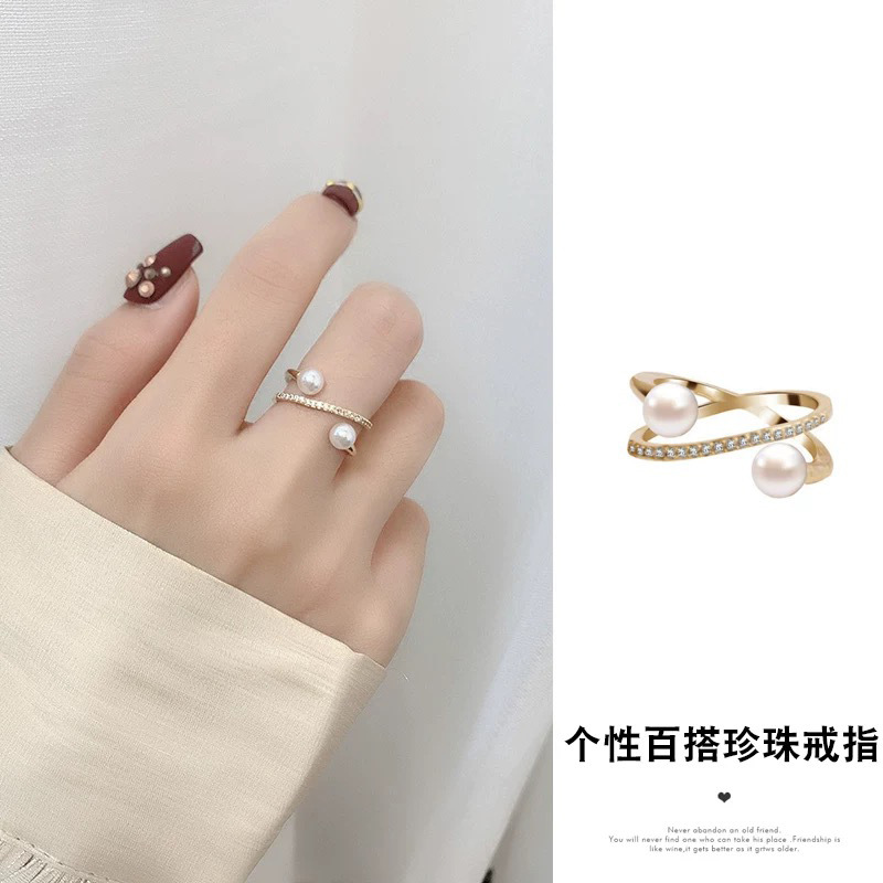 Double-layer Cross Pearl and Diamond Food Finger Ring Fashionable Simple Personality Ring Women's Instagram Popular Online Fashion Elegant Finger Ring