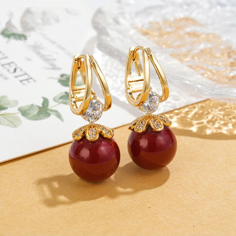 Retro High-grade wine red Pearl Ear Buckle New Style Temperament Unique Daily Fashion All-match Diamond Earrings Earrings