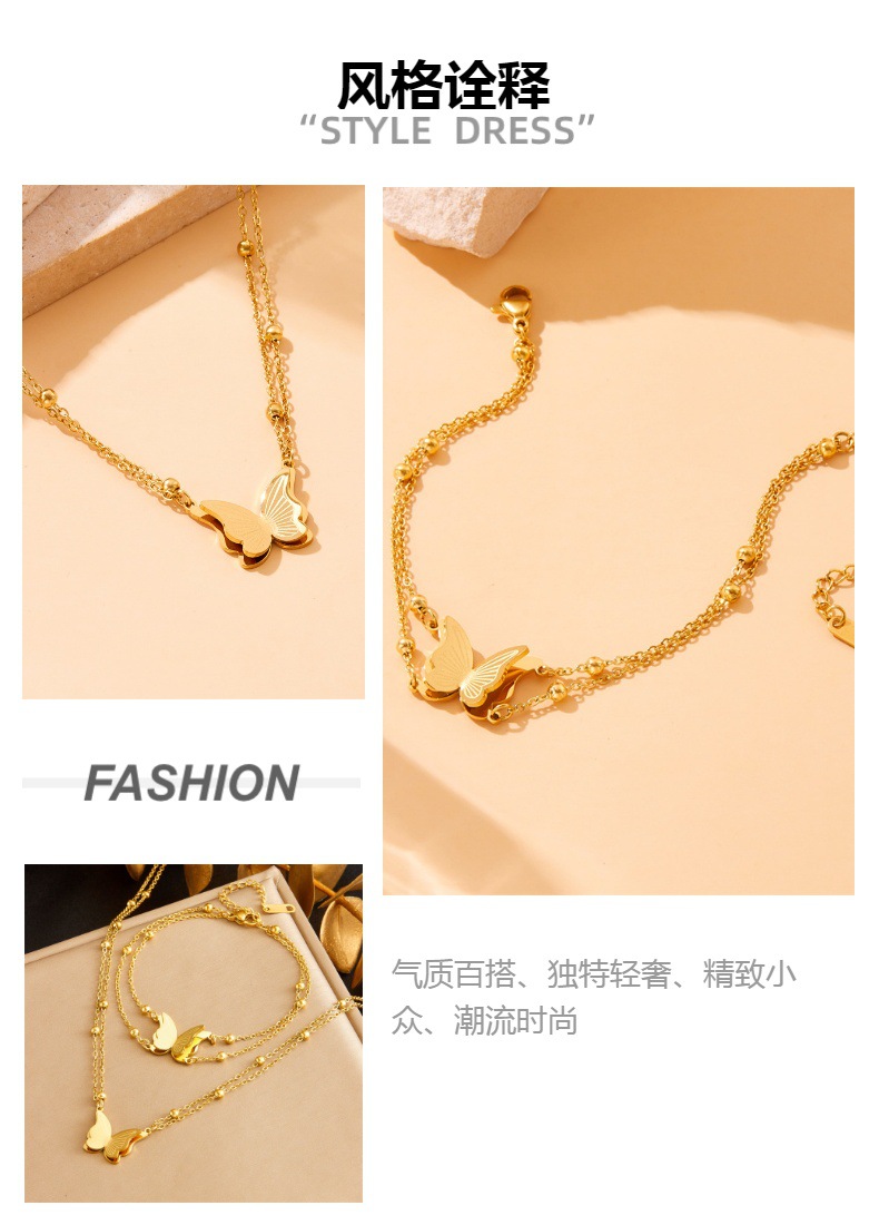 Cross-border Hot Selling Stainless Steel Butterfly Double Beaded Necklace Bracelet suit Fashion Titanium Steel Color-free Butterfly suit