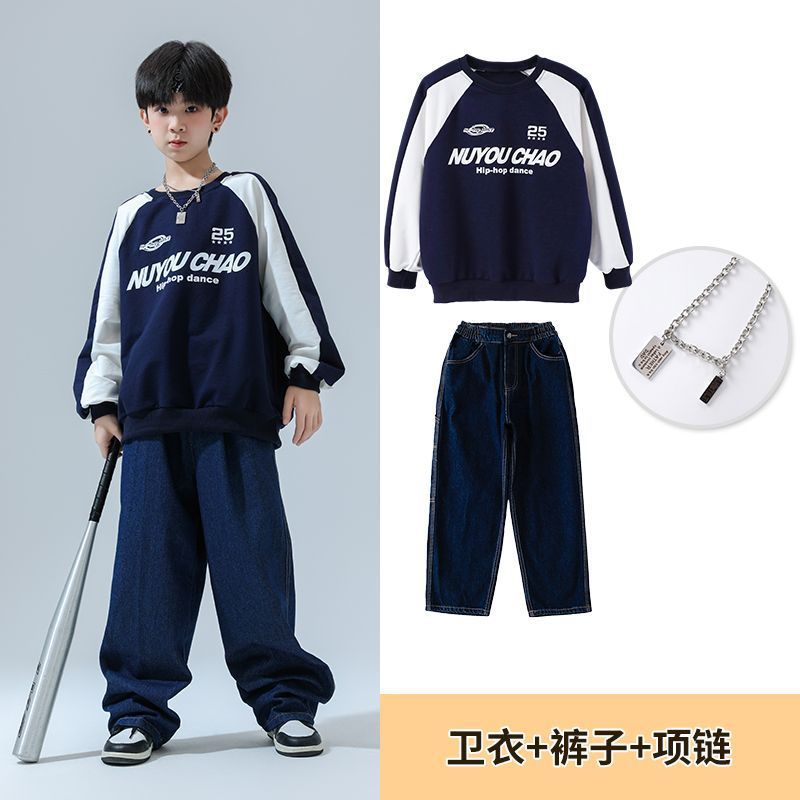 Color: 820 navy blue sweatshirt + 810 dark blue denim trousers + necklace