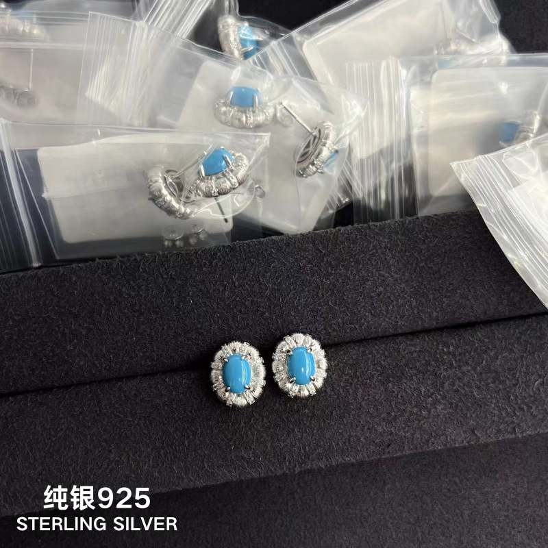 Sterling Silver S925 New Chinese Oval Brushed Turquoise Earrings Necklace Pigeon Egg High Sense Blue Pine Vintage suit