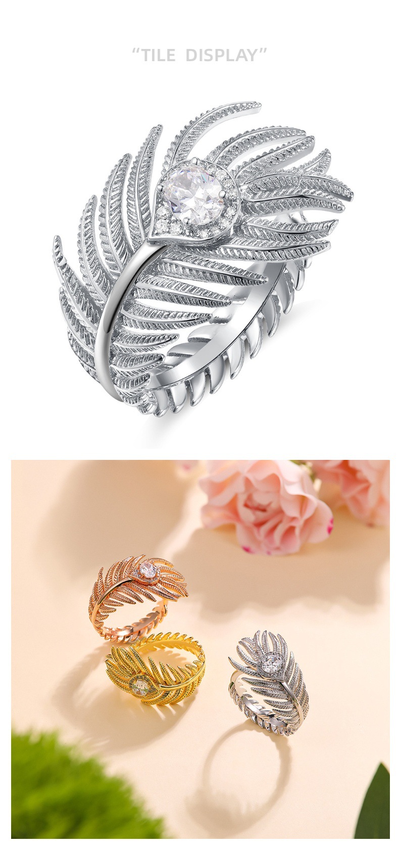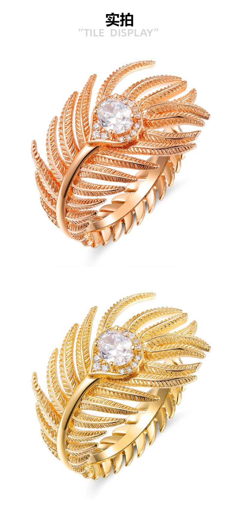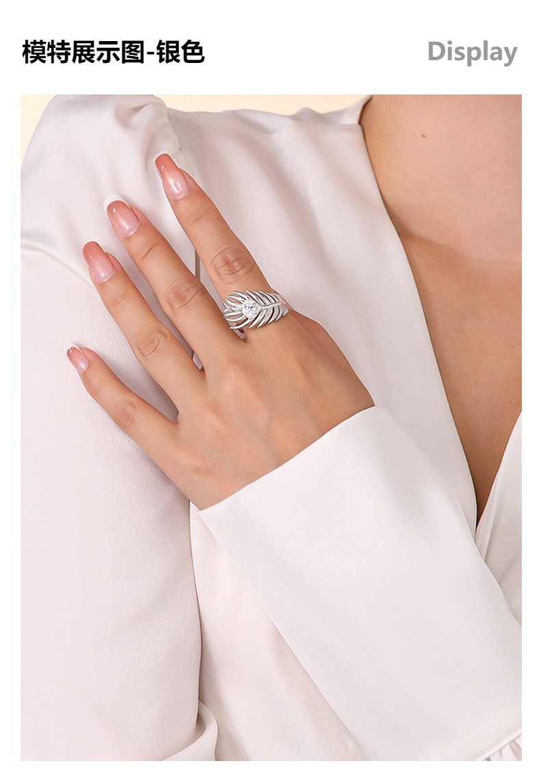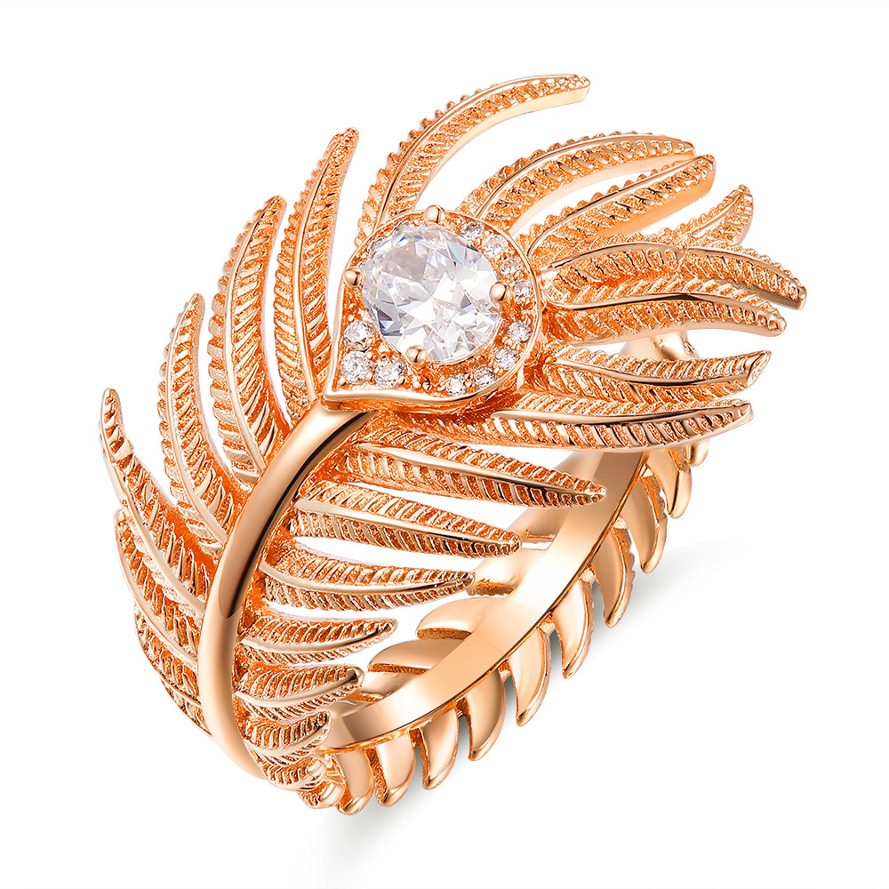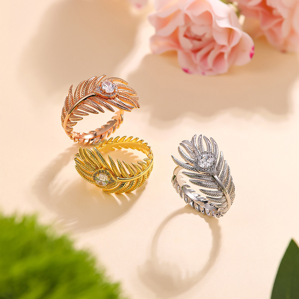 Europe and the United States cross-border 5A zircon feather ring women's luxury high-grade gold and silver rose gold tricolor open ring wholesale