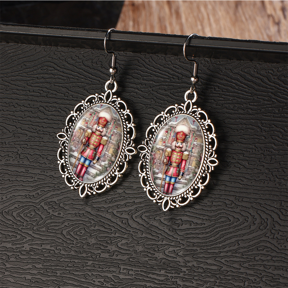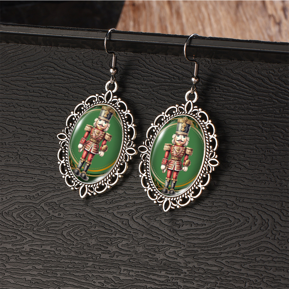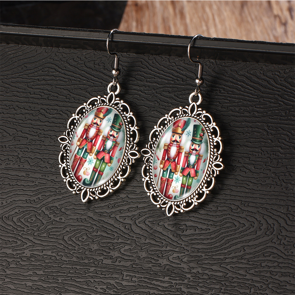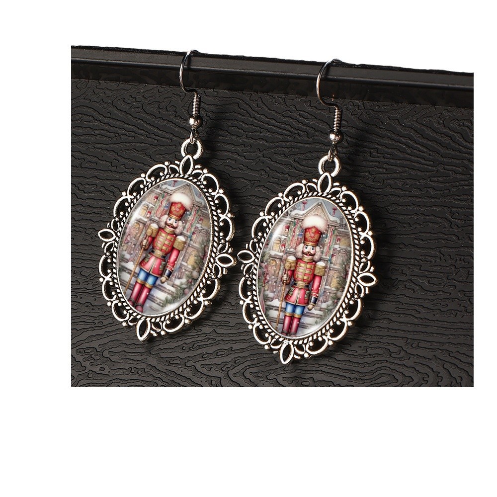 Cross Border Christmas Stainless Steel Ear Hook Oval Lace Earrings Christmas Nutcracker Earrings Christmas Soldier Earrings