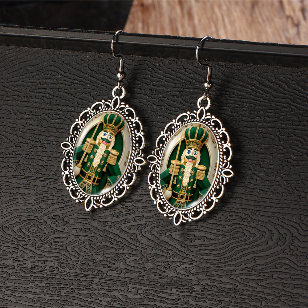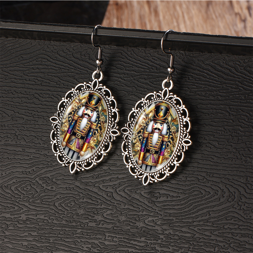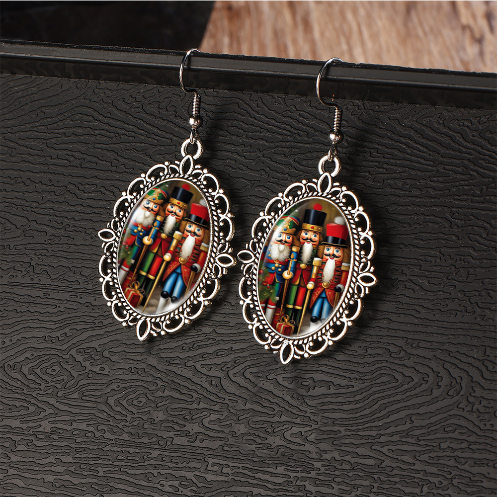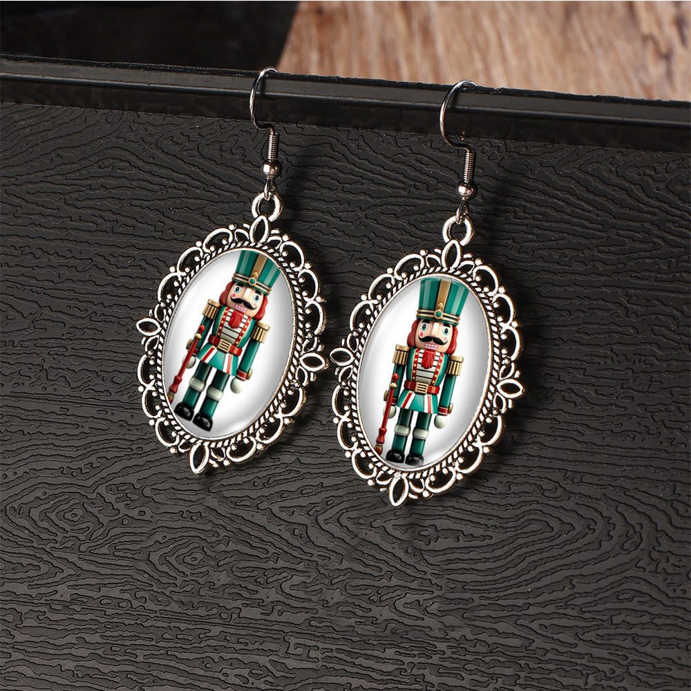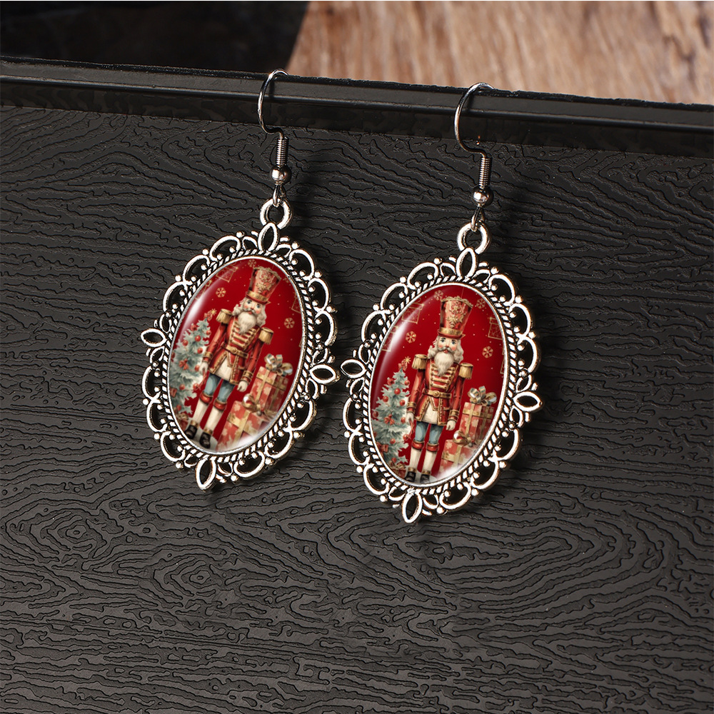 Cross Border Christmas Stainless Steel Ear Hook Oval Lace Earrings Christmas Nutcracker Earrings Christmas Soldier Earrings