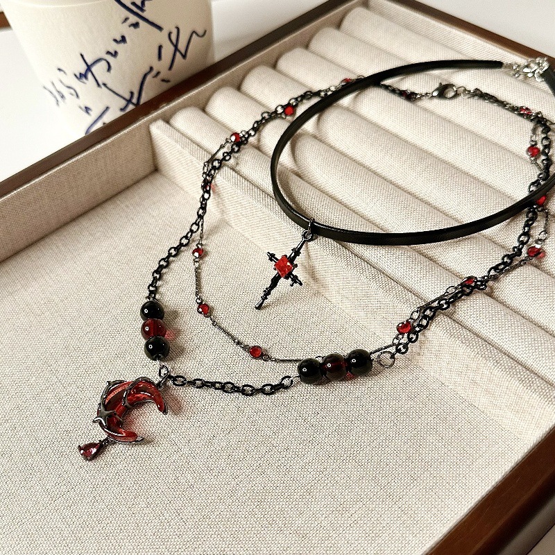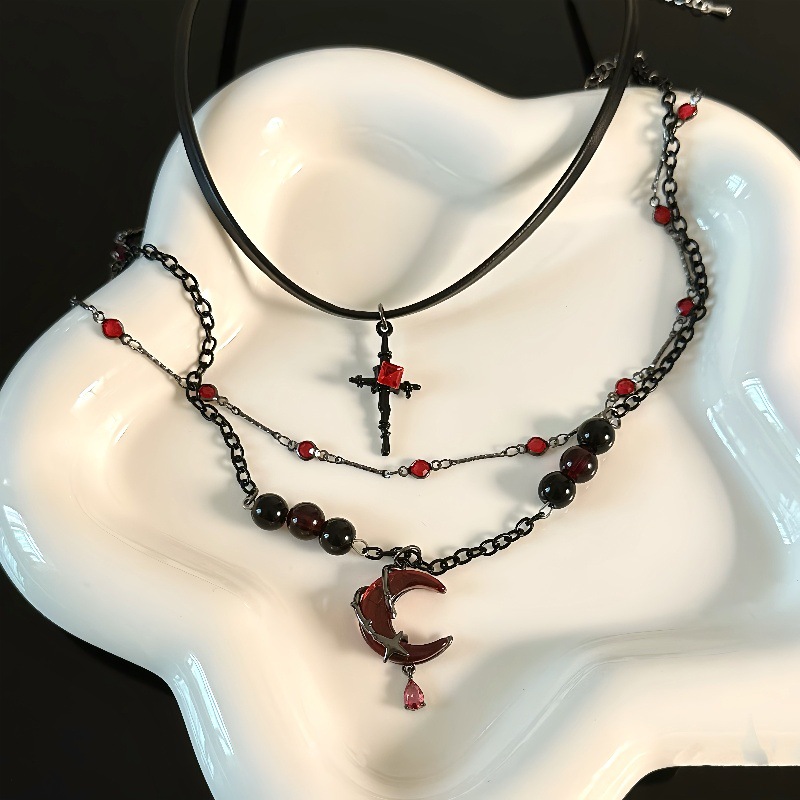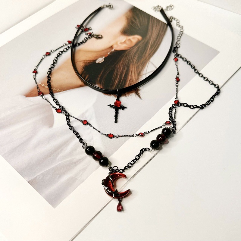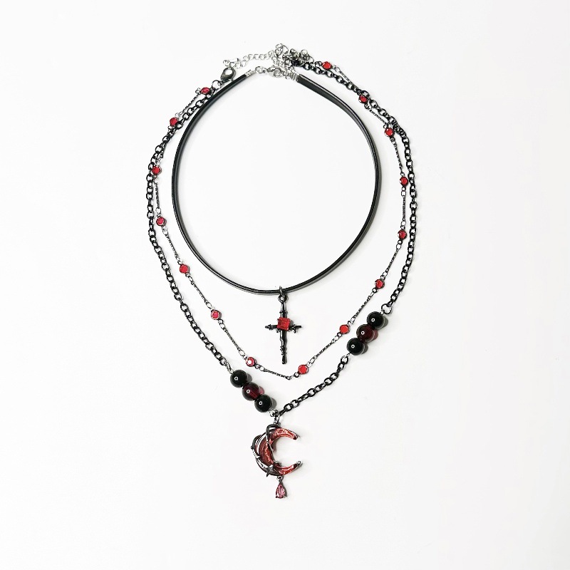 Diablo Gothic Cross Red Moon Pendant Necklace Y2K Spice Beaded Leather Choker Clavicle Chain